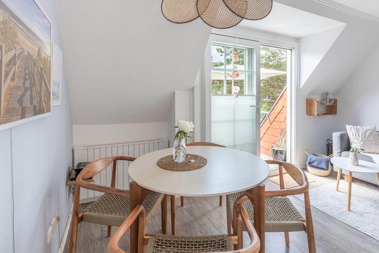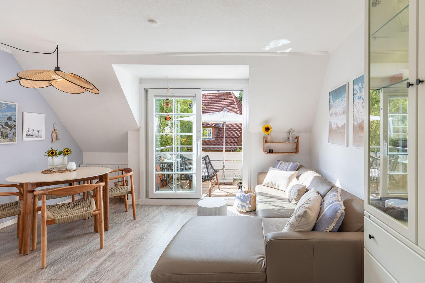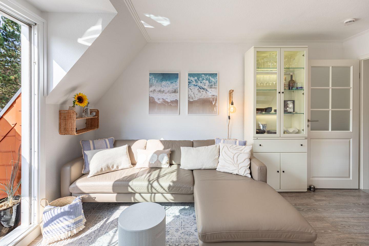 Im Wohnraum befinden sich ein gemütliches Sofa, zwei bequeme Sessel mit Couchtisch, eine Essecke, Flachbild-TV (Kabelfernsehen), Blu-Ray Player, sowie eine kleine Musikanlage. Ein WLAN Zugang steht Ihnen kostenfrei zur Verfügung (ohne Gewähr).