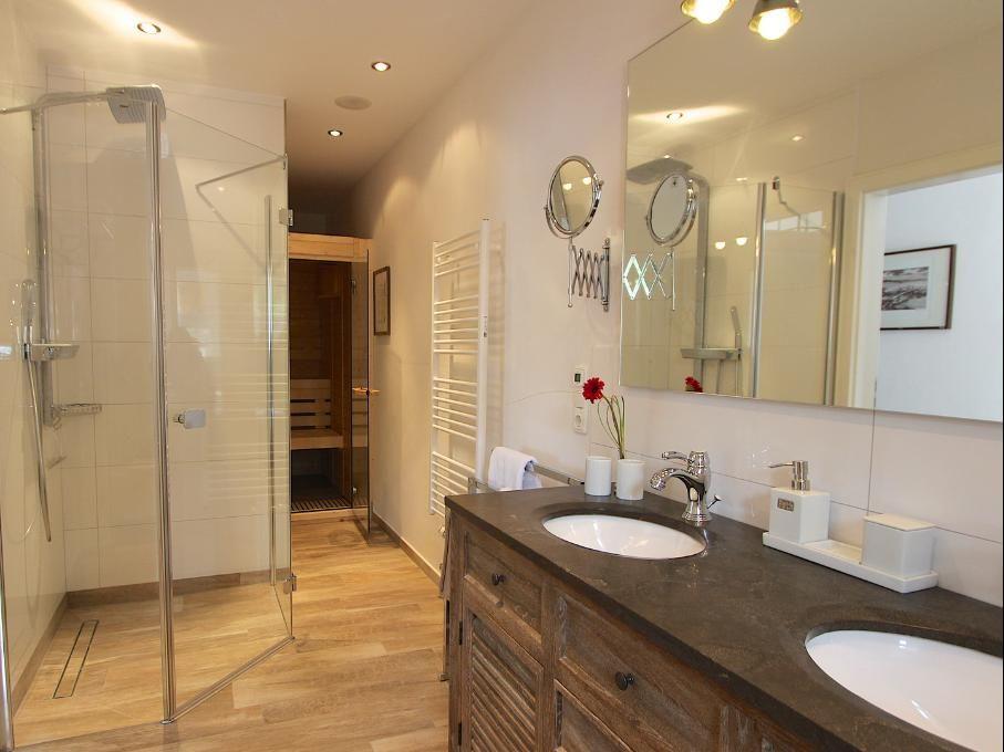 Eingangsbereich, Wohnraum mit integrierter Küche, Essbereich, Kamin und Zugang zur Terrasse, 2 Schlafzimmer mit Boxspringbetten (je 180 x 200 cm - Einzelmatratzen), ein Duschbad / WC mit Sauna, ein separates Gäste-WC