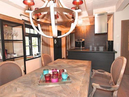 Erdgeschoss: Eingangsbereich, Wohnraum mit integrierter Küche, Essbereich, Kamin und Zugang zur Terrasse, ein Schlafzimmer mit Boxspringbett (160 x 200 cm - durchgehender Topper), ein Duschbad / WC, ein Hauswirtschaftsraum