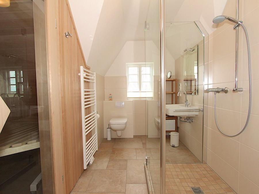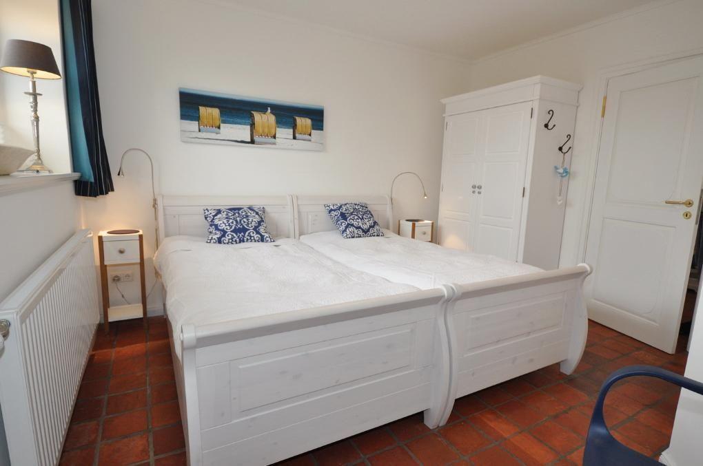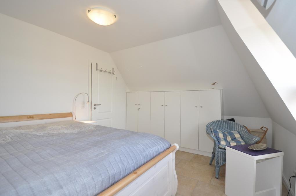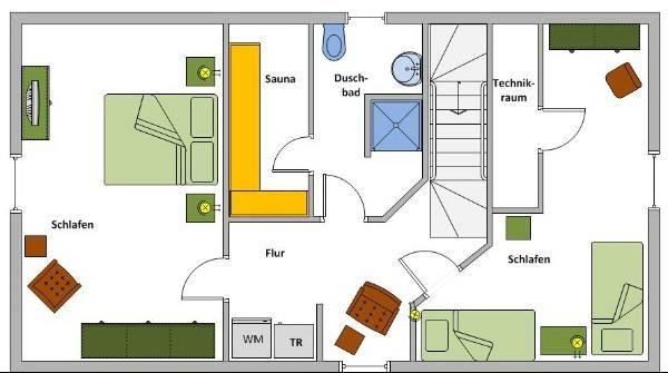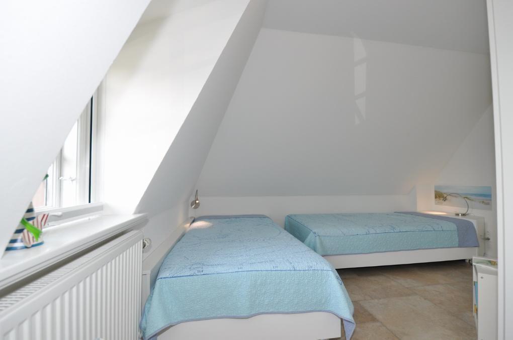 Obergeschoss: kleine Leseecke mit Blick auf den Deich, ein Schlafzimmer mit Doppelbett (180 x 200 cm), ein Schlafzimmer mit 2 Einzelbetten (je 100 x 200 cm - können zum Doppelbett zusammengestellt werden), ein Duschbad / WC mit angeschlossener Sauna