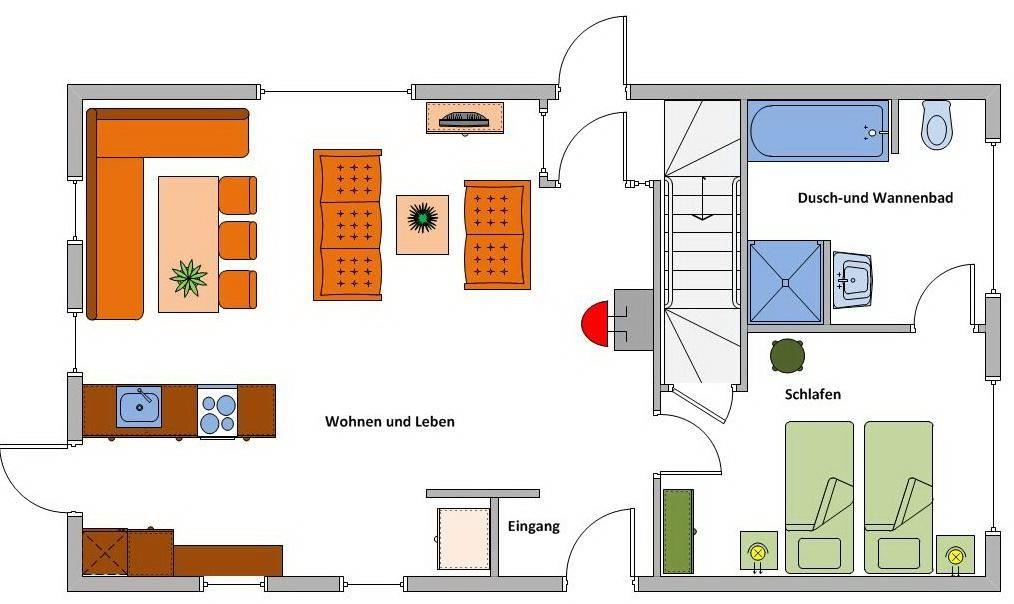 Erdgeschoss: Eingangsbereich, Wohnraum mit offener Küche, Essbereich, Kamin und Zugang zur Terrasse, ein Schlafzimmer mit Doppelbett (180 x 200 cm - Einzelmatratzen) und angeschlossenem Wannenbad / WC mit separater Dusche