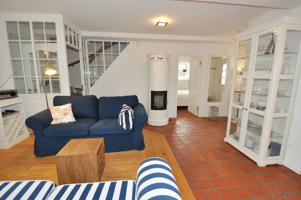 Der Wohn- und Essbereich wird durch einen erhöhten Holzfußboden besonders hervorgehoben, der wunderschöne Kachelofen rundet diesen Bereich optisch ab. Auf der Terrasse finden Sie Gartenmöbeln vor.