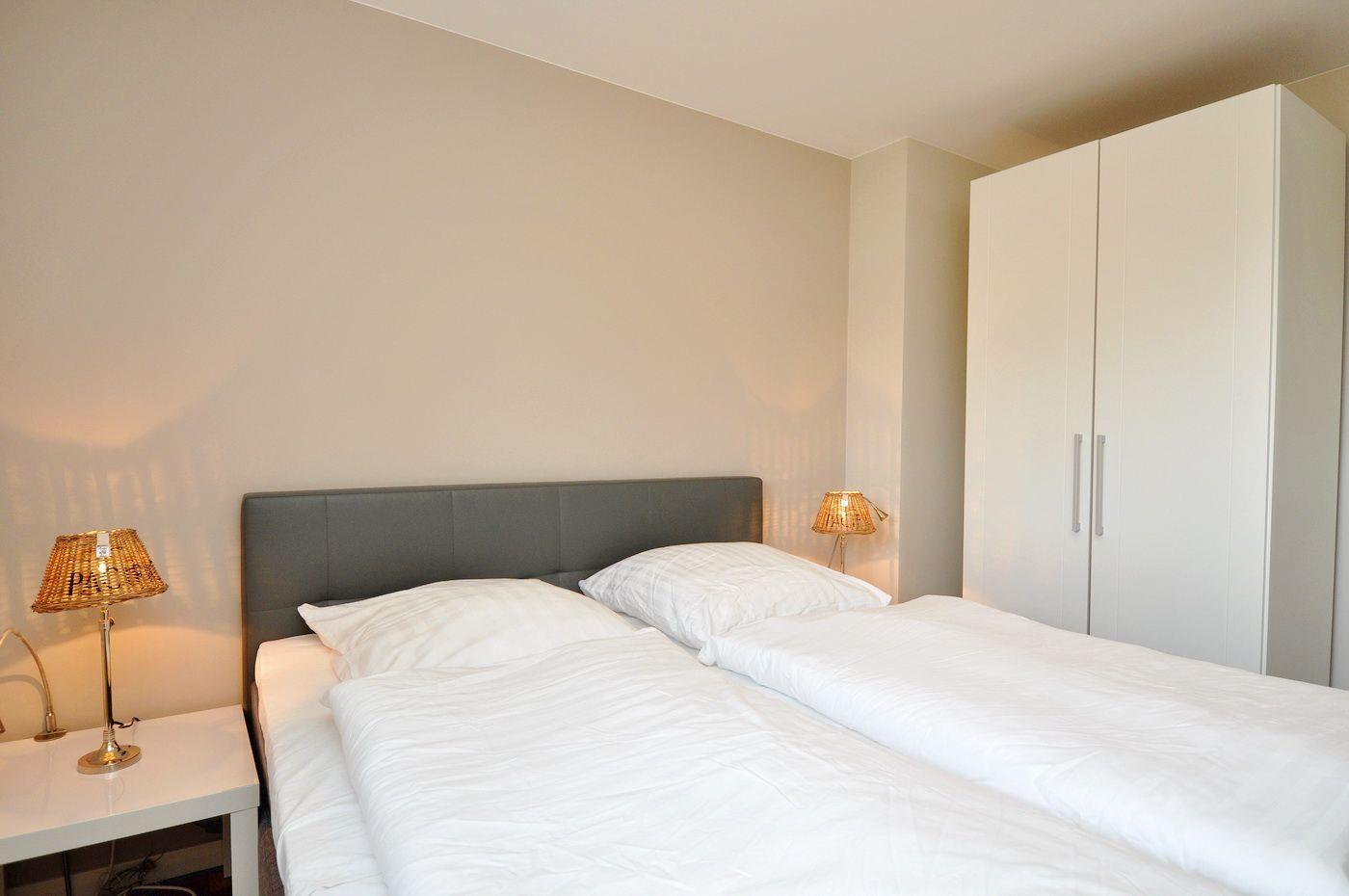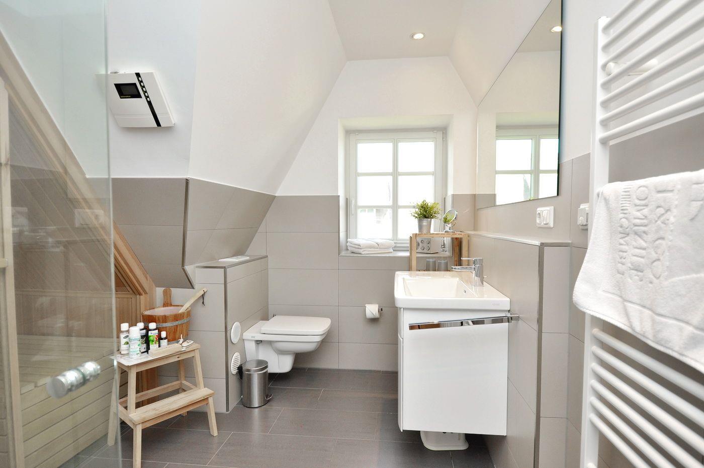 Obergeschoss: ein Schlafzimmer mit Boxspringbett (200 x 200 cm), ein Schlafzimmer mit 2 Einzelbetten (je 90 x 200 cm), ein Duschbad / WC mit Sauna