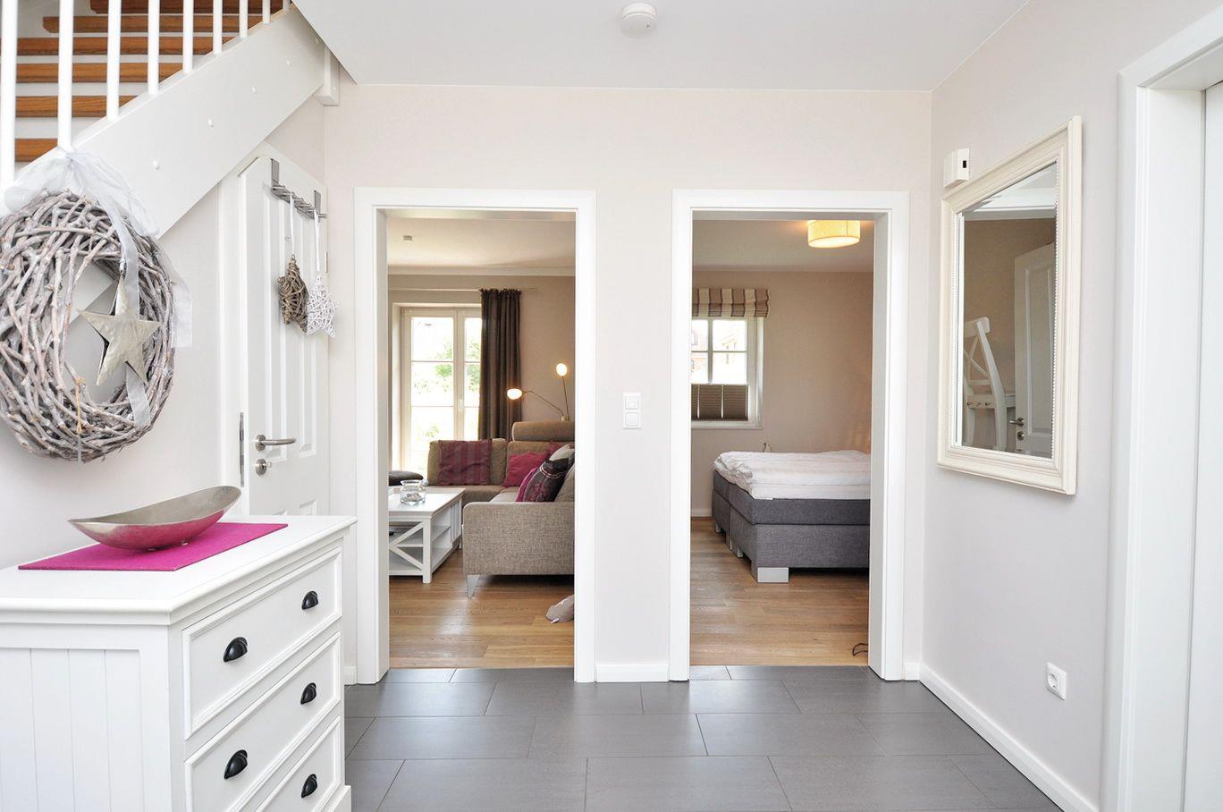 Erdgeschoss: Eingangsbereich, Wohnraum mit offener Küche, Essbereich, Kamin und Zugang zur Terrasse, ein Schlafzimmer mit Boxspringbett (180 x 200 cm), ein Duschbad / WC, ein Hauswirtschaftsraum
