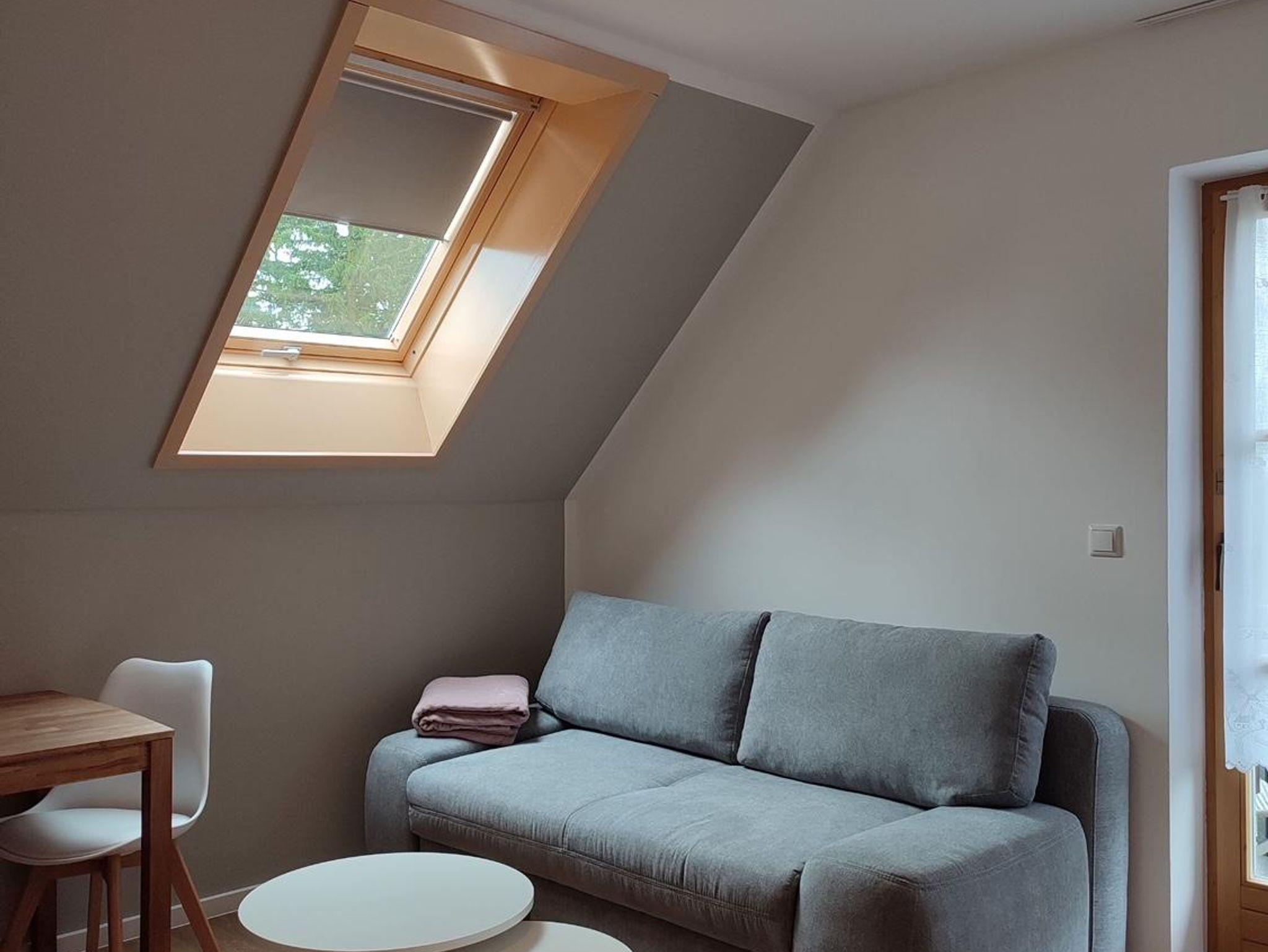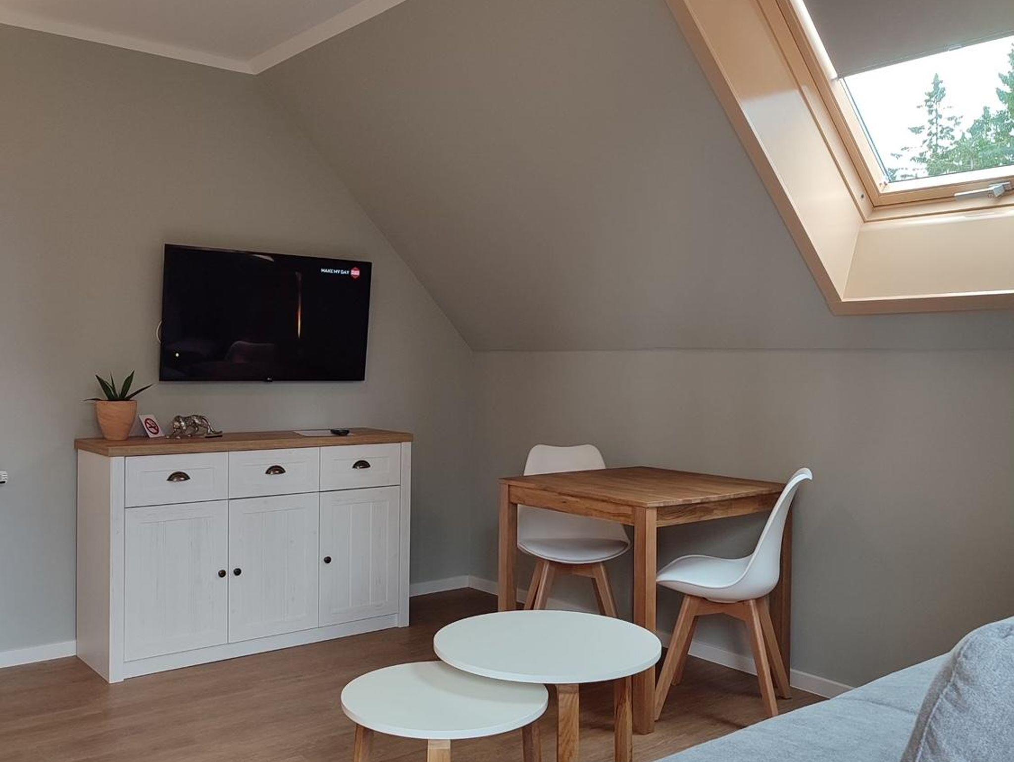Entdecken Sie Gerda, ein heimeliges Zwei-Raum-Apartment im Dachgeschoss mit ca. 35 qm für 2 bis 3 Personen. Das Besondere: Zwei kleine Balkone nach Südost und Südwest versprechen sonnige Stunden. Das liebevoll gestaltete Wohnzimmer mit ausziehbarem Schlafsofa, TV/WLAN und kleinem Esstisch schafft eine gemütliche Atmosphäre. Die praktische Küchenzeile, das Schlafzimmer mit Doppelbett und das Badezimmer mit Dusche garantieren einen erholsamen Aufenthalt. Haustiere sind im Dachgeschoss nicht erlaubt.