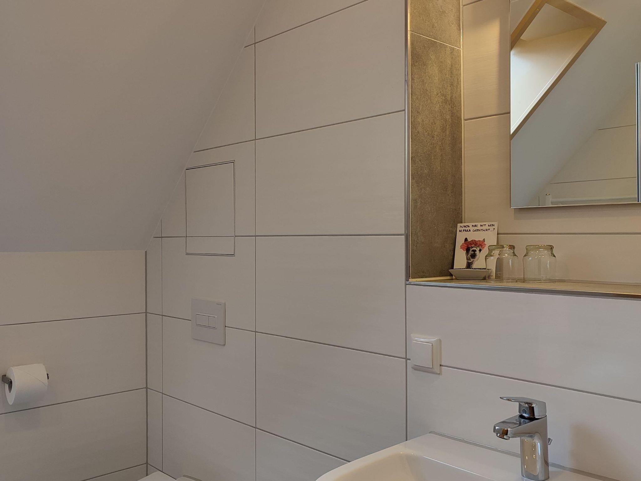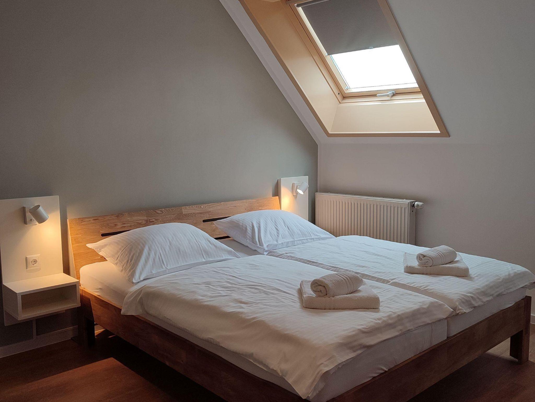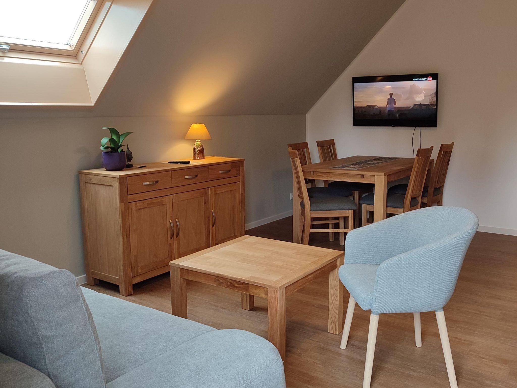 Genießen Sie Hilde, ein großzügiges Zwei-Raum-Apartment im Dachgeschoss mit ca. 52 qm für 2 bis 5 Personen. Entspannen Sie im großzügigen Wohnzimmer mit ausziehbarem Schlafsofa, TV/WLAN und großem Esstisch. Die gut ausgestattete Küchenzeile, das Schlafzimmer mit Doppelbett und Einzelbett sowie das moderne Badezimmer mit Dusche machen Ihren Aufenthalt besonders angenehm. Der kleine Balkon nach Südwest lädt zum Verweilen ein. Haustiere sind im Dachgeschoss nicht erlaubt.