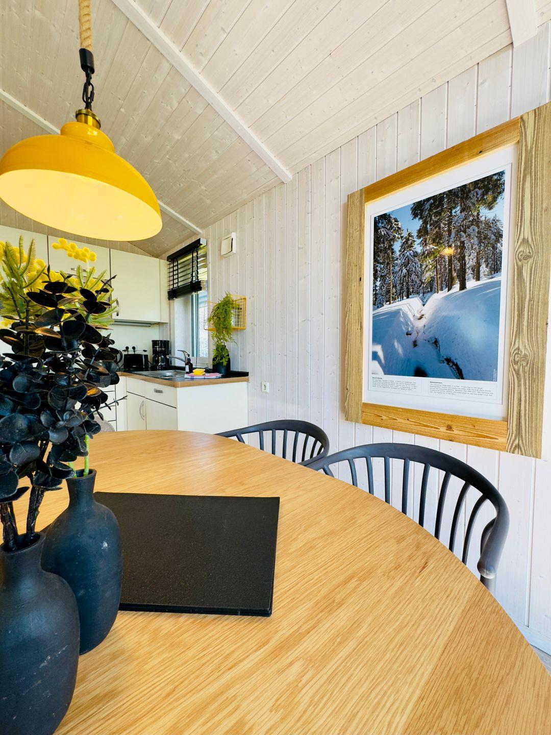 Der offene Wohnbereich ist das Herz des Hauses. Eine gemütliche Couch, modern-skandinavisches Mobiliar und ein Holzofenkamin sorgen für eine behagliche Atmosphäre, die zum Entspannen einlädt. Große Fenster lassen viel Tageslicht herein und bieten dir einen malerischen Blick auf die umliegende Natur. Zur Unterhaltung stehen ein Flachbild-TV und eine Musikanlage bereit.