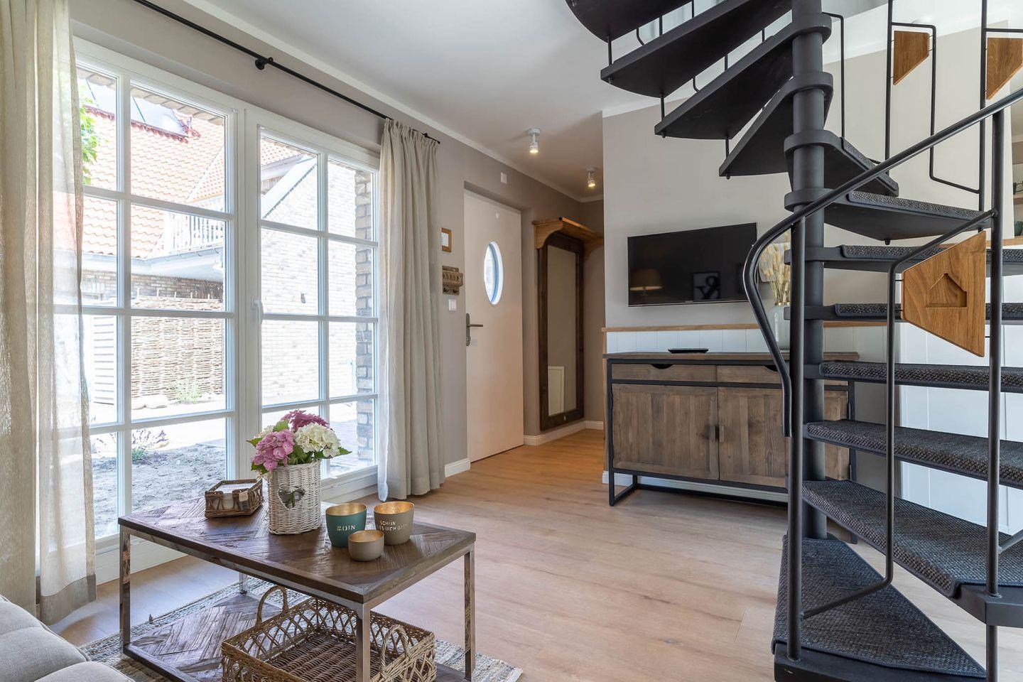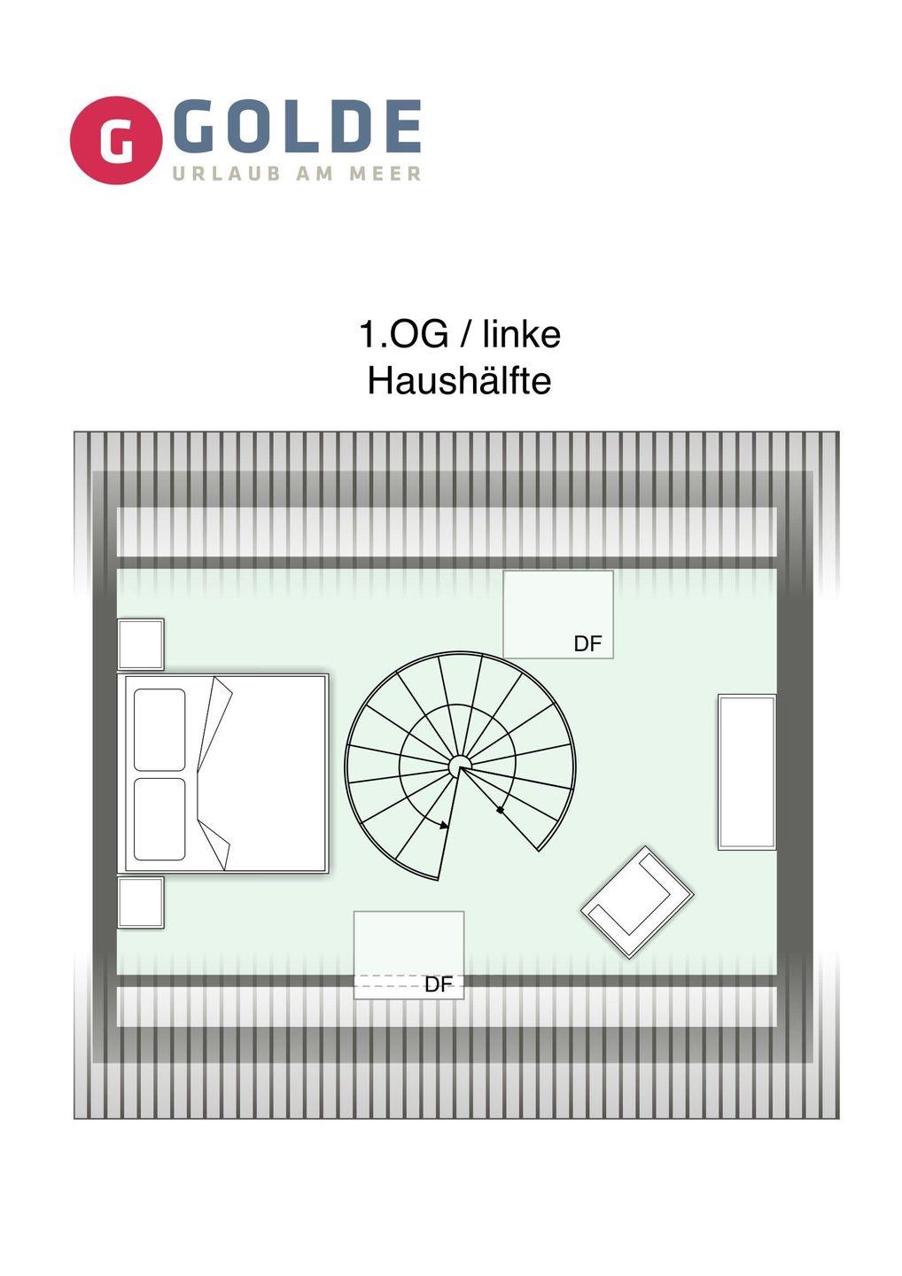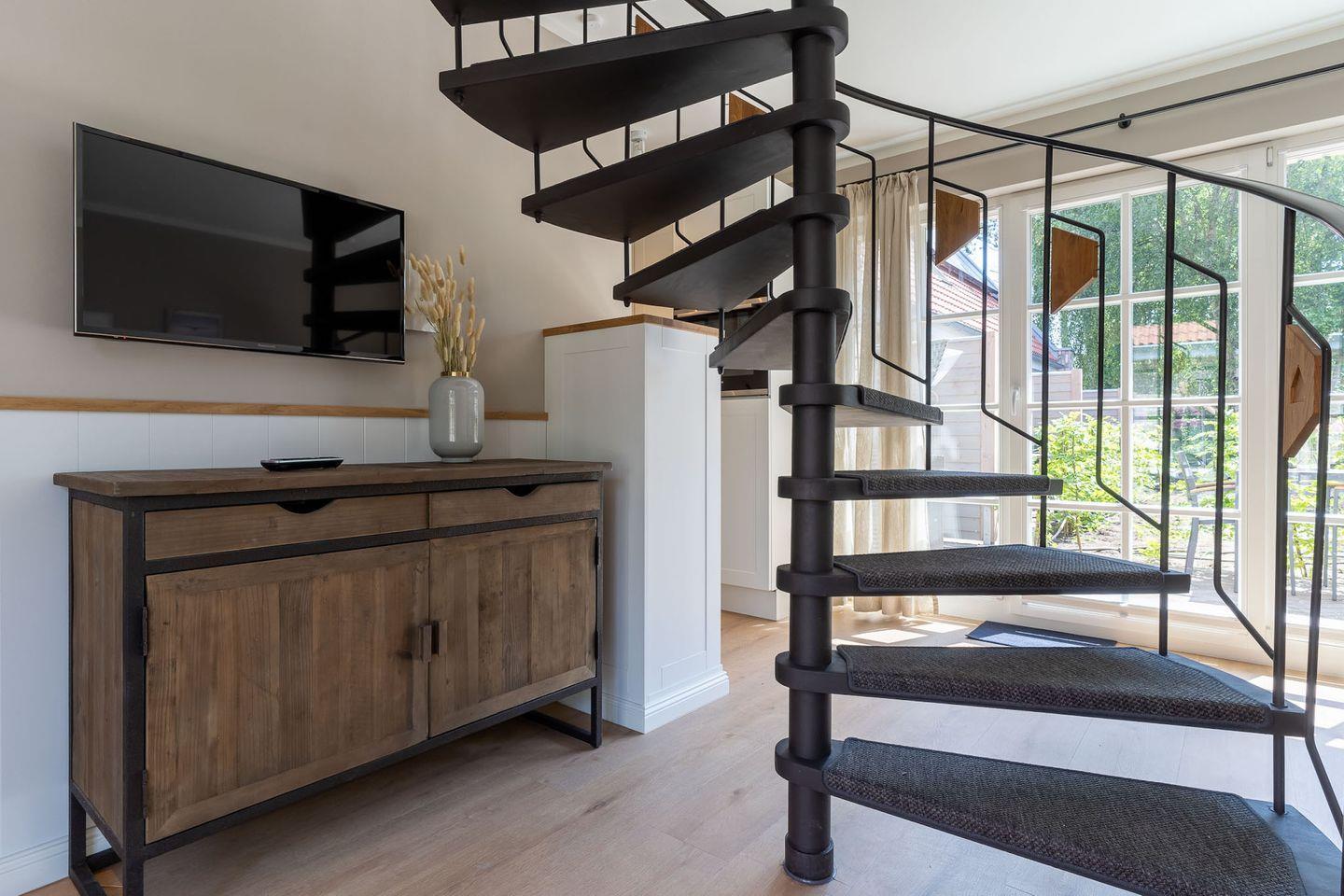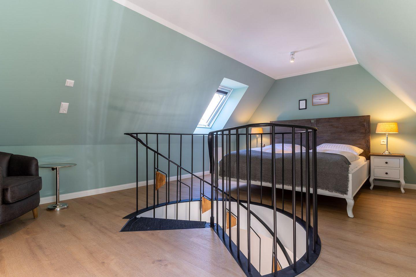 Über eine Wendeltreppe aus dem Wohnraum gelangt man in das Obergeschoss. Hier befindet sich das gemütliche Schlafzimmer mit einem Doppelbett.