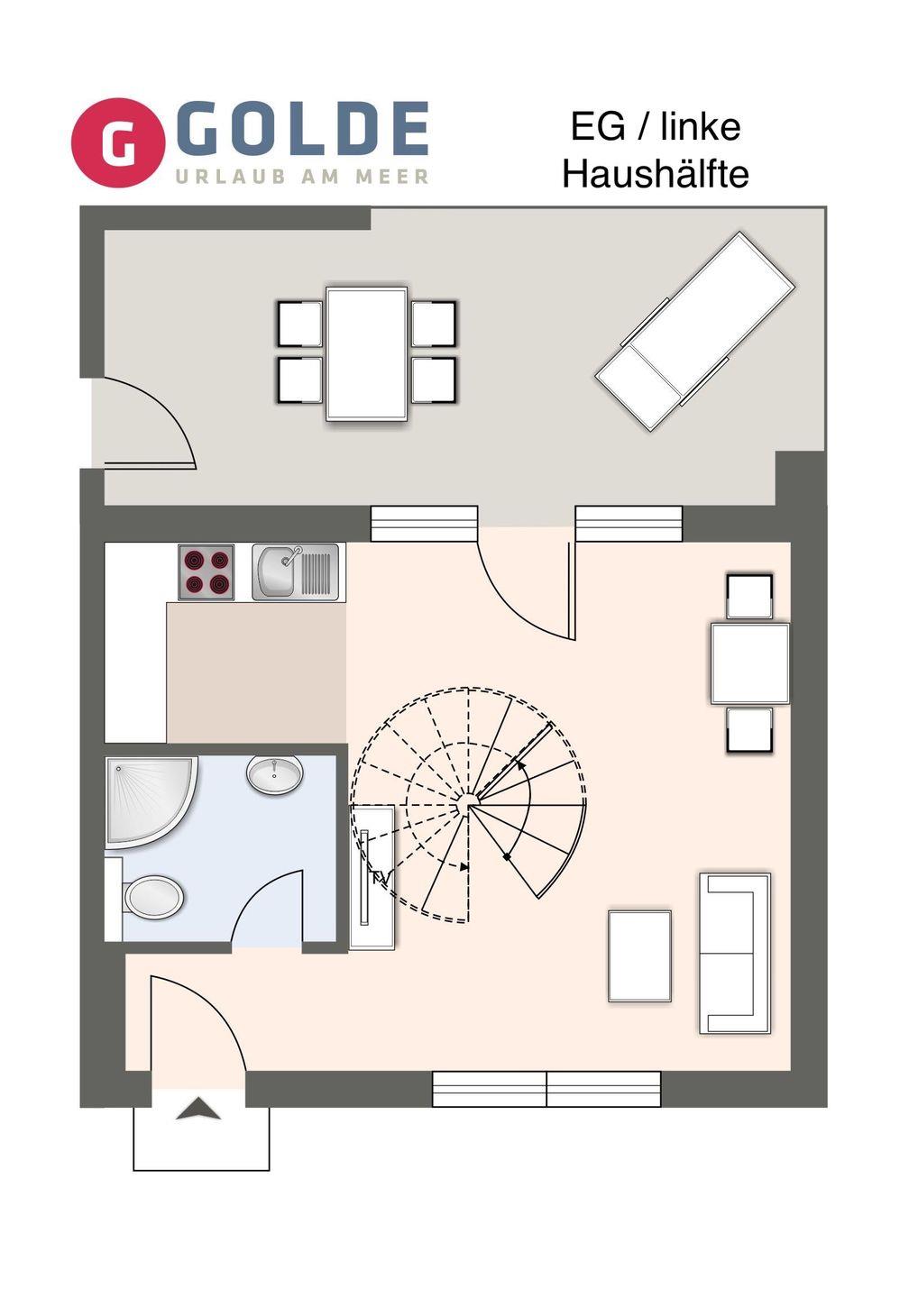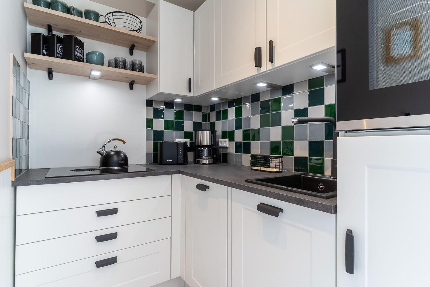 Im Erdgeschoss befindet sich ein großzügiger Wohnraum mit TV und einer modernen Wohnküche. Die Küche ist voll ausgestattet und verfügt über hochwertige Elektrogeräte.