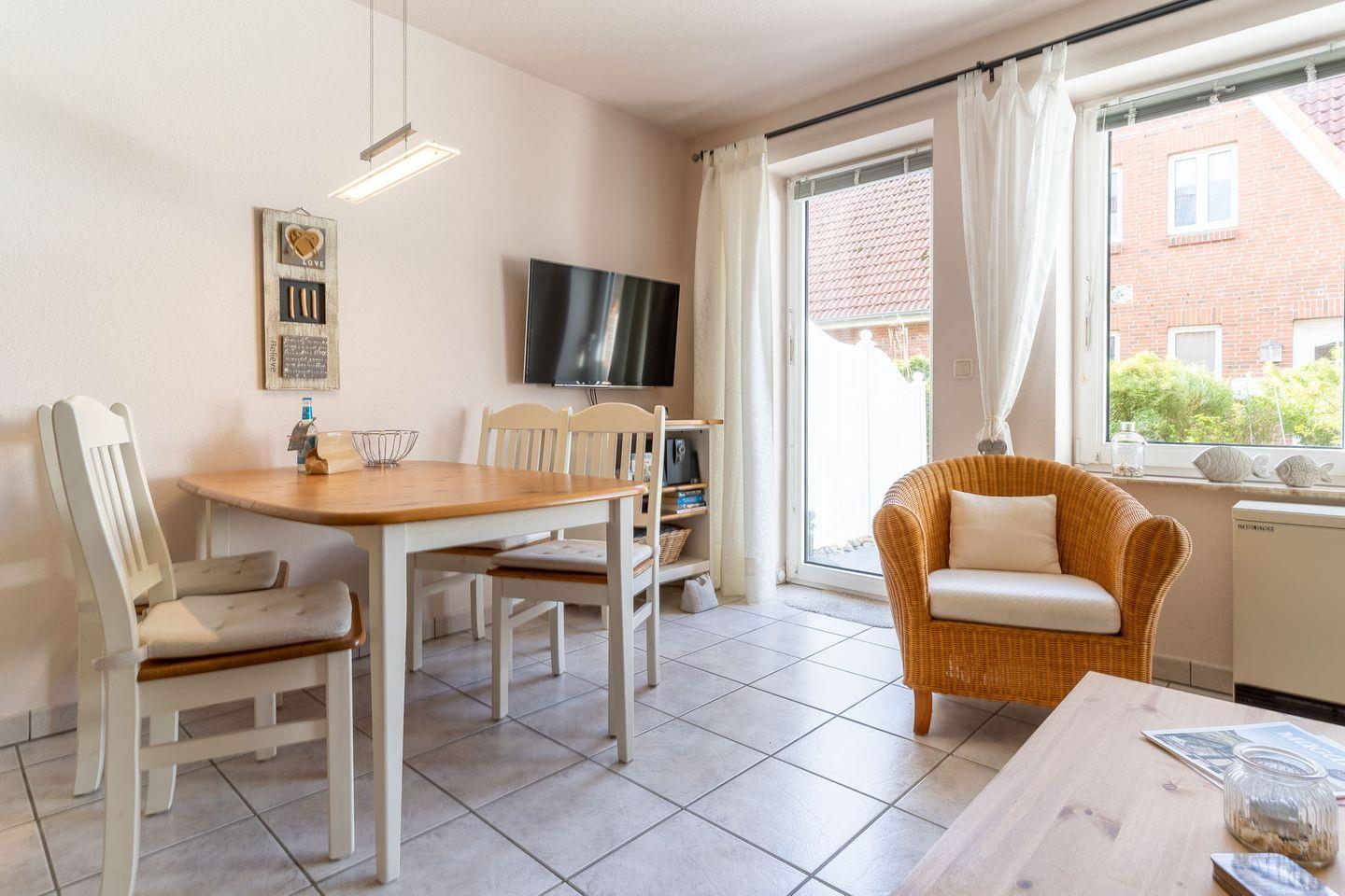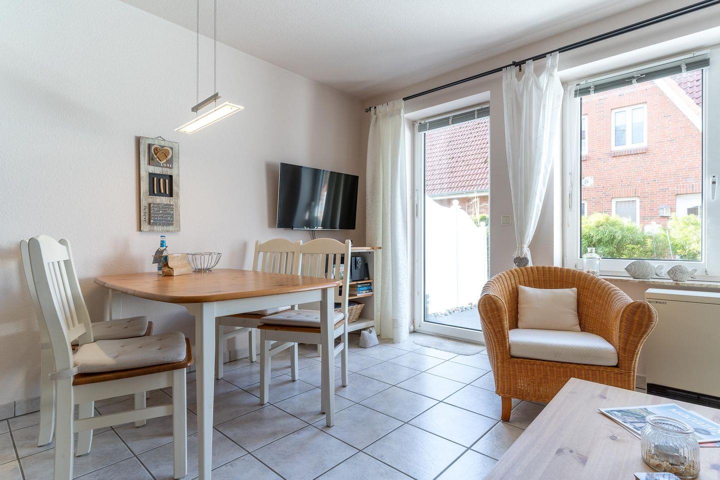 Erleben Sie einen erholsamen und gemütlichen Urlaub in unserem liebevoll eingerichteten Reihenhaus für bis zu 4 Personen in St. Peter-Ording. Das frisch renovierte Haus bietet im Erdgeschoss ein modernes Wohn- und Esszimmer mit offener Einbauküche sowie ein Duschbad mit WC und Abstellraum. Von hier aus haben Sie direkten Zugang zur sonnigen Südterrasse und dem kleinen Garten, wo Sie in Ruhe entspannen und die frische Nordseeluft genießen können. Im Obergeschoss erwarten Sie zwei gemütliche Schlafzimmer, eines mit Doppelbett und das andere mit zwei Einzelbetten.