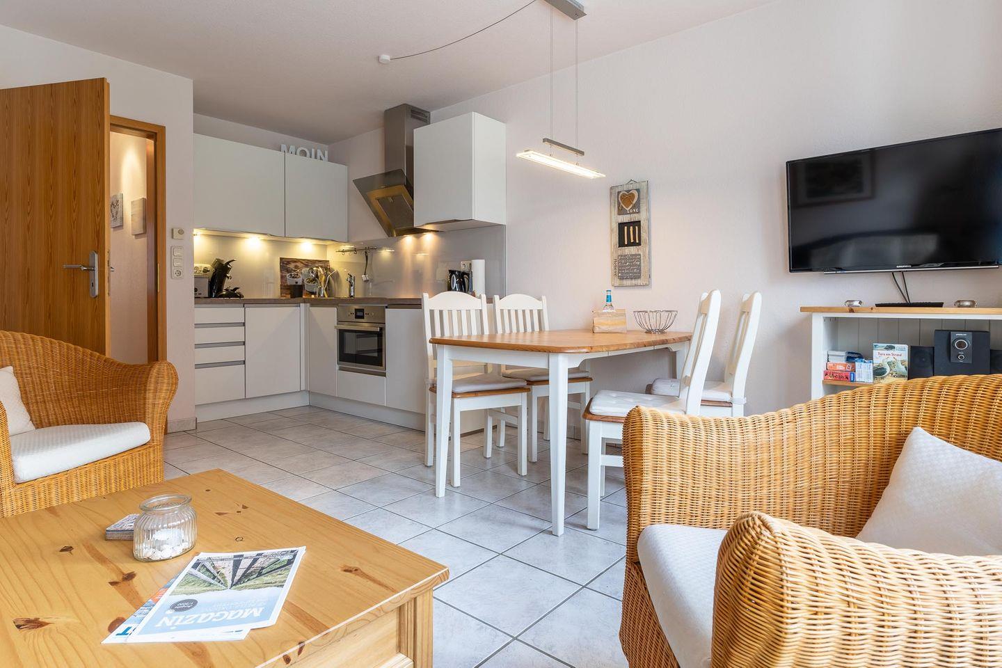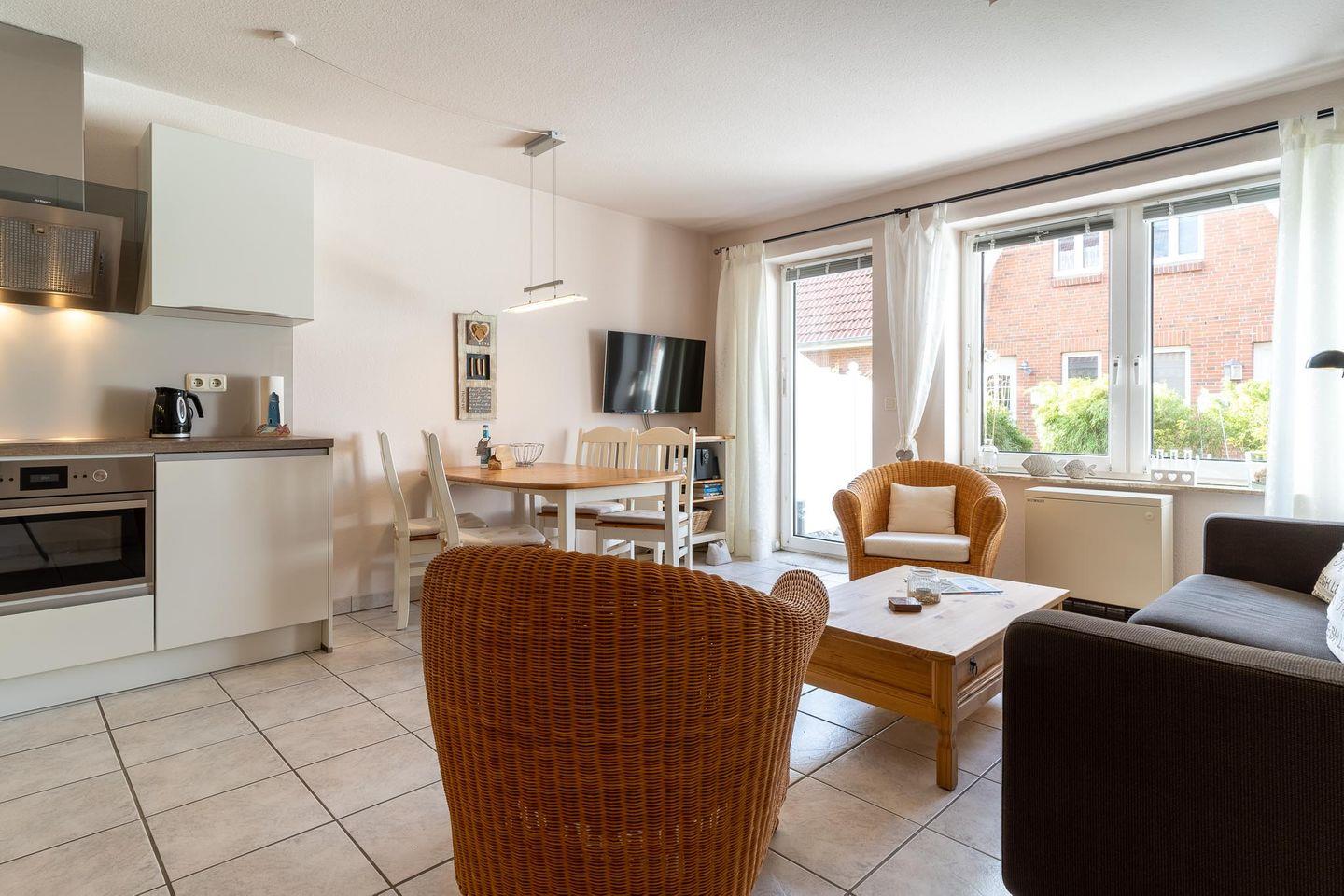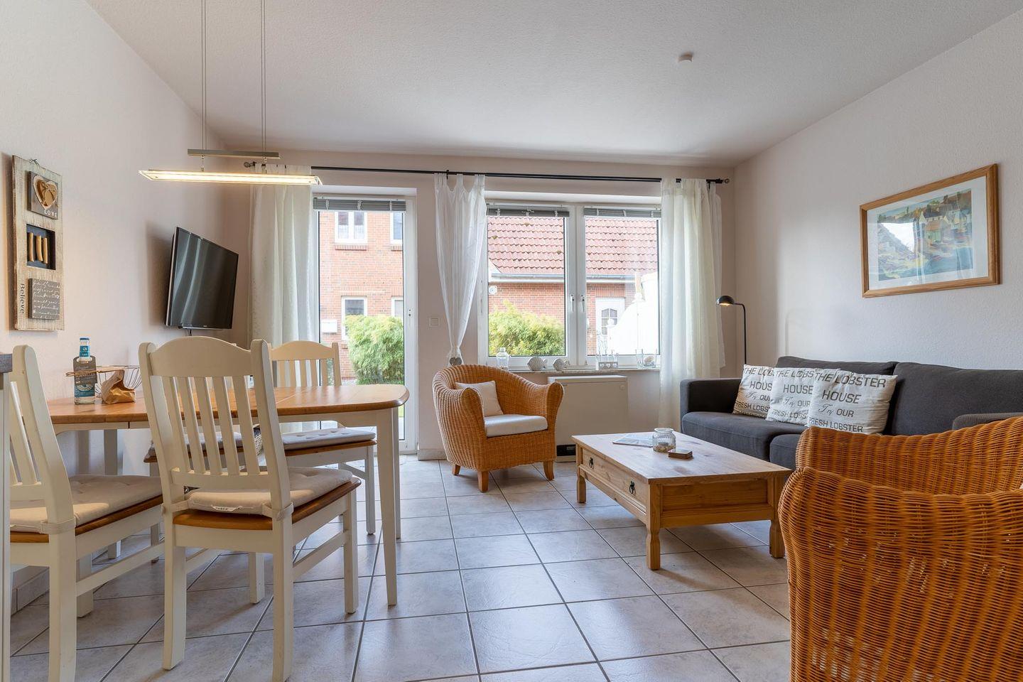 Das gemütliche Reihenhaus bietet Platz für bis zu 4 Personen. Im EG befinden sich Wohn-/Esszimmer, Küche, Duschbad und Abstellraum. Vom Wohnzimmer aus gelangen Sie auf die Südterrasse mit kleinem Garten. Im OG befinden sich zwei Schlafzimmer. Die Wohnung hat eine Wohnfläche von ca. 55 qm und ist mit Waschmaschine und Terrassenmöbeln ausgestattet. Ein Parkplatz ist vorhanden. Die ruhige Lage im Ortsteil Böhl und die Nähe zum Leuchtturm machen das Haus zu einem perfekten Ort für ihren Urlaub.