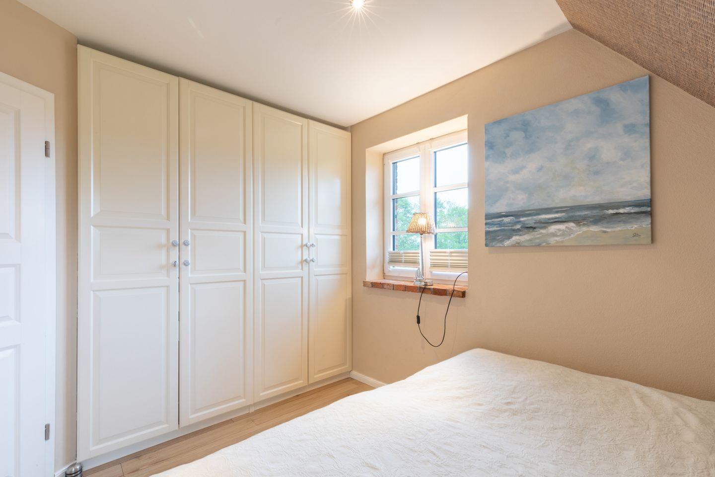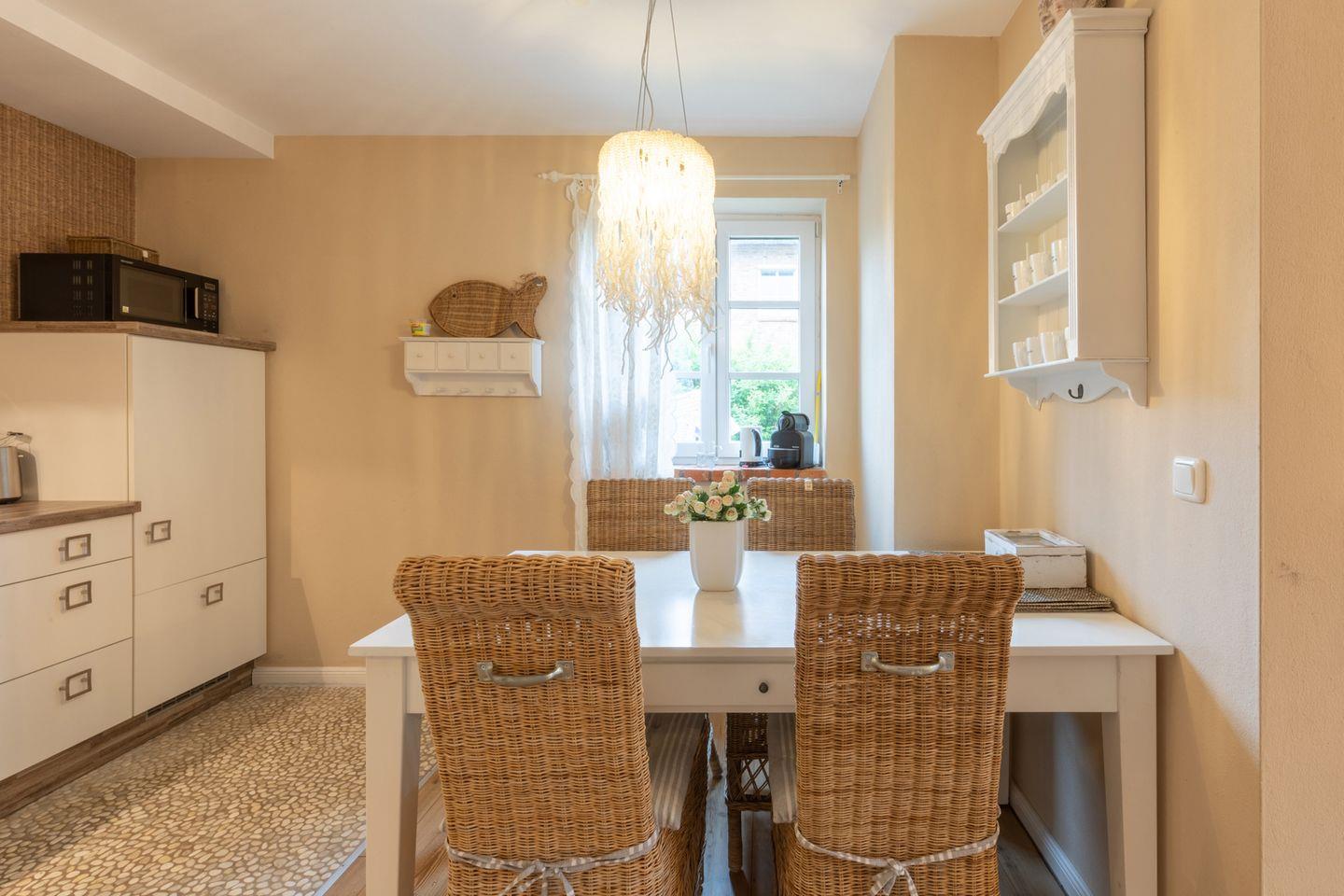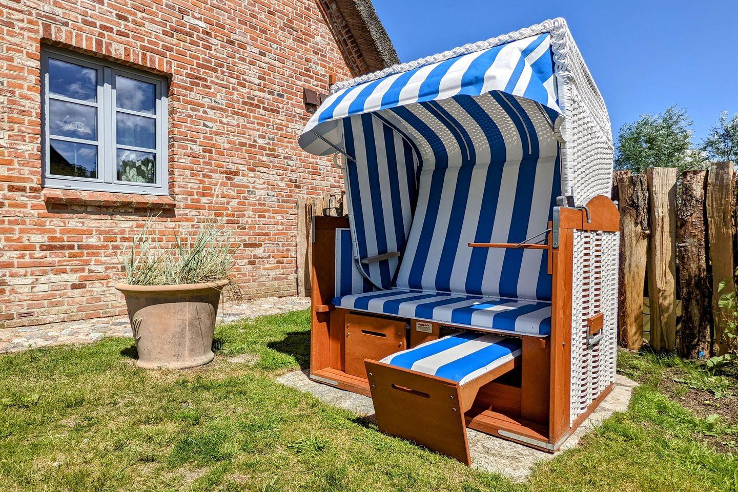 Über den einladend gestalteten Eingangsbereich mit Garderobe gelangen Sie in einen Wohn-Essbereich mit offener Küche. Letztere punktet mit einer überaus vollständigen Ausstattung, die ein gemeinsames Zubereiten von Speisen möglich macht. Der Esstisch mit Plätzen für 4 Personen steht nahe bei und lädt ein zu einem geselligen Miteinander. Im gemütlichen Fernsehbereich finden Sie Entspannung bei einem Film oder wärmen sich in der kühlen Jahreszeit nach einem langen Strandspaziergang am Kaminofen auf. Vom Wohnbereich aus betreten Sie die möblierte Terrasse. Der angrenzende Garten ist umzäunt und mit weiteren Sitzgelegenheiten u.a. einem Strandkorb ausgestattet.