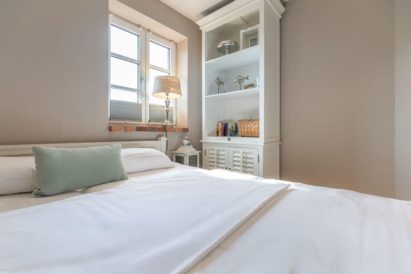 Im Obergeschoss befinden sich zwei Schlafzimmer mit je einem Doppelbett (180x200cm, durchgehende Matratze) und einer großen Schrankwand. Im Dachgeschoss finden Sie ein weiteres Schlafzimmer mit zwei Einzelbetten (90x200cm) vor. Hier schlafen Sie bei ausreichender Deckenhöhe unter Dachschrägen im Spitzboden mit klassisch friesischem Rundbogenfenster. Das moderne Badezimmer ist sowohl mit einer Badewanne als auch mit einer ebenerdigen Regendusche ausgestattet. Ein weiteres Bad im Erdgeschoss verfügt über eine ebenerdige Dusche sowie Gäste WC. Im Hauswirtschaftsraum unter der Treppe steht für Sie zur kostenlosen Nutzung eine Waschmaschine bereit. Für Ihr Auto befindet sich ein Stellplatz am Haus.
