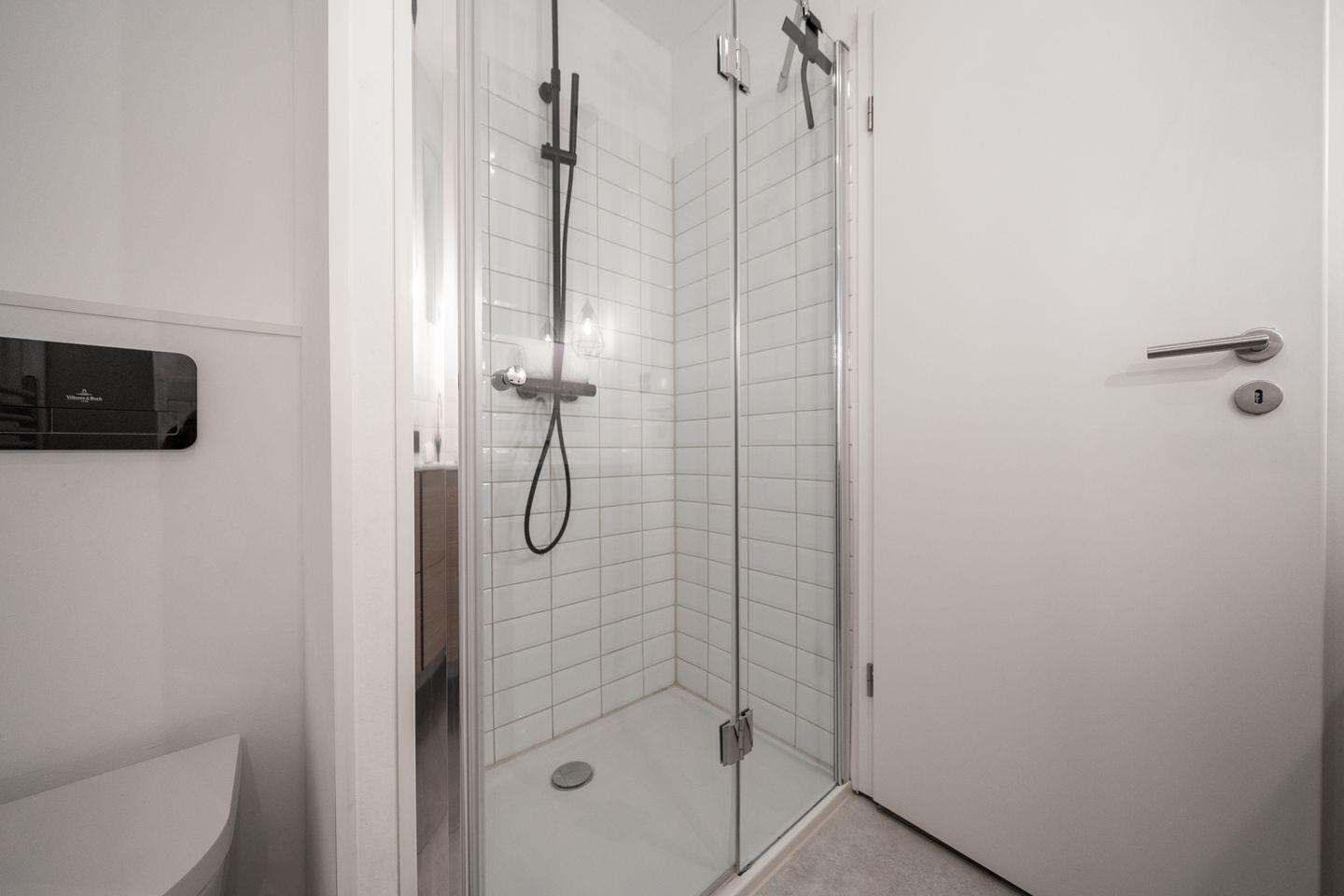 Das geräumige Badezimmer der Wohnung bietet mit zwei Waschbecken viel Platz und beeindruckt mit einer ebenerdigen Regendusche. Für Ihr Auto befindet sich ein zugewiesener Stellplatz am Haus. Fahrräder können im Außenbereich angeschlossen werden.