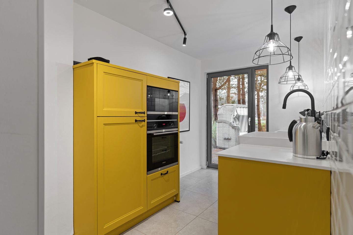 Der stilvoll gestaltete Wohn-Essbereich, ausgestattet mit exklusiven Möbeln von Rivièra Maison und COCO-MA, lädt zu gemütlichen Stunden ein. Die separate, großzügige Küche in modernem Design und mit hochwertiger Ausstattung lädt dazu ein, auch im Urlaub etwas Köstliches zuzubereiten. Von hier aus gelangen Sie auf die sonnige, möblierte Terrasse. Entspannen Sie sich am Abend im komfortablen Strandkorb. Ein Dünenwall mit Holzelementen umgibt das Anwesen und sorgt für Ihre Privatsphäre.