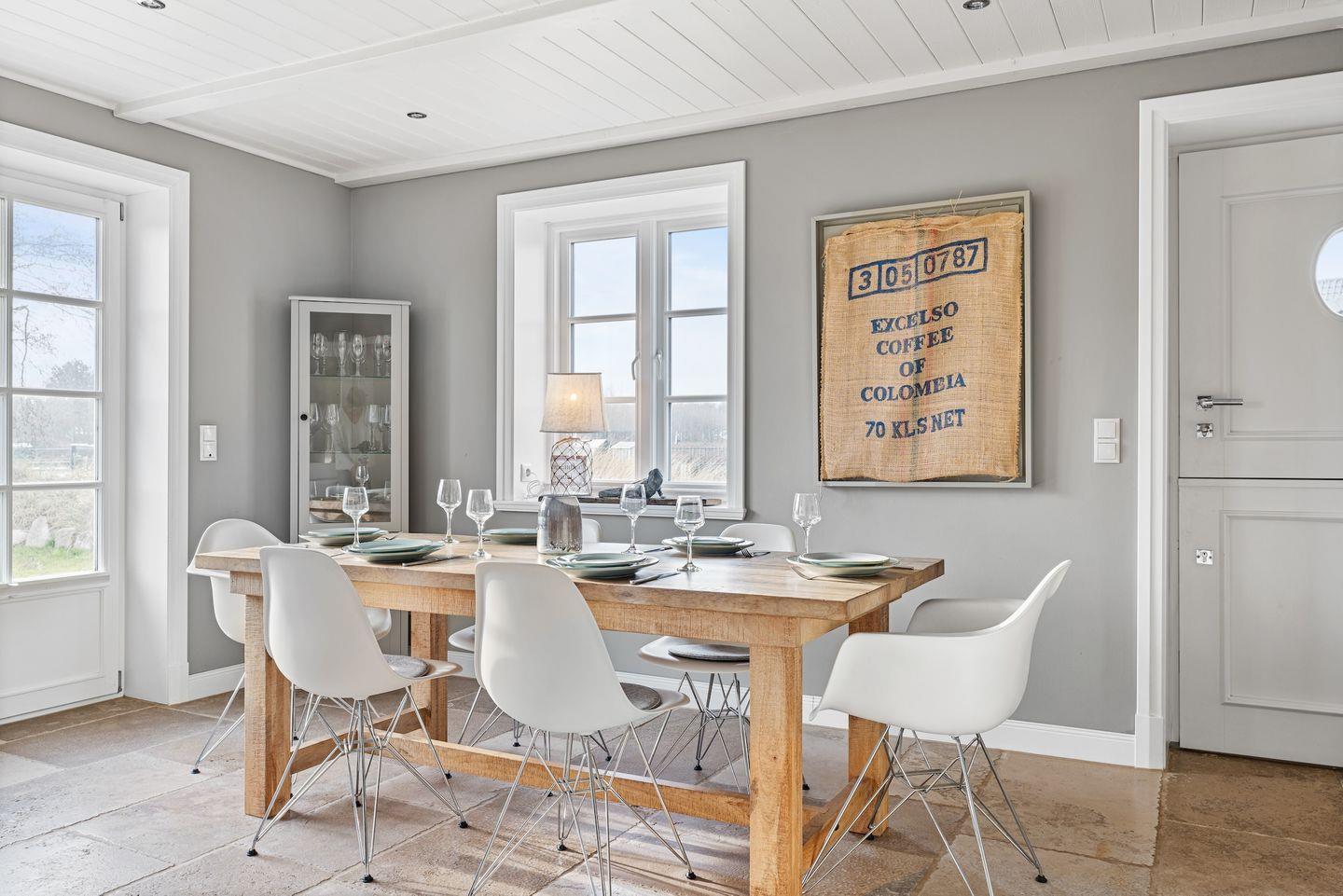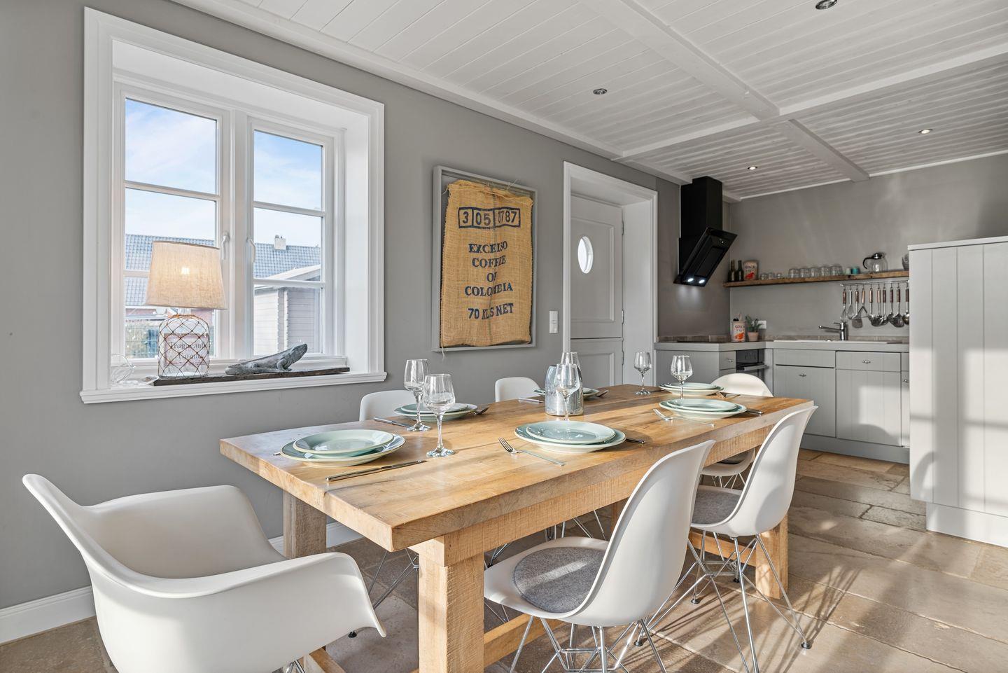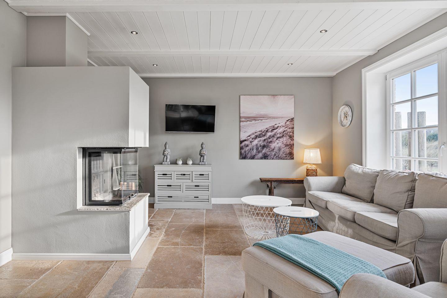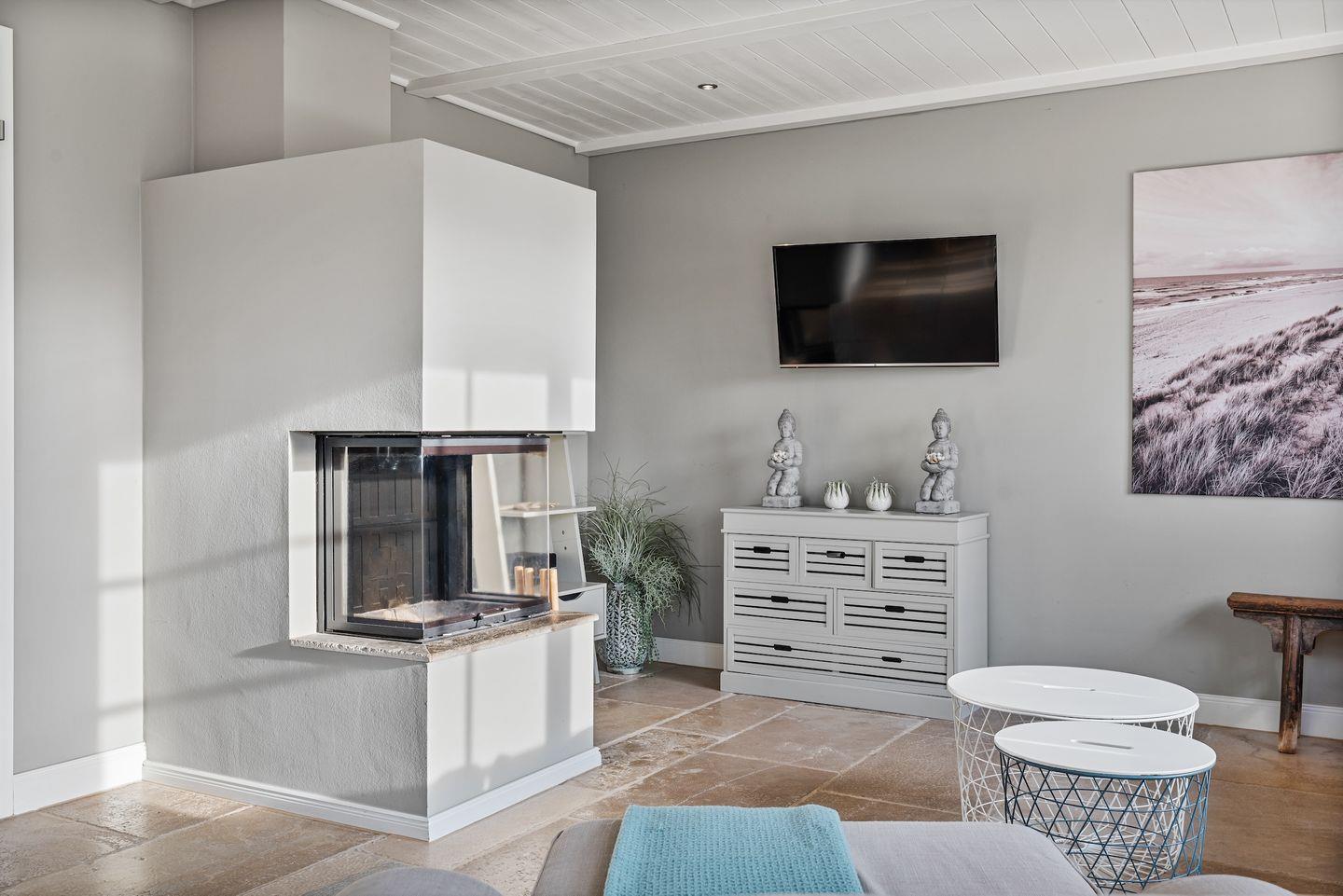 Die luxuriöse Haushälfte unter Reet verfügt über ca. 105 m² Wohnfläche und bietet Platz für 6 Personen. Im Erdgeschoss befindet sich der lichtdurchflutete Wohnraum mit TV, Kamin, einer offenen Küche sowie einem stilvollen Essbereich. Die Wohnräume sind mit wunderschönen Möbeln ausgestattet. Die Küche verfügt über hochwertige Elektrogeräte. An den Wohnbereich schließen sich ein Flur mit ein Hauswirtschaftsraum und ein Duschbad an. Das gesamte Erdgeschoss verfügt über geschmackvolle Natursteinfliesen, die über eine Fußbodenheizung beheizt werden können.