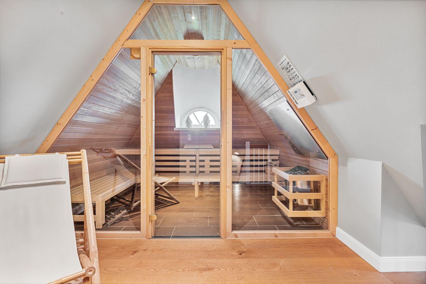 Über eine Holztreppe gelangt man in das mit Parkett ausgelegte Obergeschoss. Dieses verfügt ebenfalls über eine Fußbodenheizung. Ebenfalls drei Schlafzimmer, Schlafzimmer I mit einem Doppelbett 1,80 x 2,00 m, Schlafzimmer II mit 2 Einzelbetten und Schlafzimmer 3 mit 2 Einzelbetten die zu einem Doppelbett zusammengeschoben werden können, jeweils mit TV ausgestattet. Einbauschränke gewähren Ihnen hinreichend Ablageflächen. Darüber hinaus befindet sich im Obergeschoss ein weiteres Bad mit Dusche. Vom Obergeschoss führt die Holztreppe hinauf in das Dachgeschoss. Hier befindet sich eine sehr große Sauna mit Entspannungsbereich. Dieses wunderschöne Haus lässt keine Wünsche offen und bringt Sie sofort in Urlaubsstimmung.