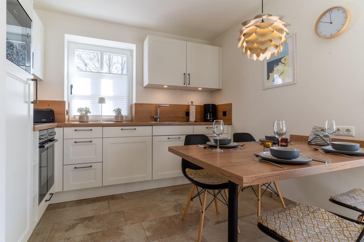 Die offene Wohnküche im Landhausstil ist voll ausgestattet mit Marken-Elektrogeräten, hochwertigen Porzellan und Küchenzubehör.