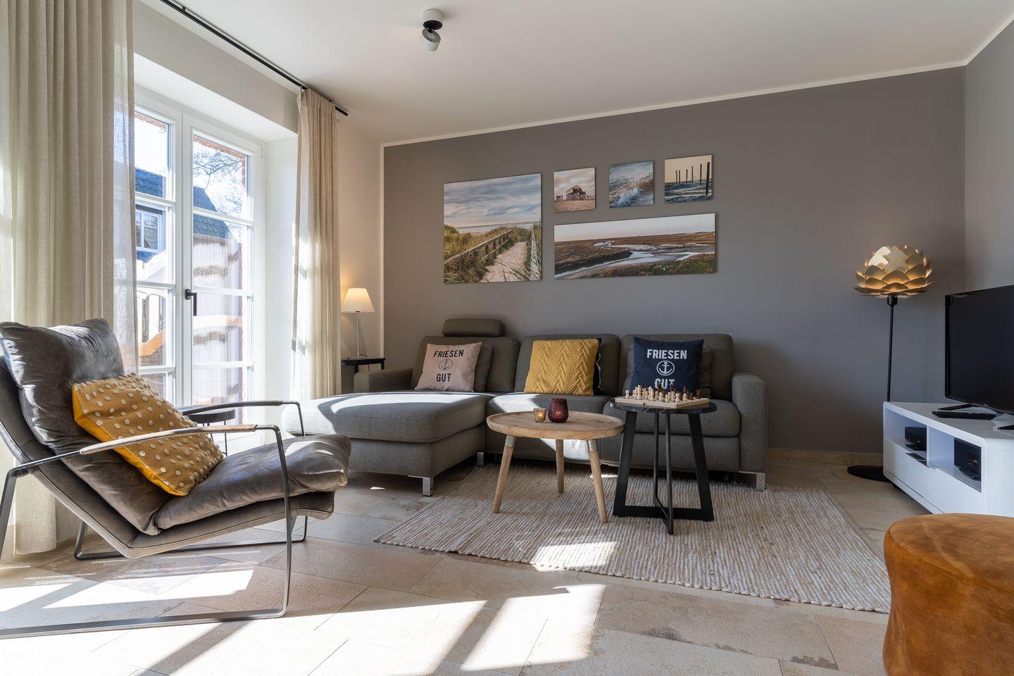 Die Reetdachhaushälfte auf 85 qm begeistert mit friesischem Charakter und behaglichem Interieur. Maßgefertigte Einbaumöbel bieten einen individuellen Komfort für geräumiges und lässiges Wohnen für bis zu fünf Gästen.