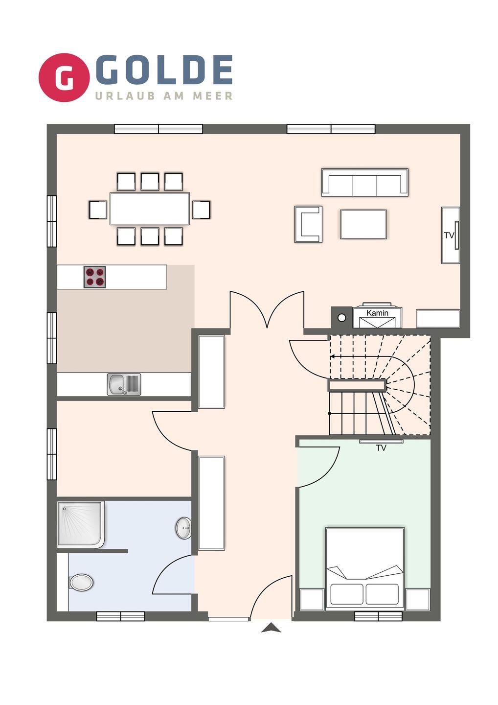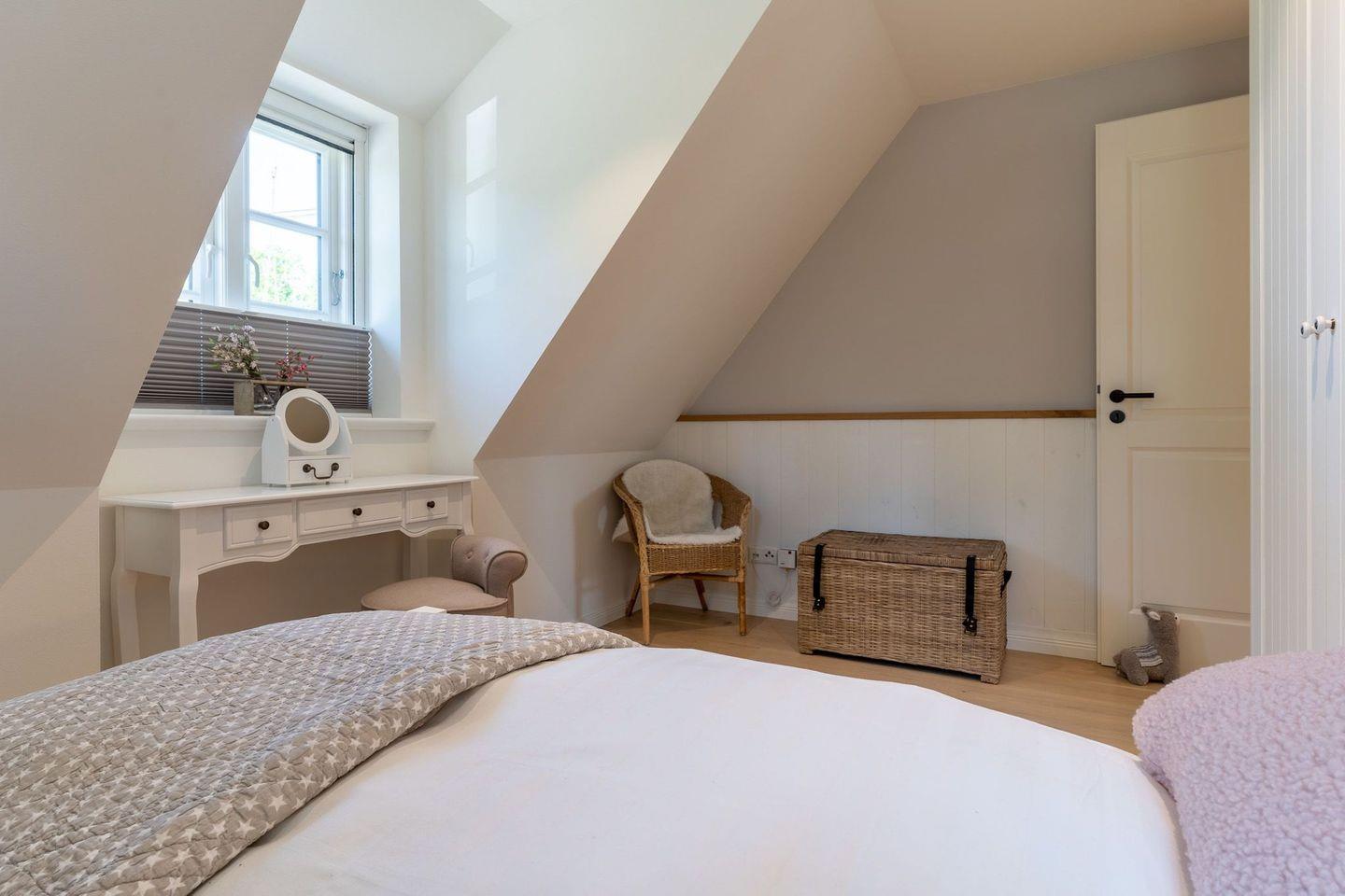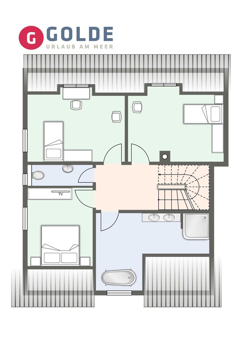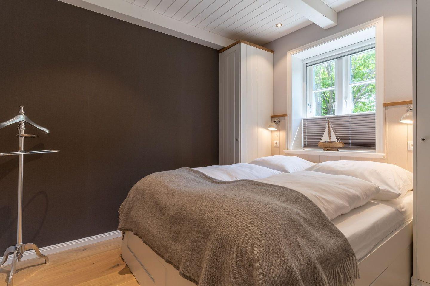 Über eine Holztreppe gelangt man in das Obergeschoss. Ein weiteres Schlafzimmer mit einem Doppelbett ist ebenfalls mit TV ausgestattet. Kleiderschränke gewähren Ihnen hinreichend Ablageflächen.