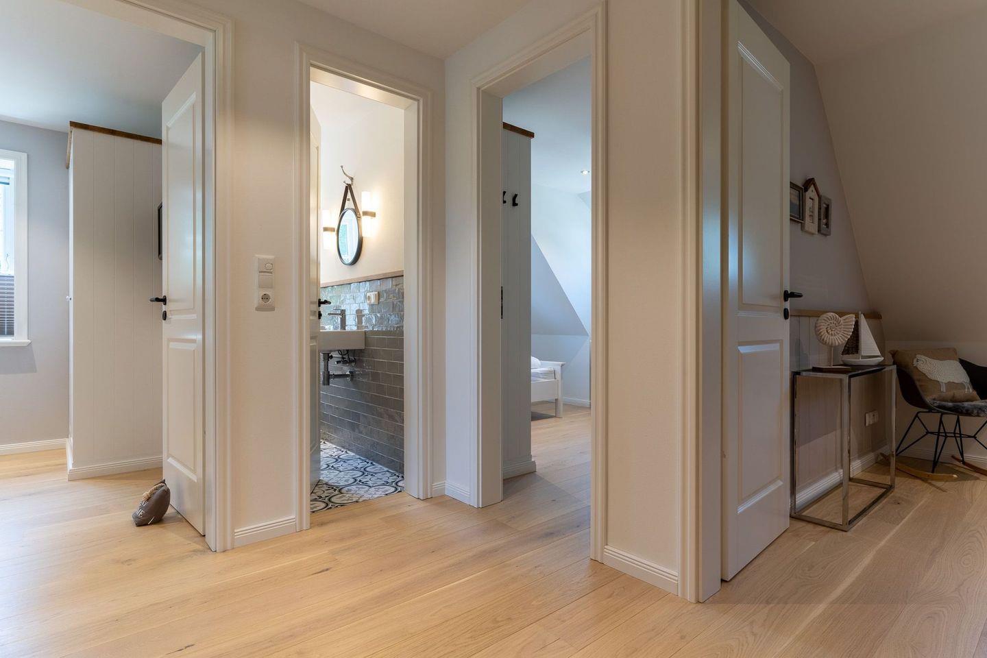 Ein zweites vollausgestattetes Badezimmer im OG, mit einer Dusche und zwei einzelnen Waschbecken runden das hochwertige Hauskonzept ab und lassen keine Wünsche offen.