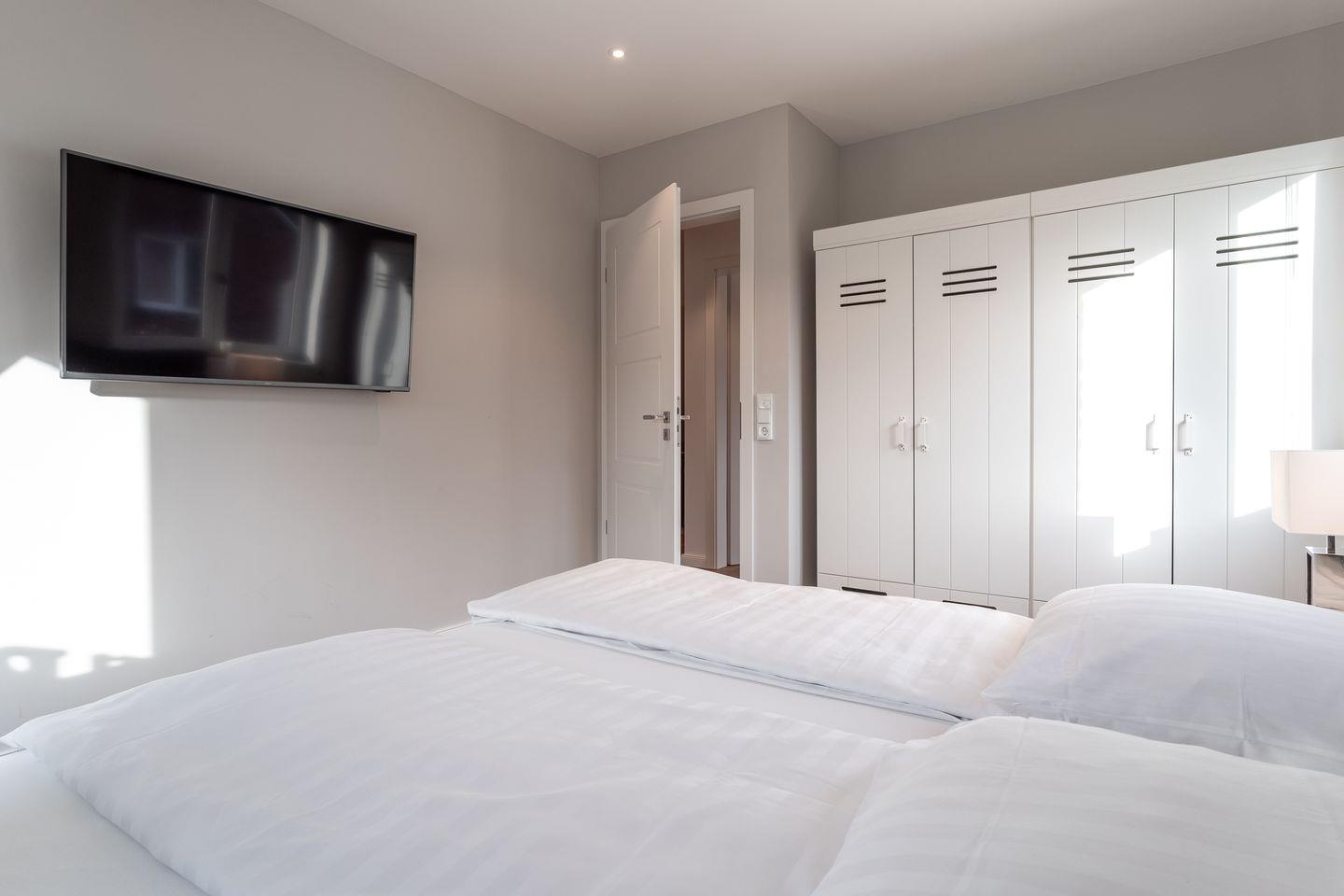 Über eine Treppe gelangen Sie ins Obergeschoss. Hier erwarten Sie drei Schlafzimmer, jeweils mit einem Boxspring-Doppelbett, ausgestattet mit Fernseher und großen Kleiderschränken.