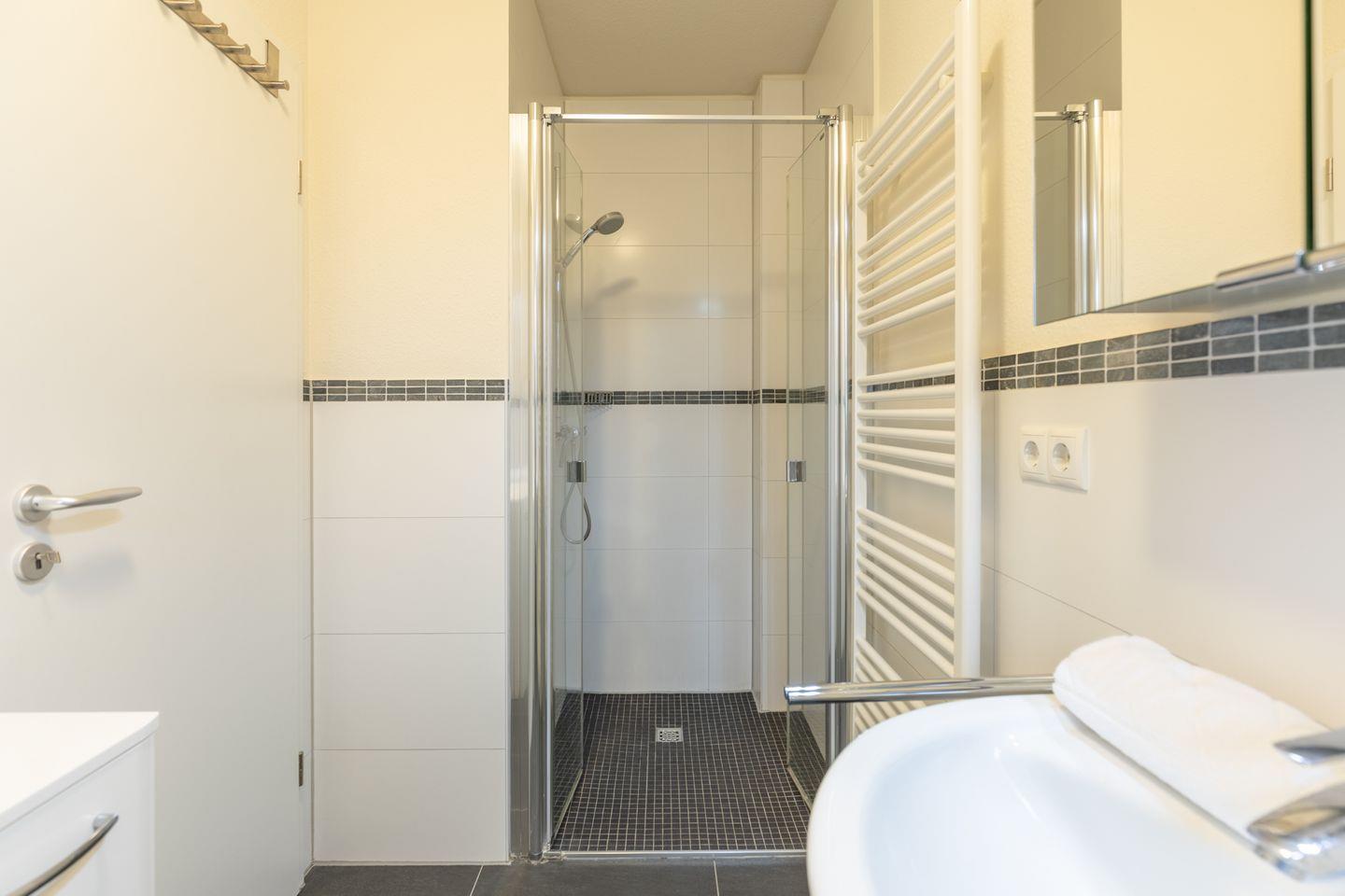 Das moderne, helle Bad begeistert mit einer ebenerdigen Dusche und Handtuchtrockner. Für eine wohlige Wärme sorgt hier eine Fußbodenheizung. Ebenso steht eine Waschmaschine für Sie zur Nutzung (ohne Aufpreis) bereit.
