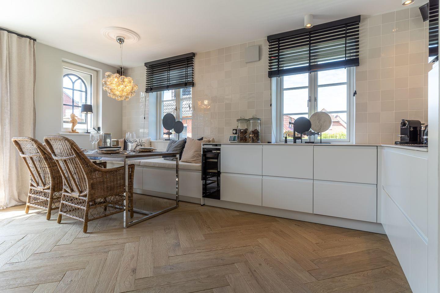 Die Küche verfügt über hochwertige Elektrogeräte, einen Weinkühlschrank und bietet genügend Platz zum gemeinsamen Kochen.