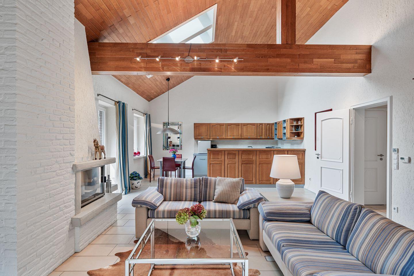 Im Erdgeschoss befindet sich der großzügige Wohnraum mit offener Balkendecke und einer Wohnküche mit Essbereich. Im Erdgeschoss ist ebenso ein Duschbad und ein Flur mit einer Garderobe von hier aus gelangen Sie jeweils ins Doppelschlafzimmer. Ein Schlafzimmer ist mit einem Doppelbett und ein weiteres mit 2 Einzelbetten ausgestattet.