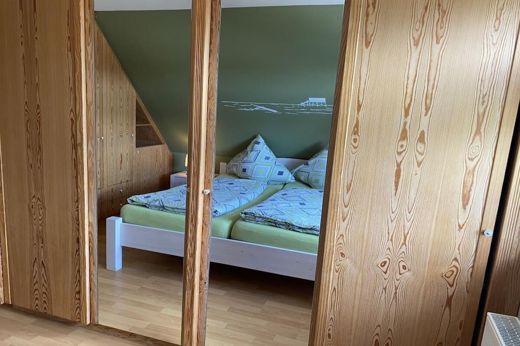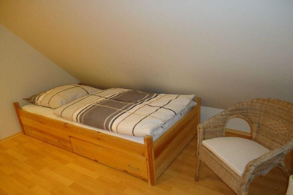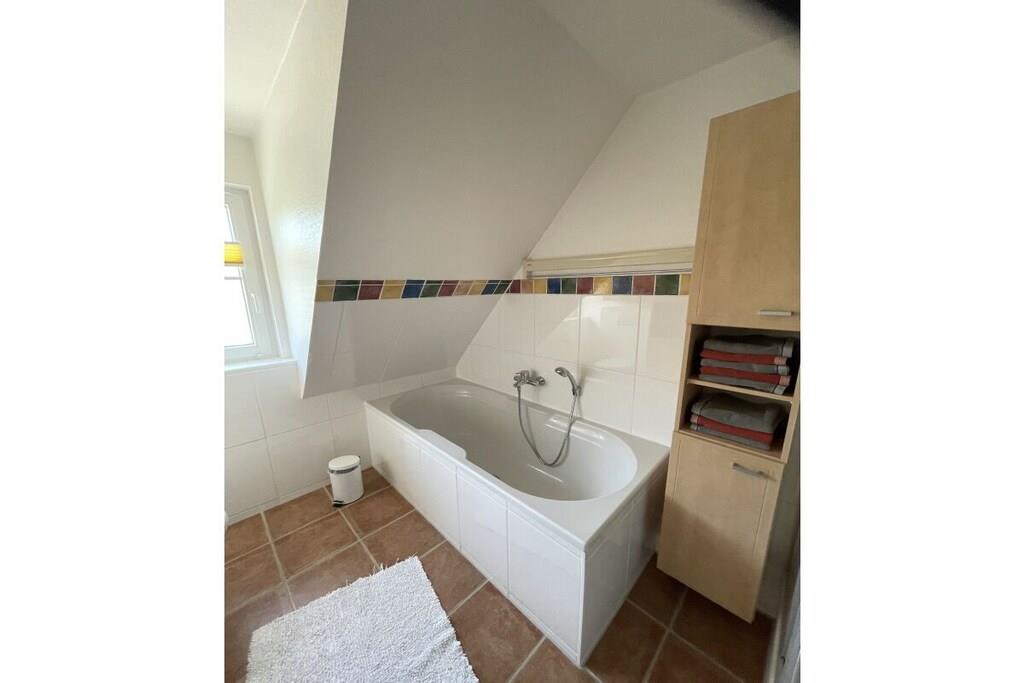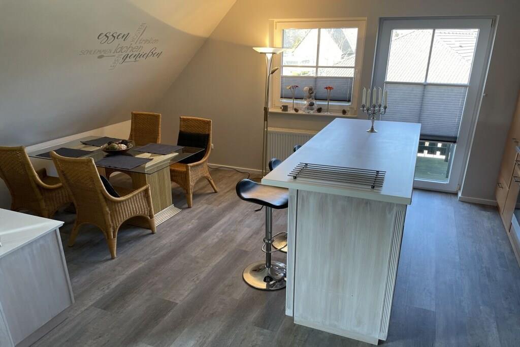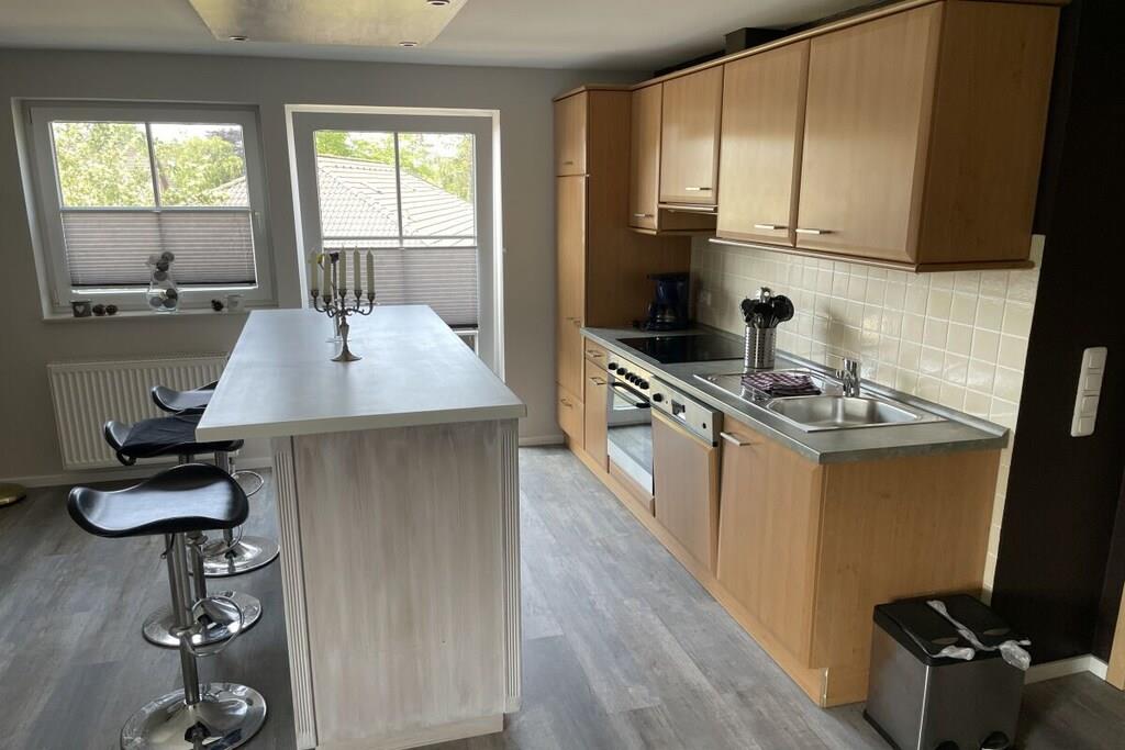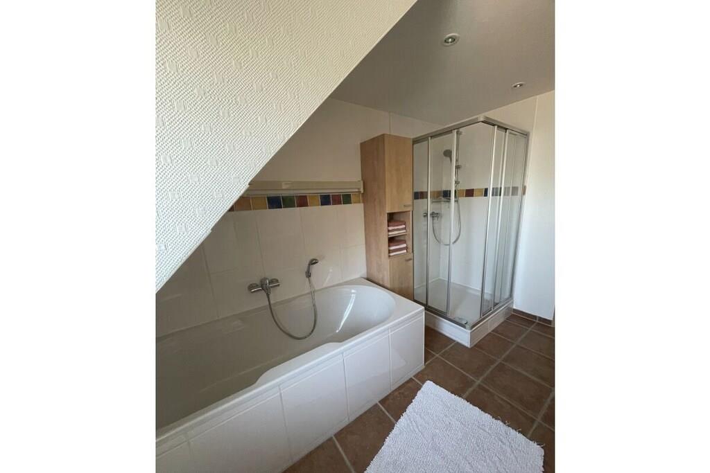 Unsere helle Wohnung hat eine Größe von 90 qm und erstreckt sich über 2 Ebenen. Sie ist gemütlich für bis zu 5 Personen eingerichtet. Im 1. OG befindet sich ein Schlafzimmer mit Einbauschränken und im Spitzboden steht ein Boxspringbett für die 3. und 4. Person (5. Person Notbett im Vorflur). Im Wohnraum steht eine Leder- Eckgarnitur. Die Küchenzeile ist komplett ausgestattet u. a. mit Ceranfeld, Backofen, Mixer, Toaster, Kaffeemaschine, Kühlschrank (Gefrierfach ****), Wasserkocher, Geschirrspüler und vielen Küchenhelfern etc. Das Badezimmer WC/Dusche und Badewanne hat viele Schränke und Ablageflächen. Auf dem Balkon steht ein Tisch mit 5 Stühlen und ein Sonnenschirm.