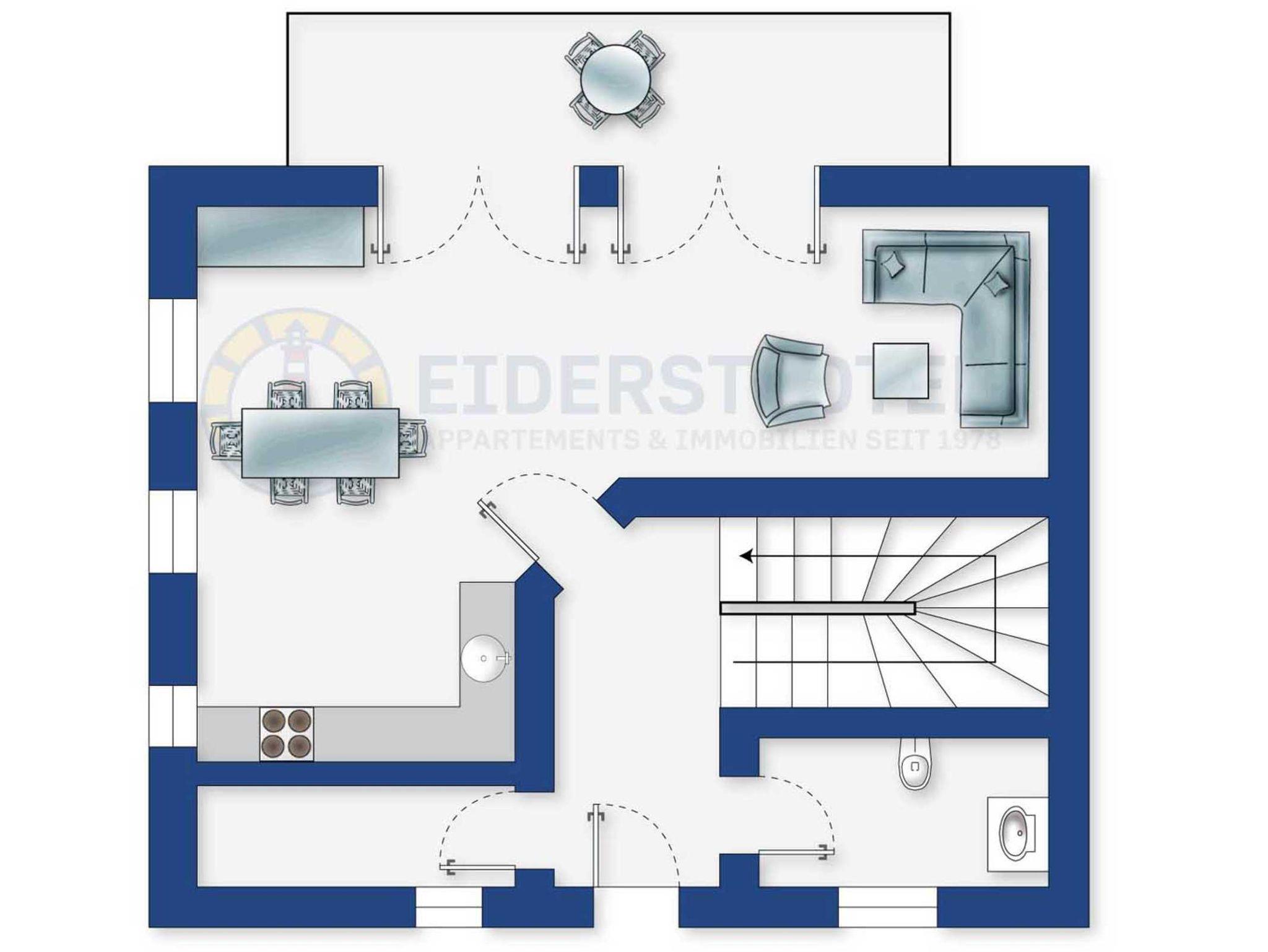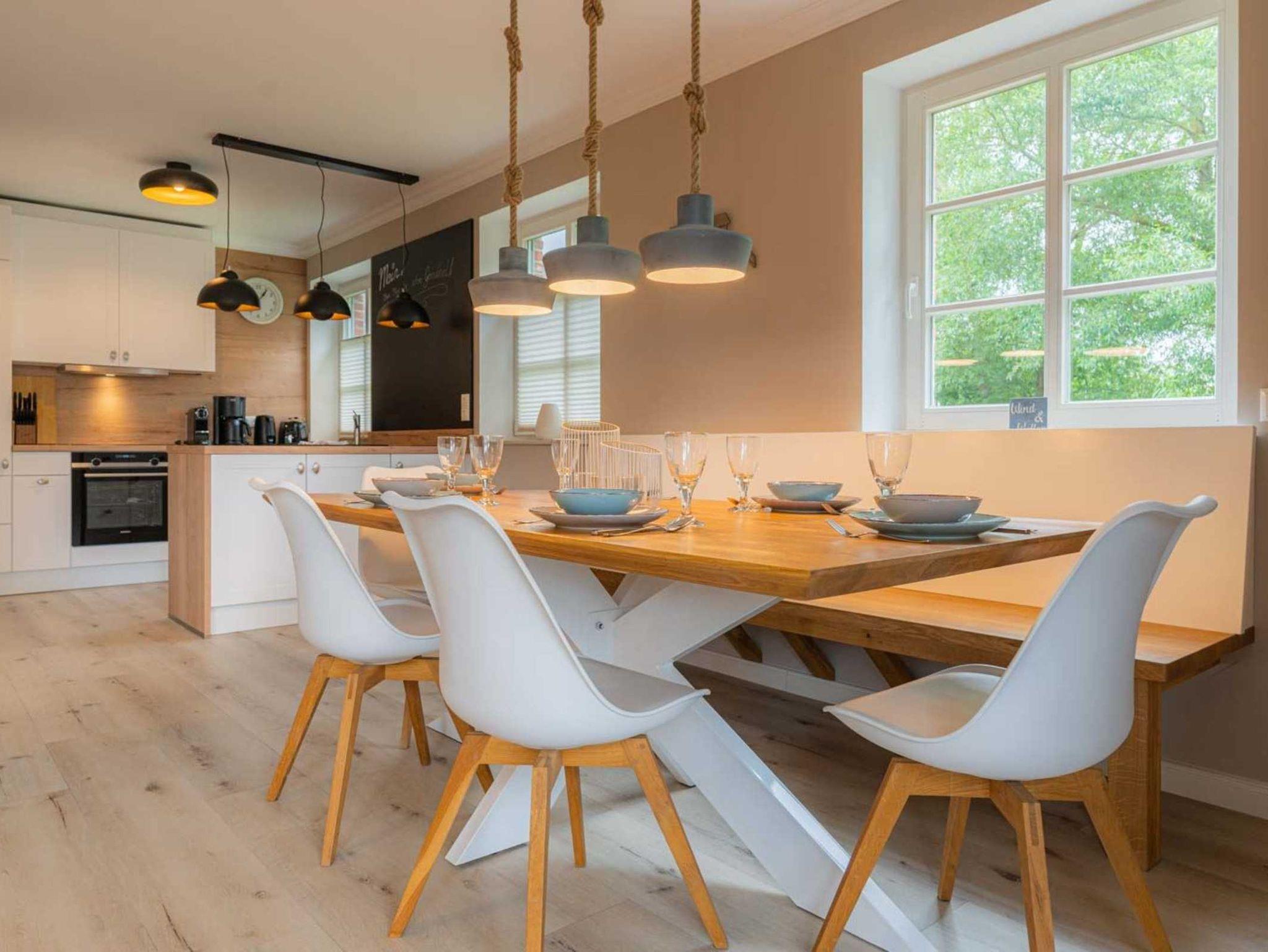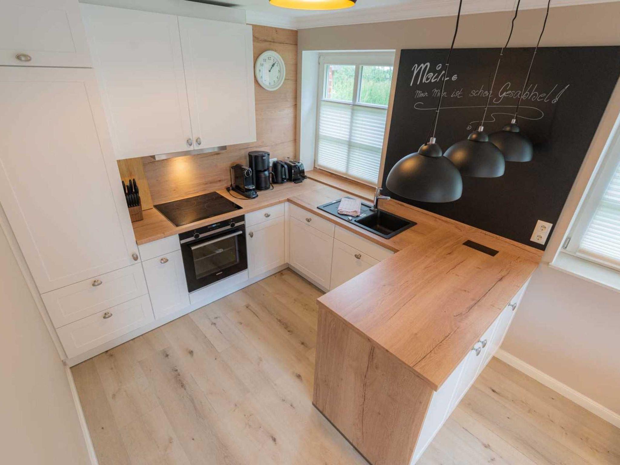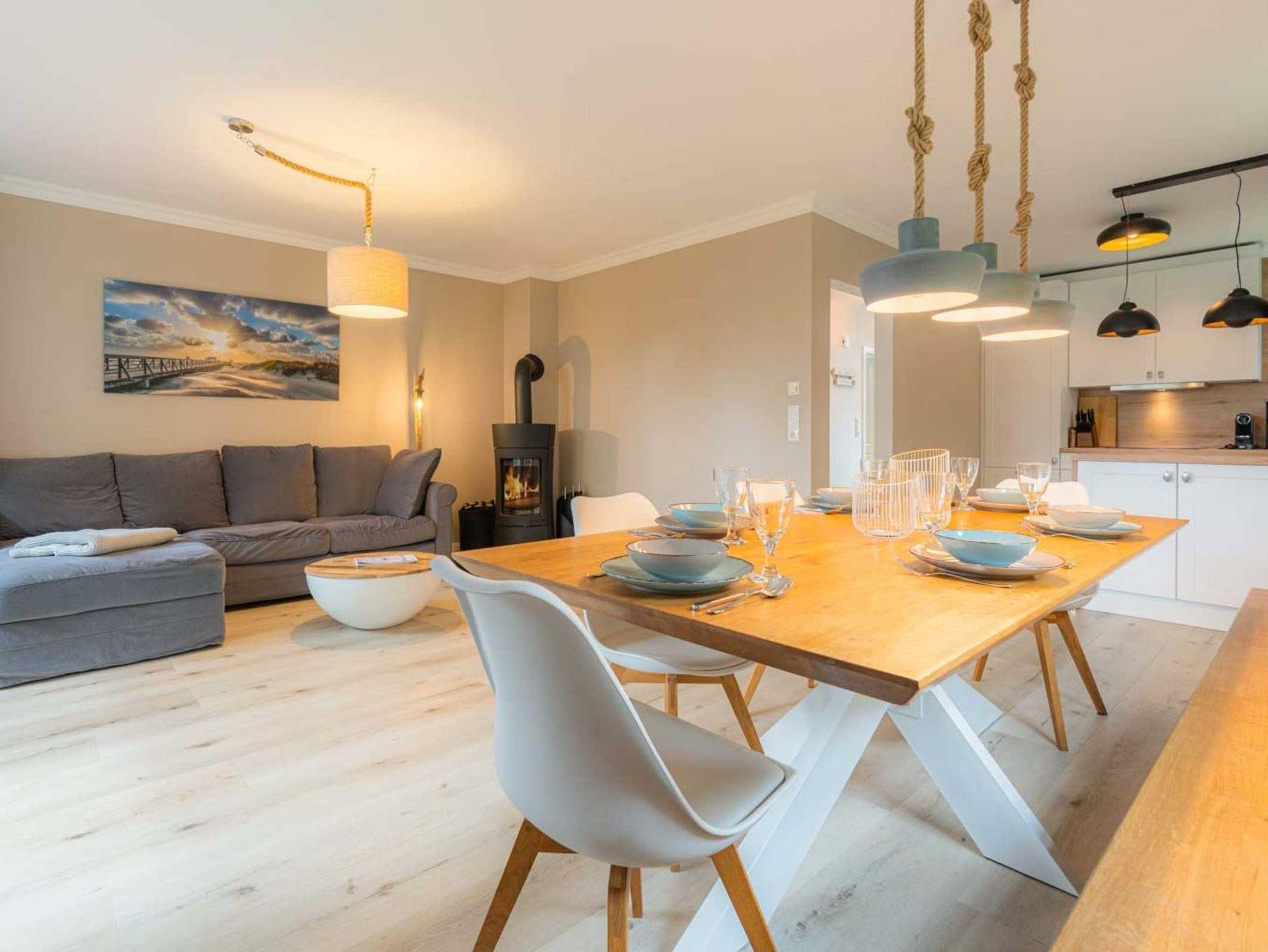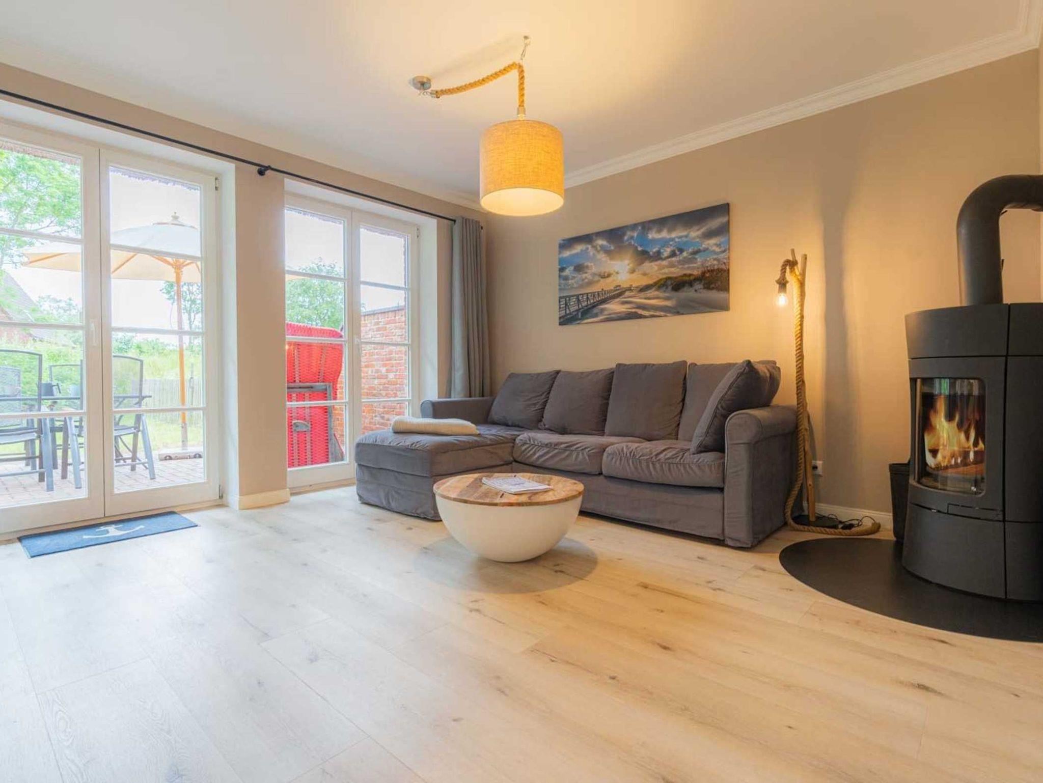 Wohnzimmer mit Ecksofa (2-3 Personen), Sessel, Kaminofen, großem TV (Sat) und Esstisch mit 4 Stühlen nebst komfortabler Sitzbank. Direkter Zugang zur möblierten Gartenterrasse mit Strandkorb nach Südwesten. Offene Küche mit Backofen, Geschirrspüler, Kühlschrank mit Gefrierfach und Nespressomaschine. Eine Mikrowelle steht im Abstellraum unter der Treppe.