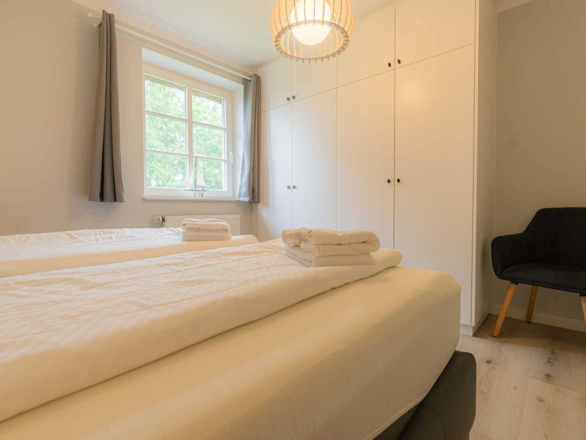 1. Schlafzimmer mit Doppelbett (Boxspring, 180x200cm), Einbaukleiderschrank und Sessel.