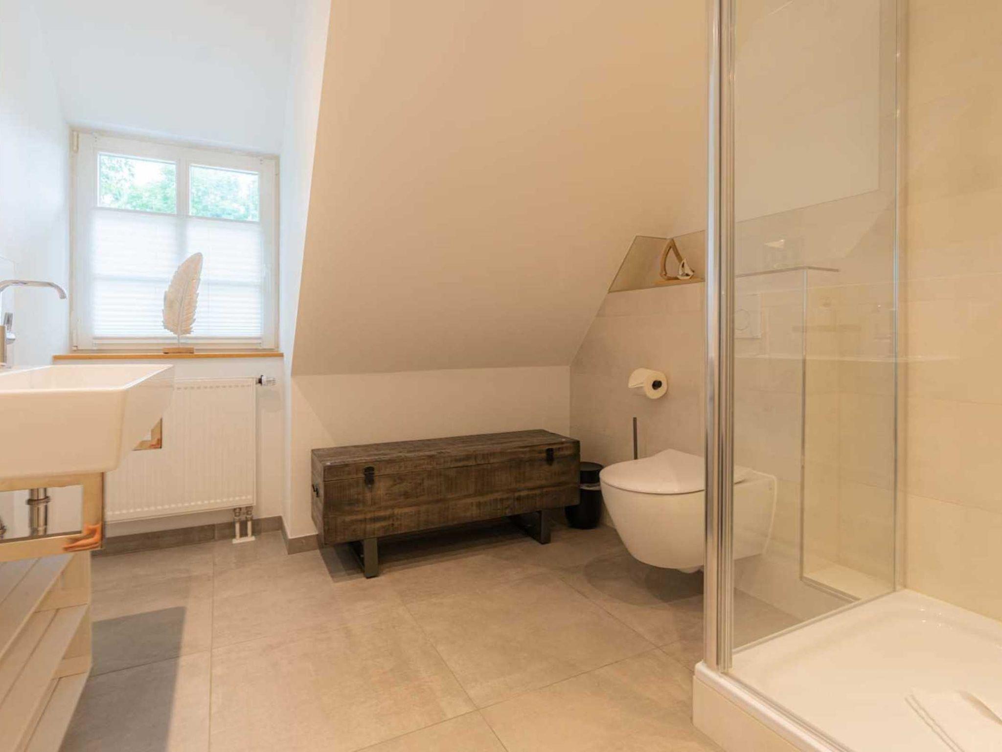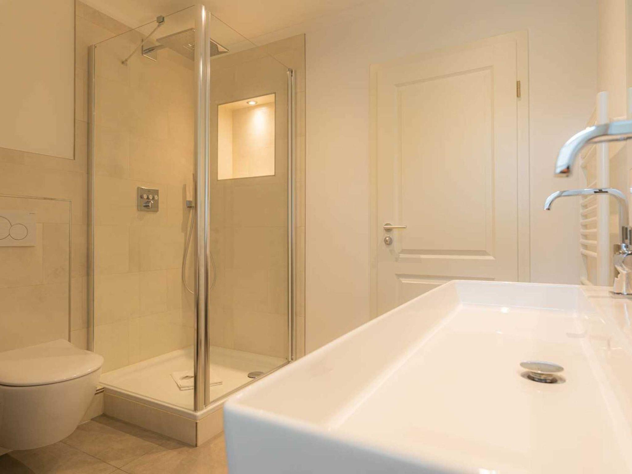 Badezimmer (Duschbad) mit Doppelwaschbecken, Regen-Dusche (ca. 85x85 cm, niedriger Eintritt: nur 15 cm), WC, Handtuchwärmer, Tageslicht und Föhn.