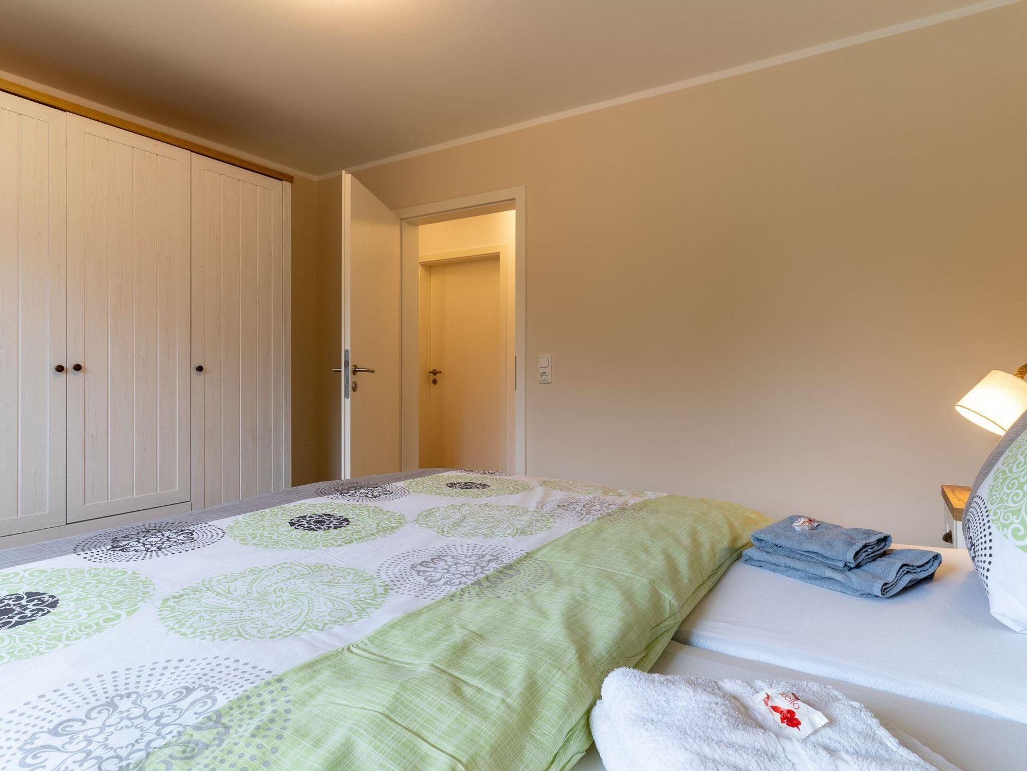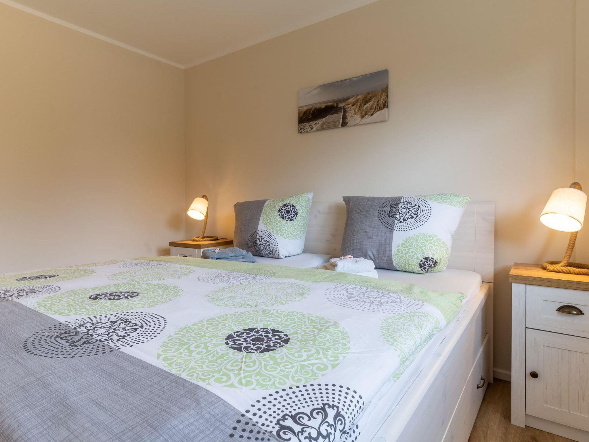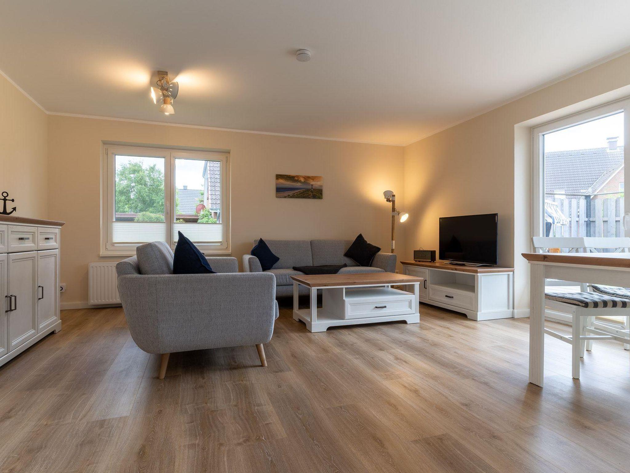 Die Erdgeschoß-Ferienwohnung ist frisch renoviert und besticht durch eine geschmackvoll und zeitlose Einrichtung. Hinter der Eingangstür befindet sich direkt auf der linken Seite das 1. Schlafzimmer mit einem französischen Bett. Über den Flur gelangt man in die großzügige Wohn-Essküche von der man auch Zugang zur Terrasse hat. Im weiteren Flurverlauf hat man zur rechten das 2. Schlafzimmer mit einem 1,80x2,00 m großen Bett und da hinter direkt das Dusch-Wannenbad. Ebenfalls ein Hauswirtschaftsraum grenzt an den Hausflur wo sich die Waschmaschine befindet.