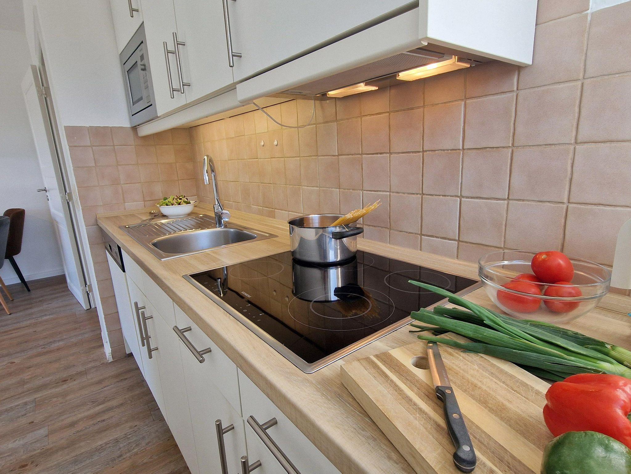 • komplett eingerichtete Küche mit Ceranfeld, Mikrowelle, Geschirrspüler, Kühlschrank mit Gefrierfach, Wasserkocher, Kaffeemaschine (Filter), Toaster.