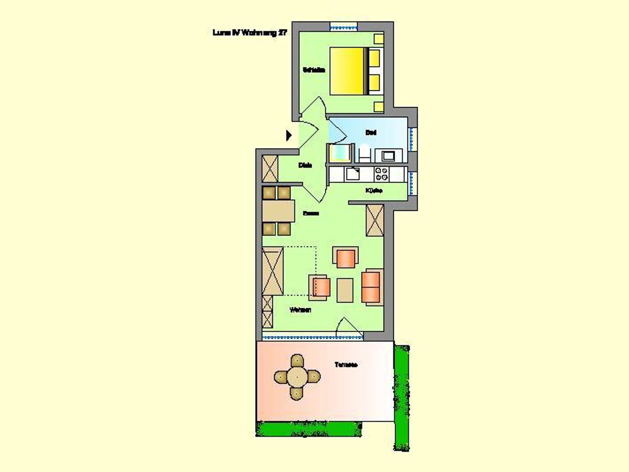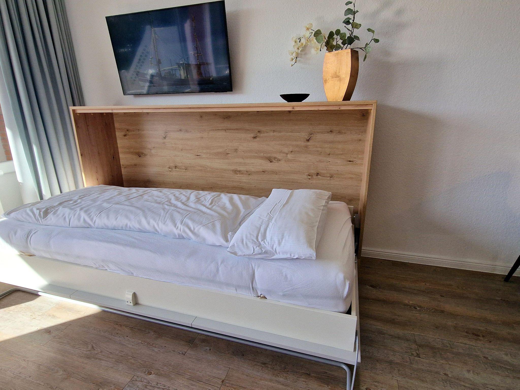 Die 50 qm teilen sich wie folgt auf: Eingangsdiele mit Garderobe, Schlafzimmer mit Doppelbett, Duschbad mit WC.Der großzügige Wohnraum mit direktem Zugang zur Terrasse und Garten überzeugt mit seiner gemütlichen Sitzecke mit direktem Blick nach draußen, der modernen, weißen Küche , der Essecke und als weitere Schlafmöglichkeit 1 Doppelschrankbett,