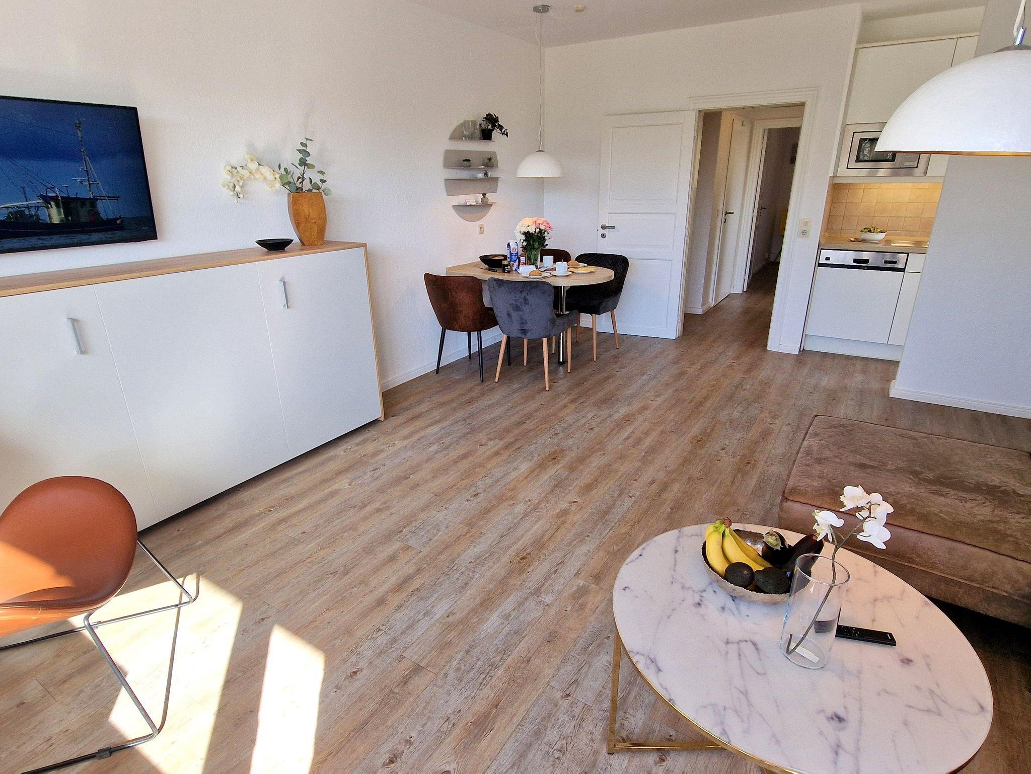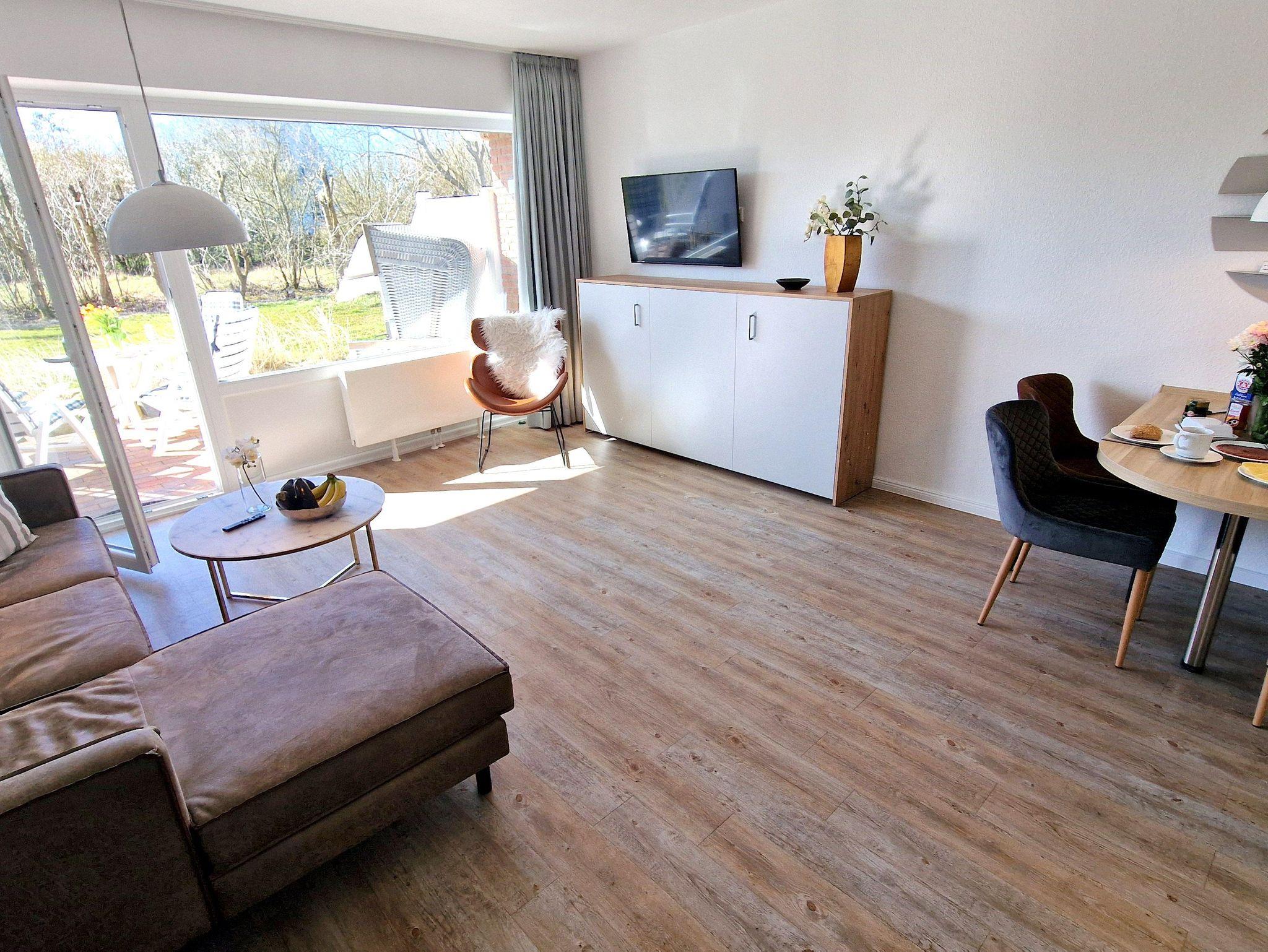 Sie teilt sich wie folgt auf: Eingangsdiele mit Garderobe, Schlafzimmer mit Doppelbett ( 180x200), Duschbad mit WC. Der großzügige Wohnraum mit direktem Zugang zur Terrasse und Garten überzeugt mit seiner gemütlichen Sitzecke und dem direkten Blick nach draußen. Moderne, weiße Küche, Essecke und als weitere Schlafmöglichkeit 1 Doppelschrankbett. Die Fußböden der Ferienwohnung sind aus Designerparkett oder Fliesen. Allergikergeeignet.