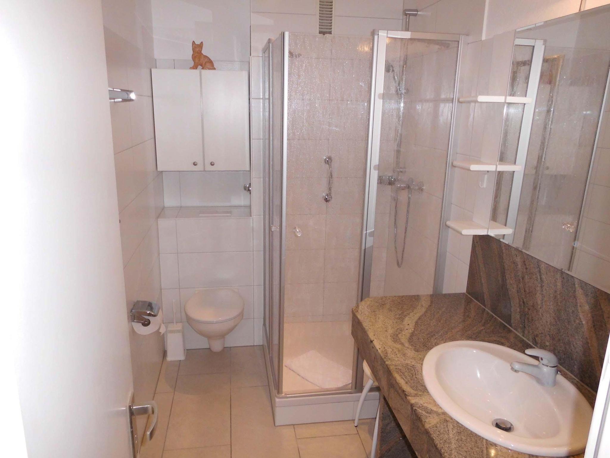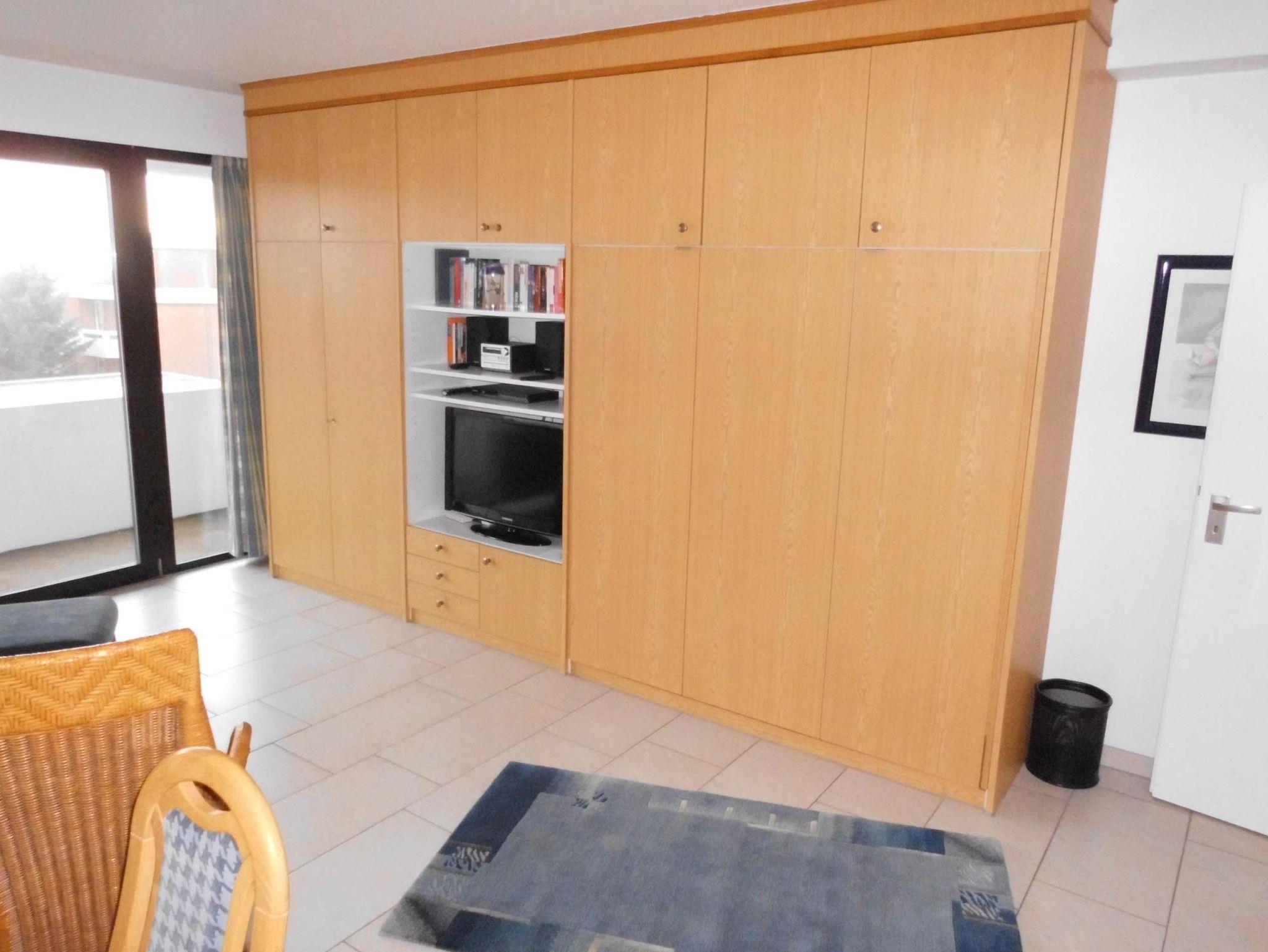 Schlafraum mit 2 Einzelbetten, Wohn-Schlafraum mit 2 Wandschrankbetten, Fußboden ist gefliest, Sitzecke, Essecke, Küchenzeile mit Backofen, Dusche/WC, Kabel-TV, Durchwahltelefon, Balkon, PKW-Platz-Nr. 55, Aufzug und Fahrradkeller.