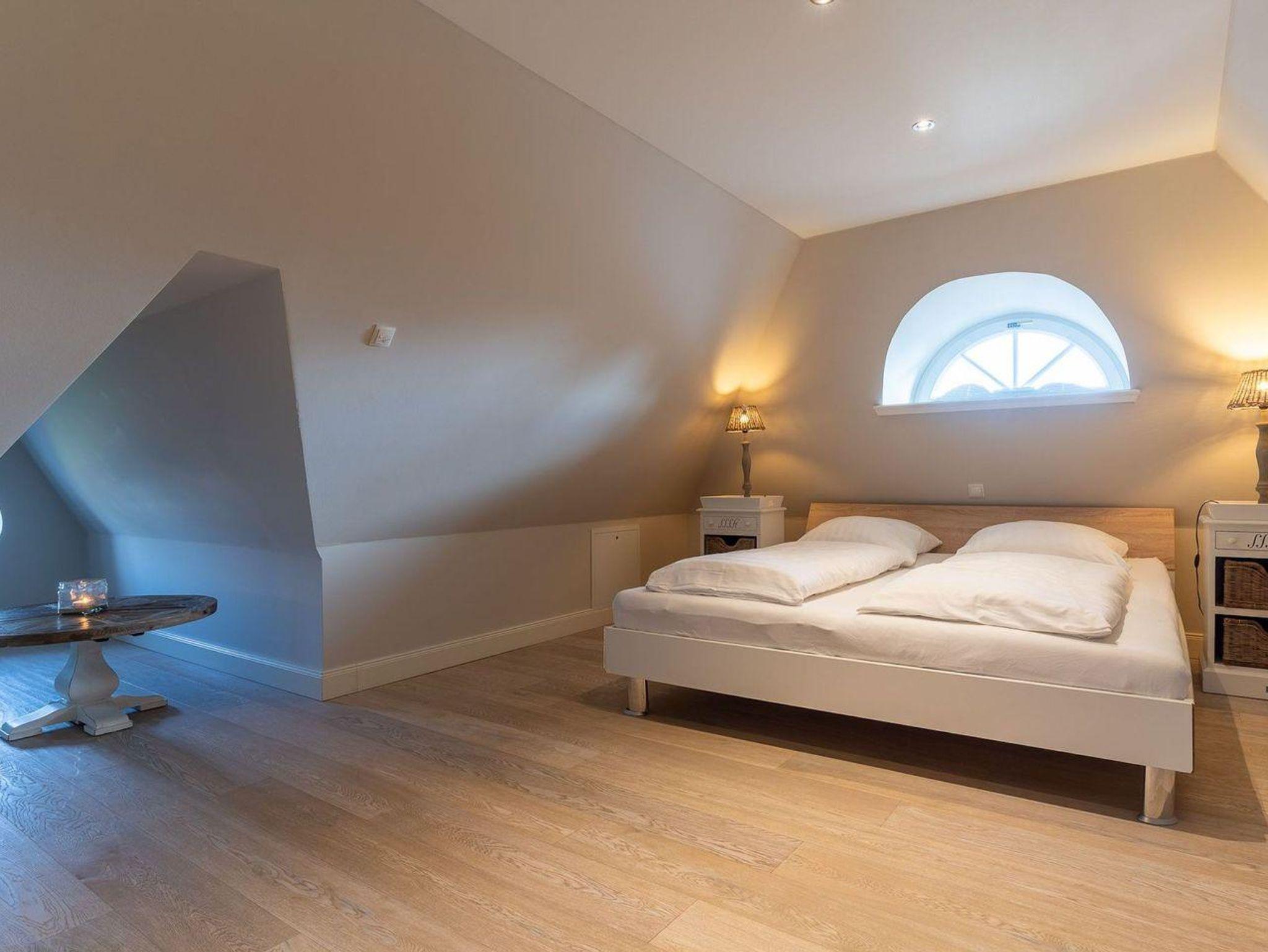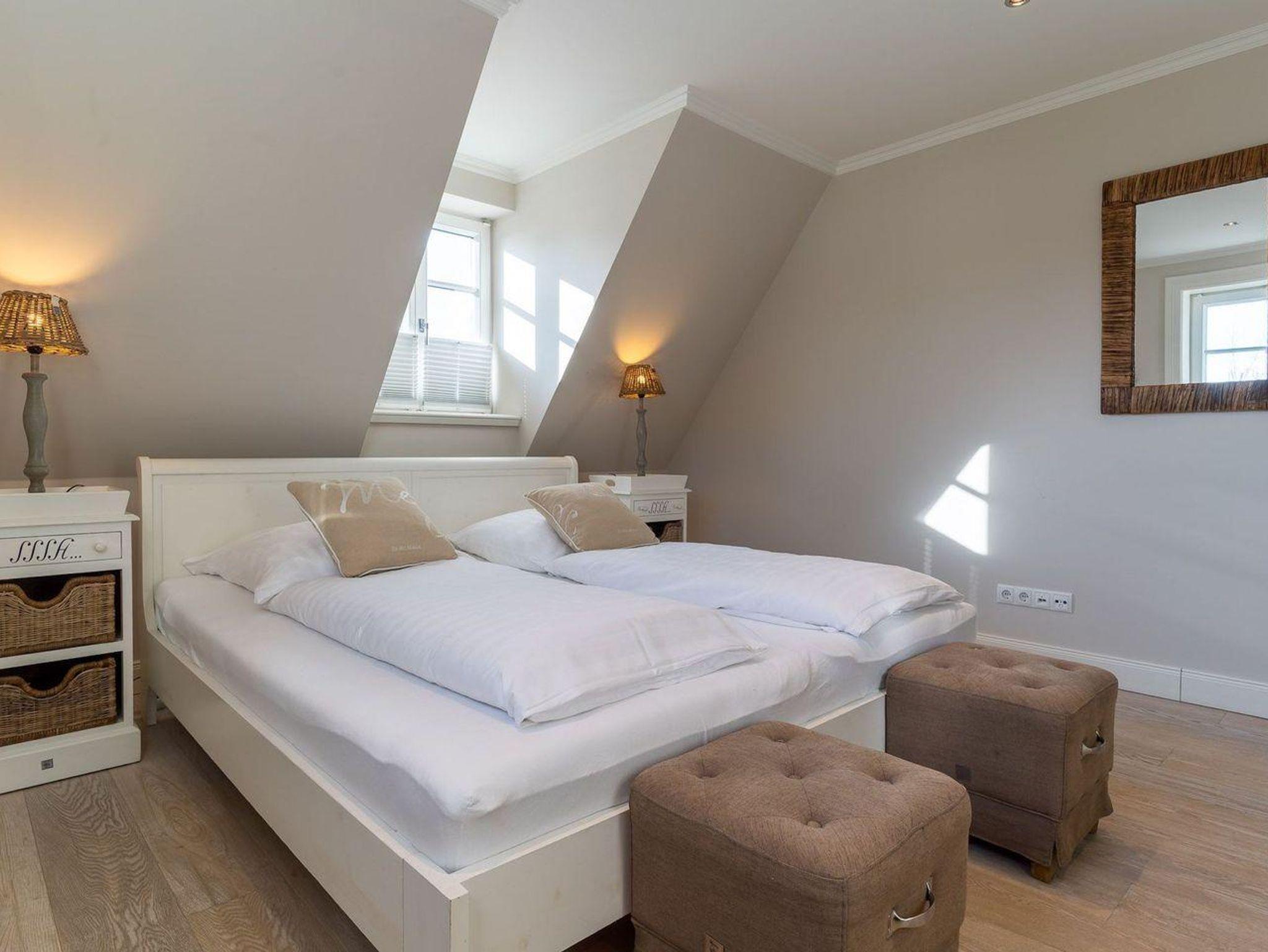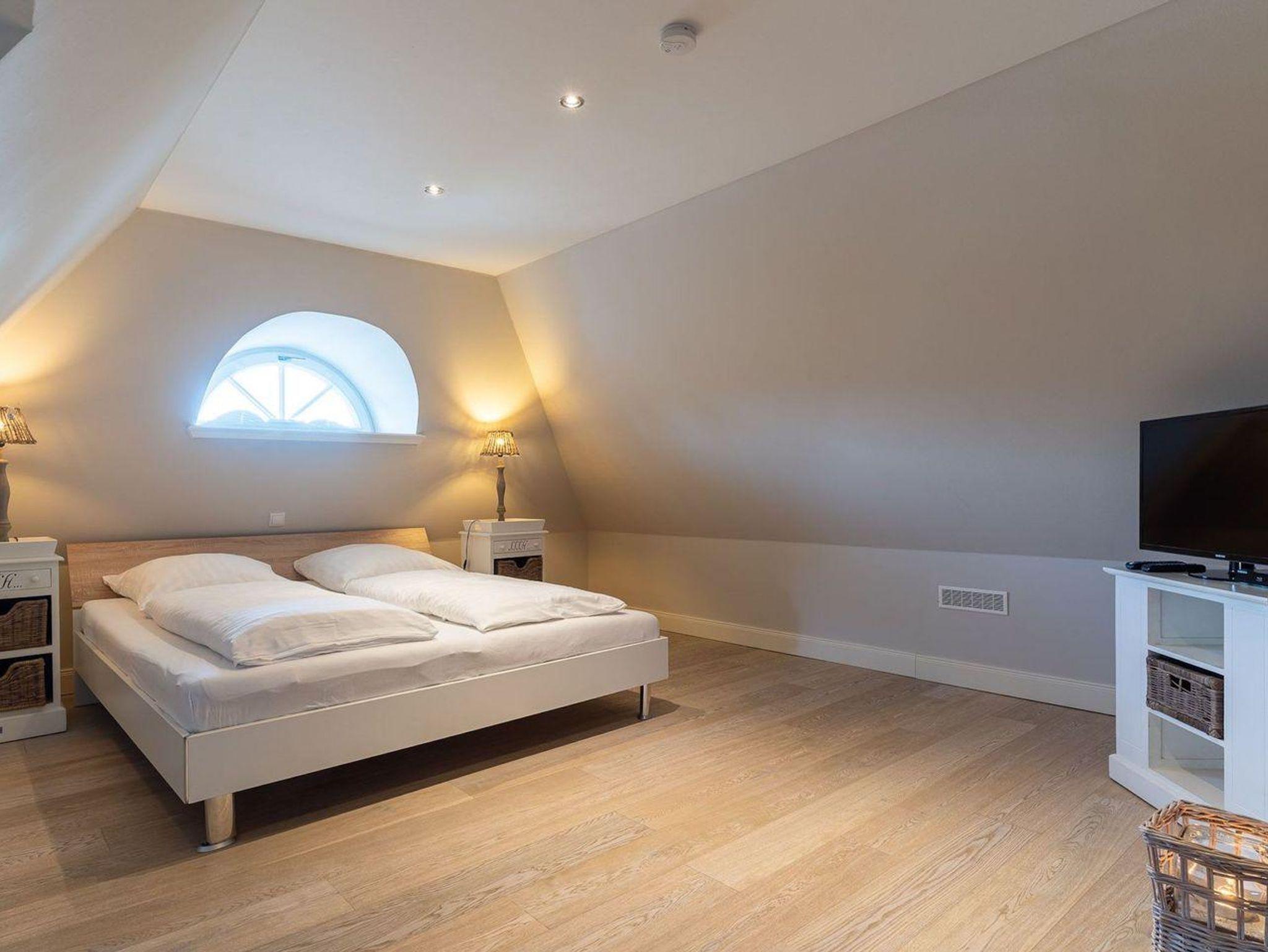 Über eine weitere Holztreppe geht es vom Flur ins Dachgeschoss mit gemütlichem Doppelbett und Flatscreen TV+DVD.
