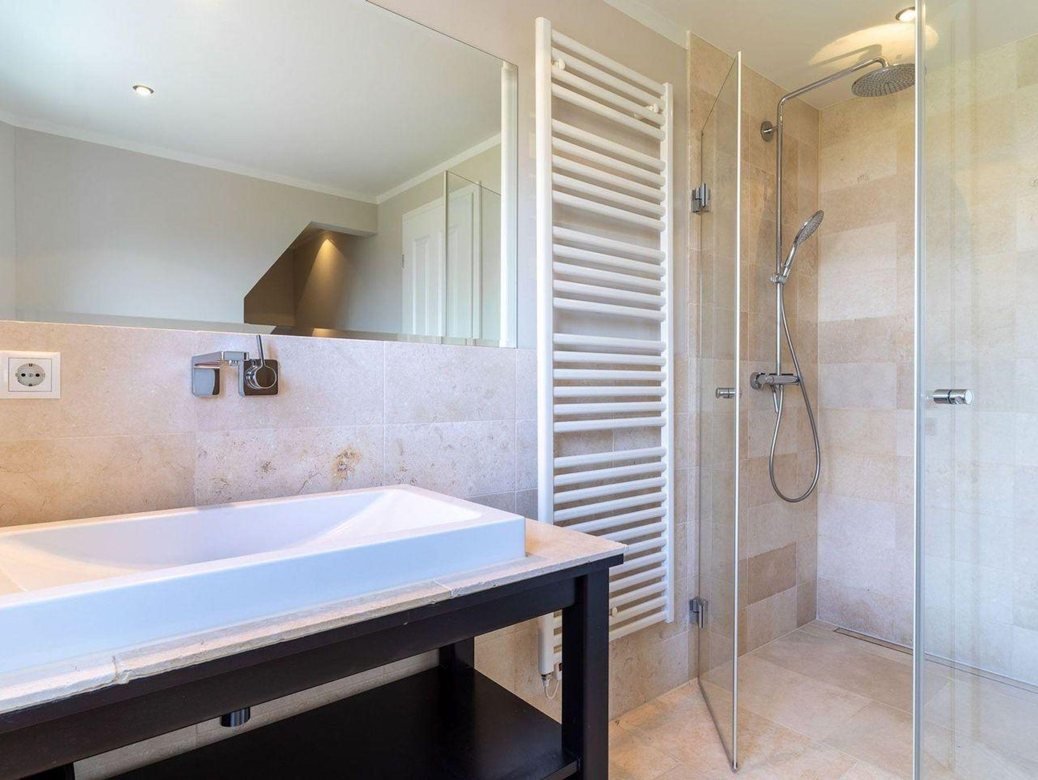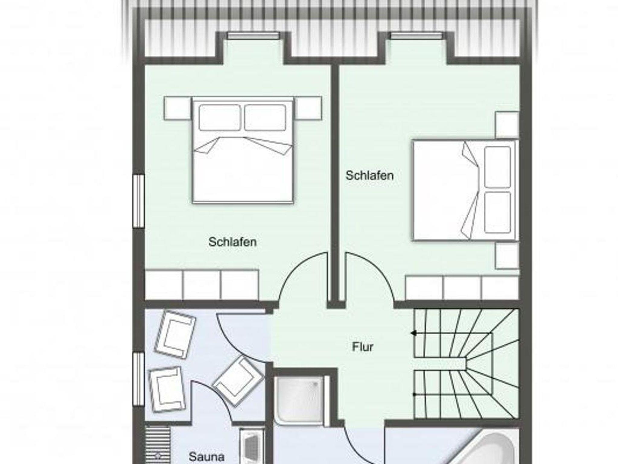 Über eine Holztreppe gelangt man in das Obergeschoss mit zwei großzügigen Schlafzimmern, einem Vollbad mit Dusche und Eckbadewanne sowie einem Saunaraum mit gemütlicher Ruhezone.