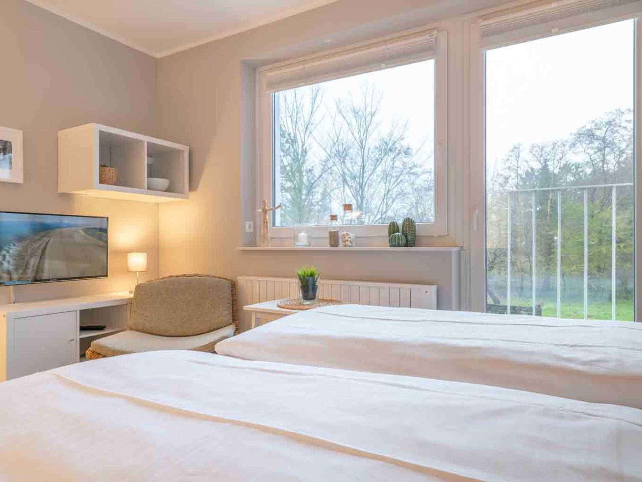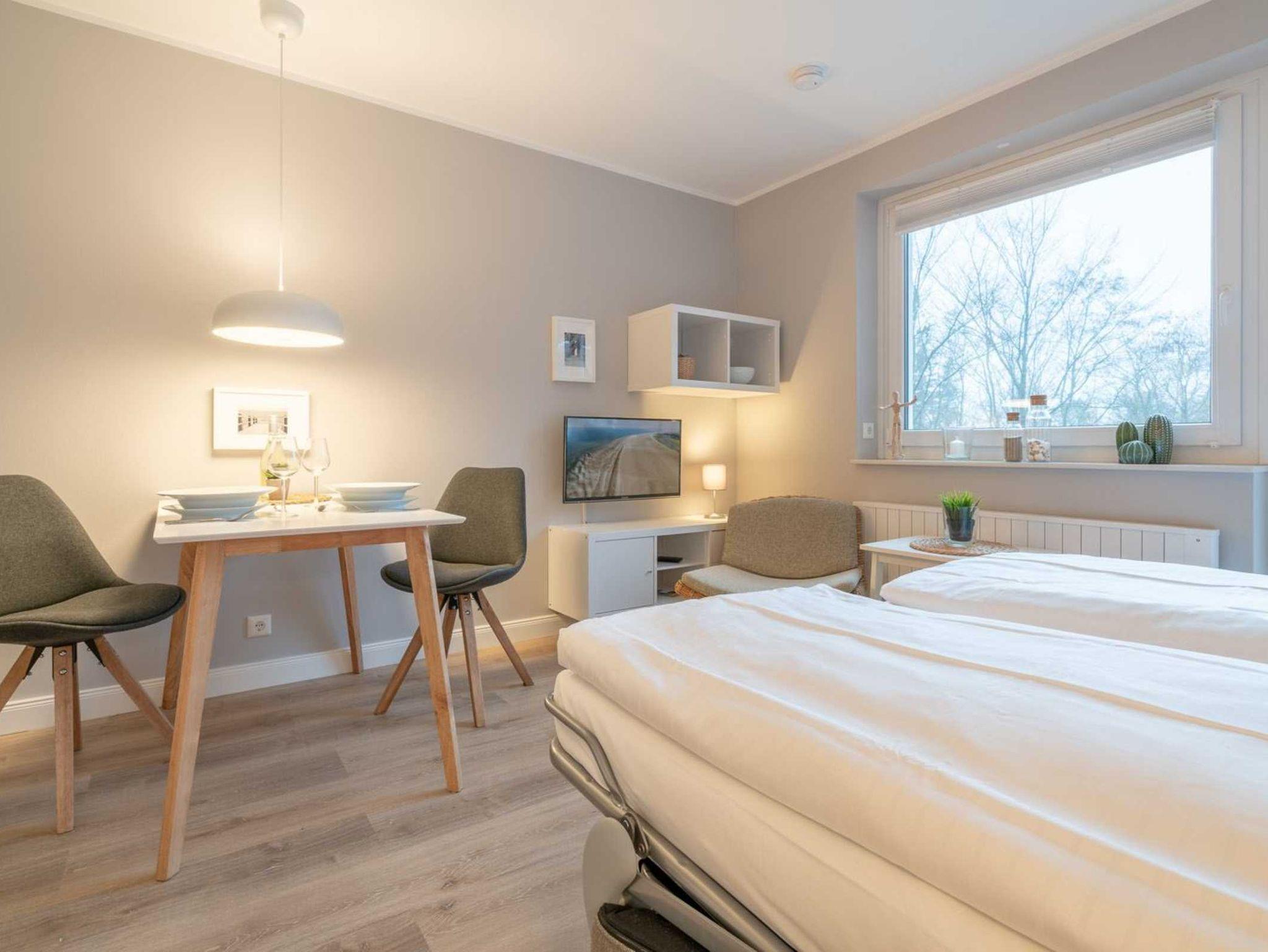 Wohn- und Schlafzimmer mit ausklappbarem Schlafsofa (160x195cm, mit rückenfreundlichem Ergoflex-Lattenrost und Matratze), Sessel, Esstisch für 2 Pesonen, TV (Sat) und CD-Player mit Radio. Französischer Balkon. Offene Küche mit Herd mit 2 Kochstellen, Backofen, Geschirrspüler und Kühlschrank mit Gefrierfach.