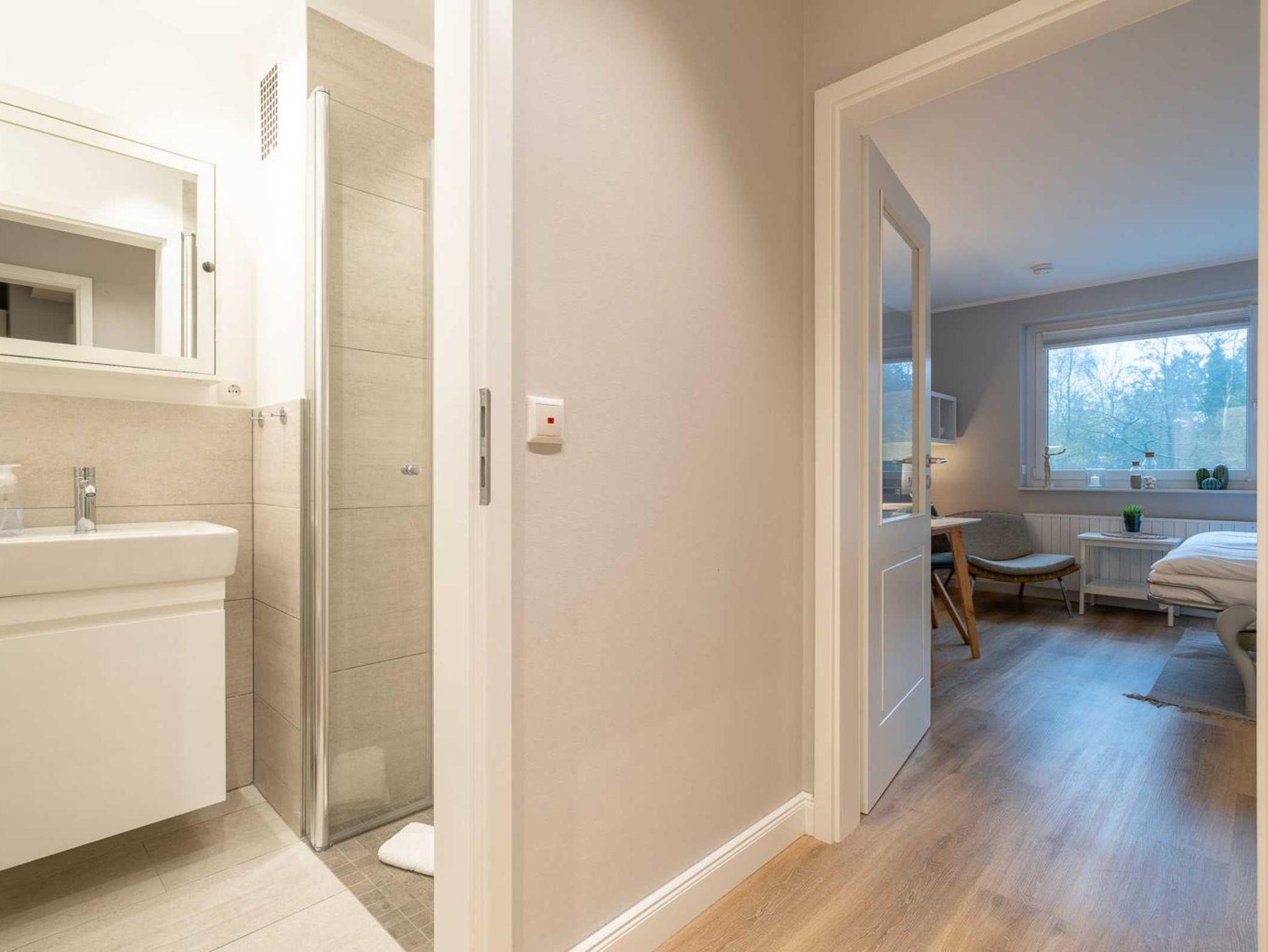 Badezimmer (Duschbad) mit Dusche, WC und Föhn.