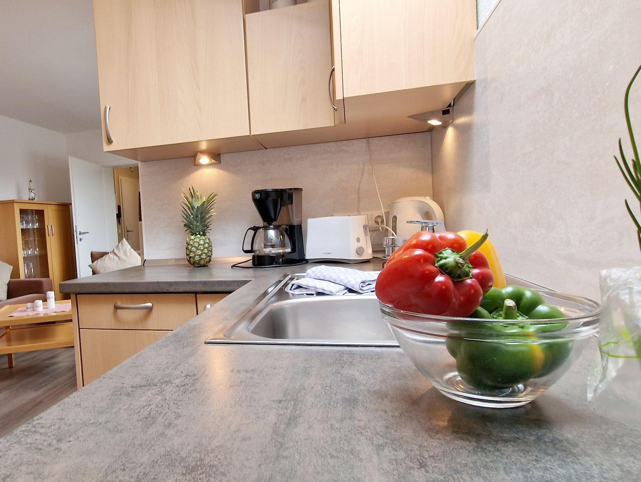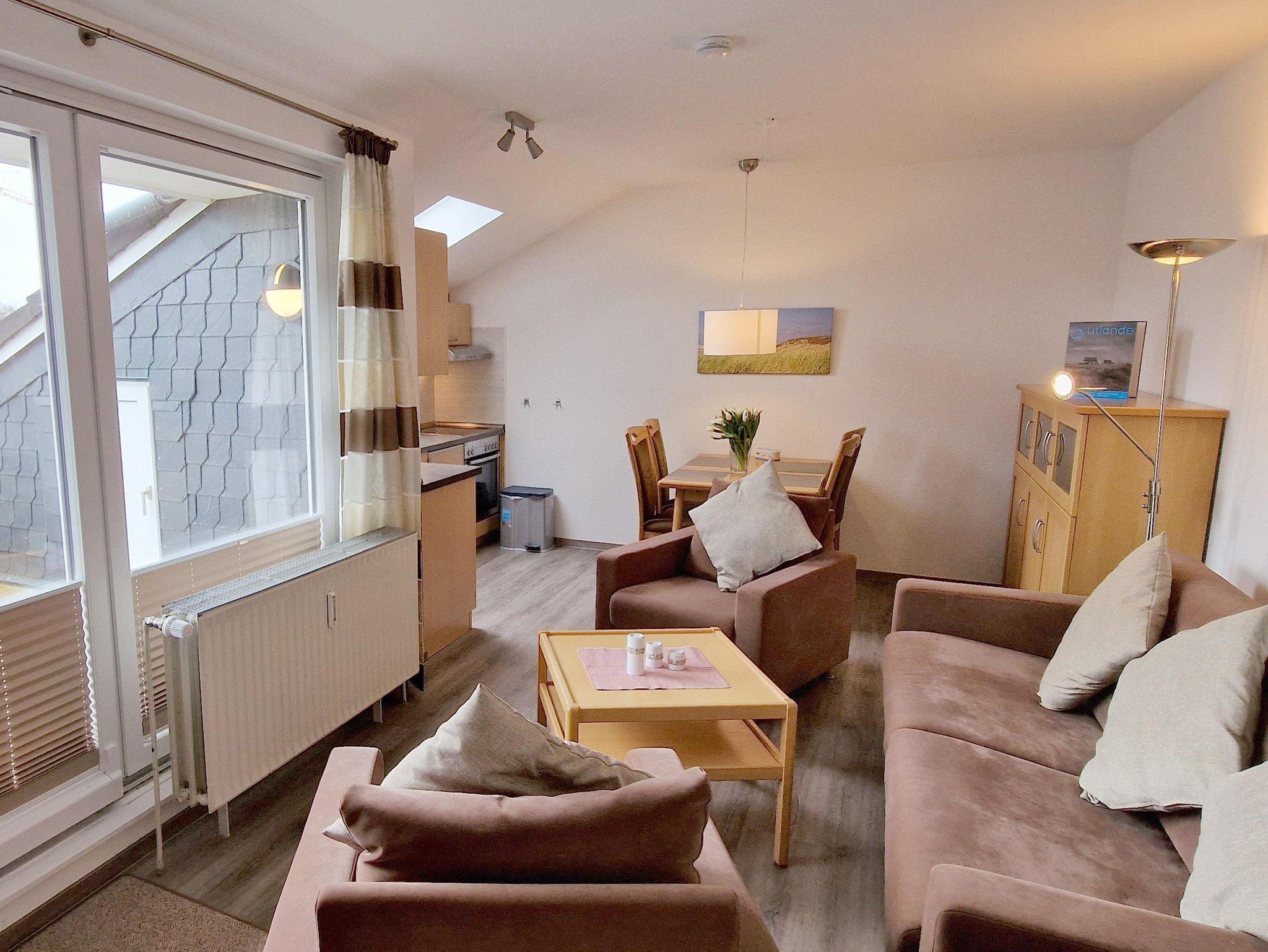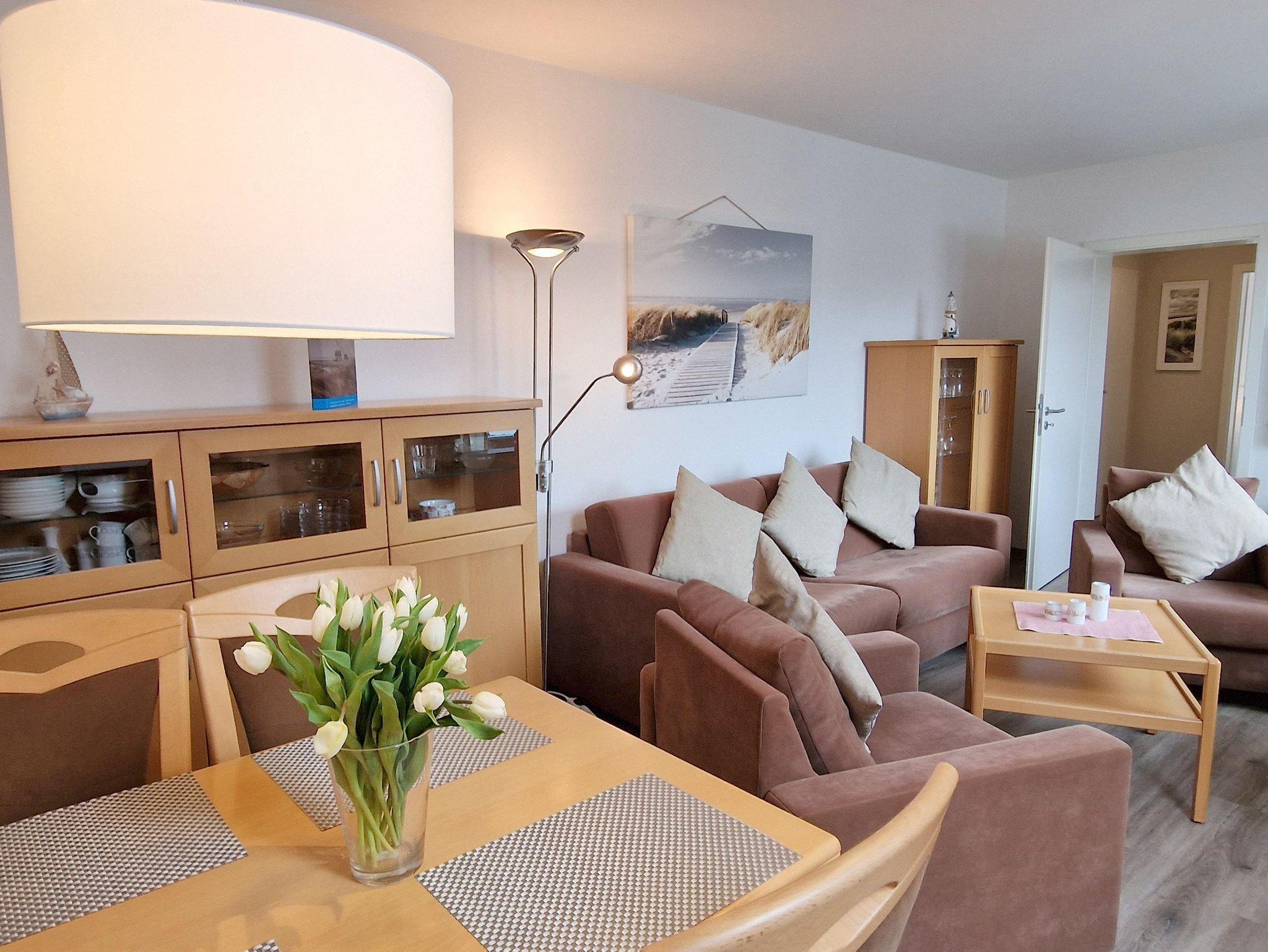 In der schmucken 2-Zimmer-Ferienwohnung Haus Nordsee Nr. 17 können Sie mit bis zu 4 Personen herrlichen Urlaub in der 2. Etage machen. Nachts spannen Sie auf der modernen Schlafcouch im Wohnzimmer oder im Doppelbett des Schlafzimmers aus. Die moderne, offene Küche mit Cerankochfeld und Backofen lädt zum Kochen, der große Süd-Ost-Balkon zum Entspannen ein.