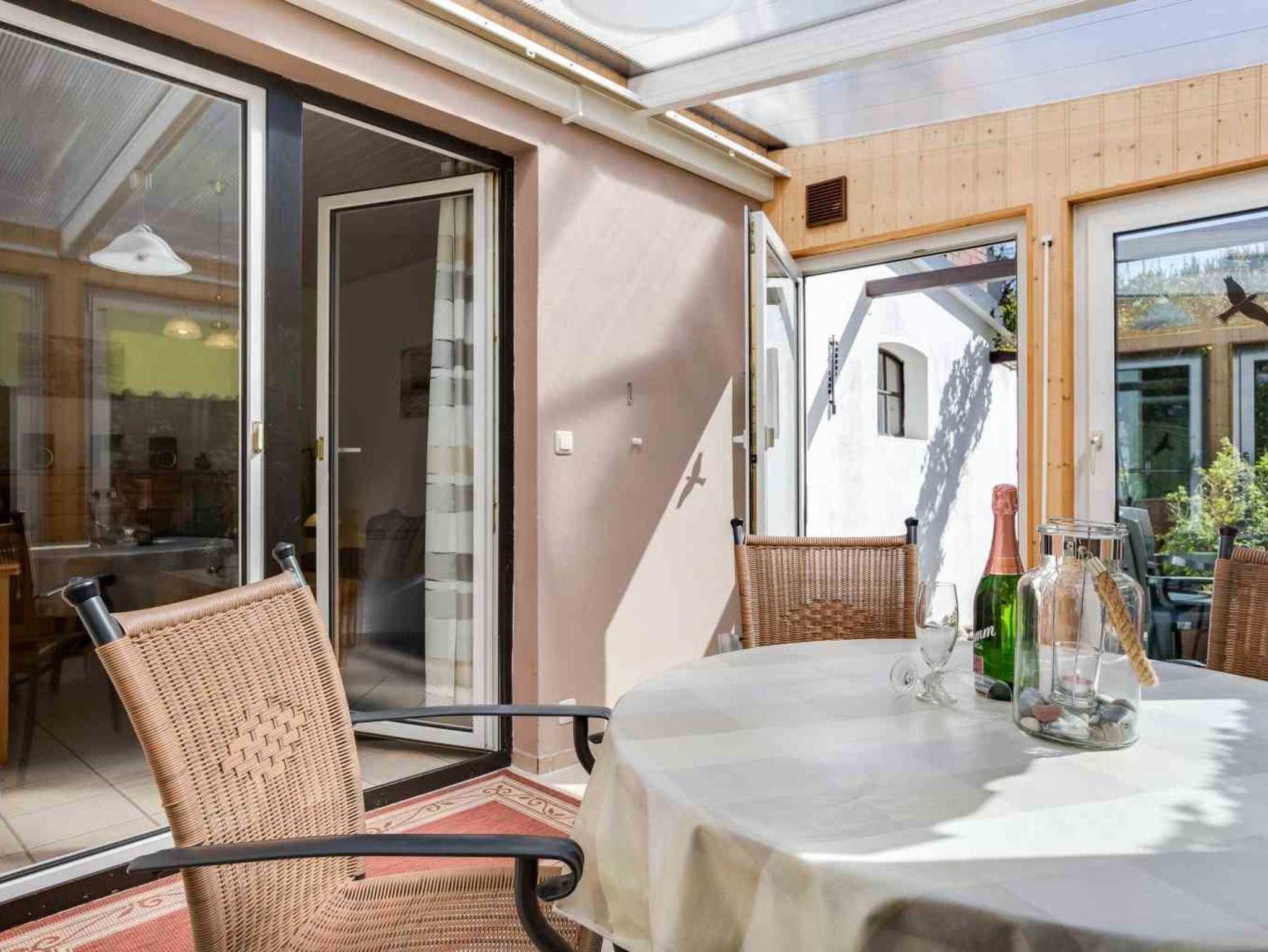 Wohnzimmer mit Schlafsofa (3er, 140x190cm), 2 Sesseln, TV (Sat), Hifi-Anlage, Esstisch mit 4 Stühlen und direktem Zugang zum blickgeschützten und hellen Wintergarten nach Westen mit Tisch und 4 Stühlen.