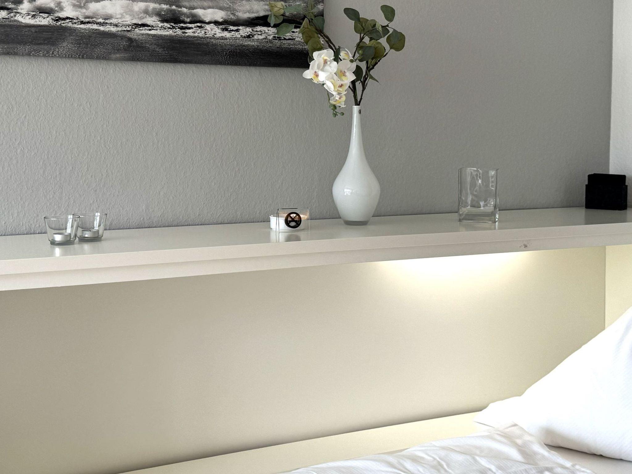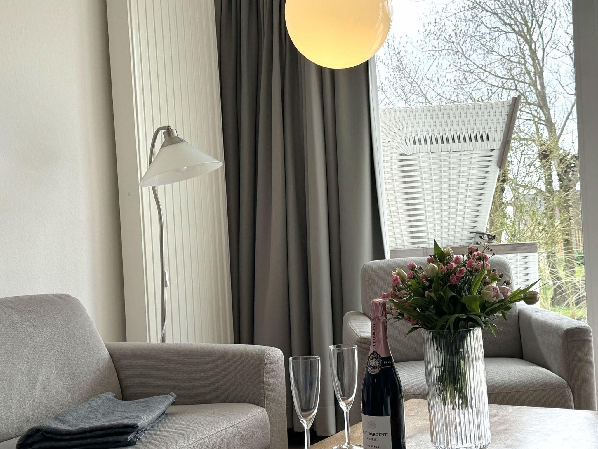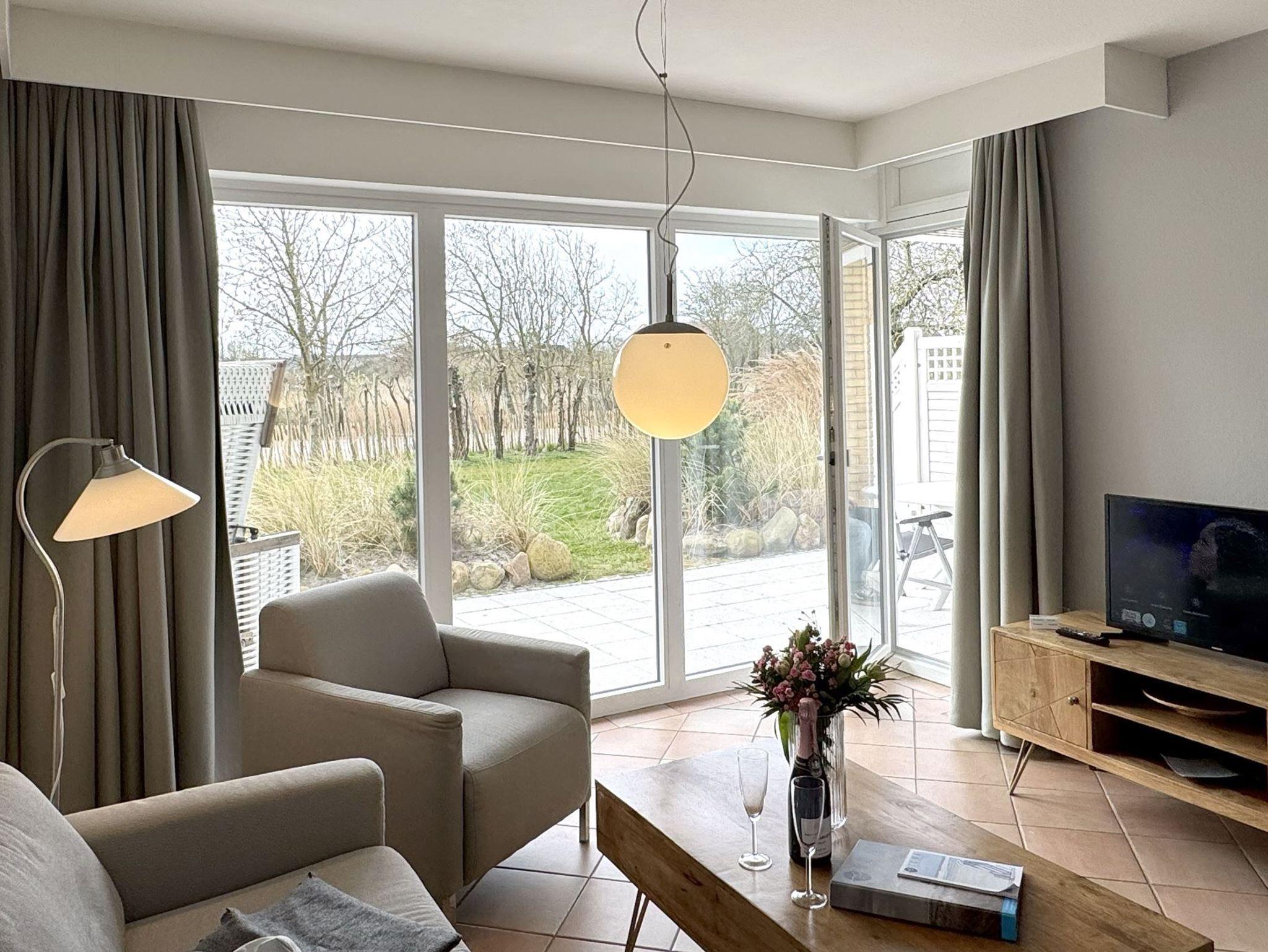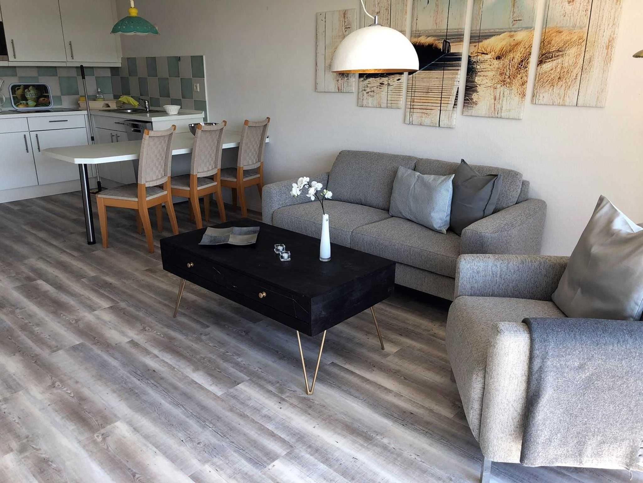 Die ca. 55 qm teilen sich folgendermaßen auf: Eingangsbereich mit Garderobe, offener Wohnraum mit Essbereich und integrierter Einbauküche,Einzelschrankbett (90x200cm,Matratze ), direkter Zugang zur Terrasse und Garten, Schlafzimmer mit Doppelbett (180x200cm,getrennte Matratzen), 1 Duschbad mit WC und Waschbecken.