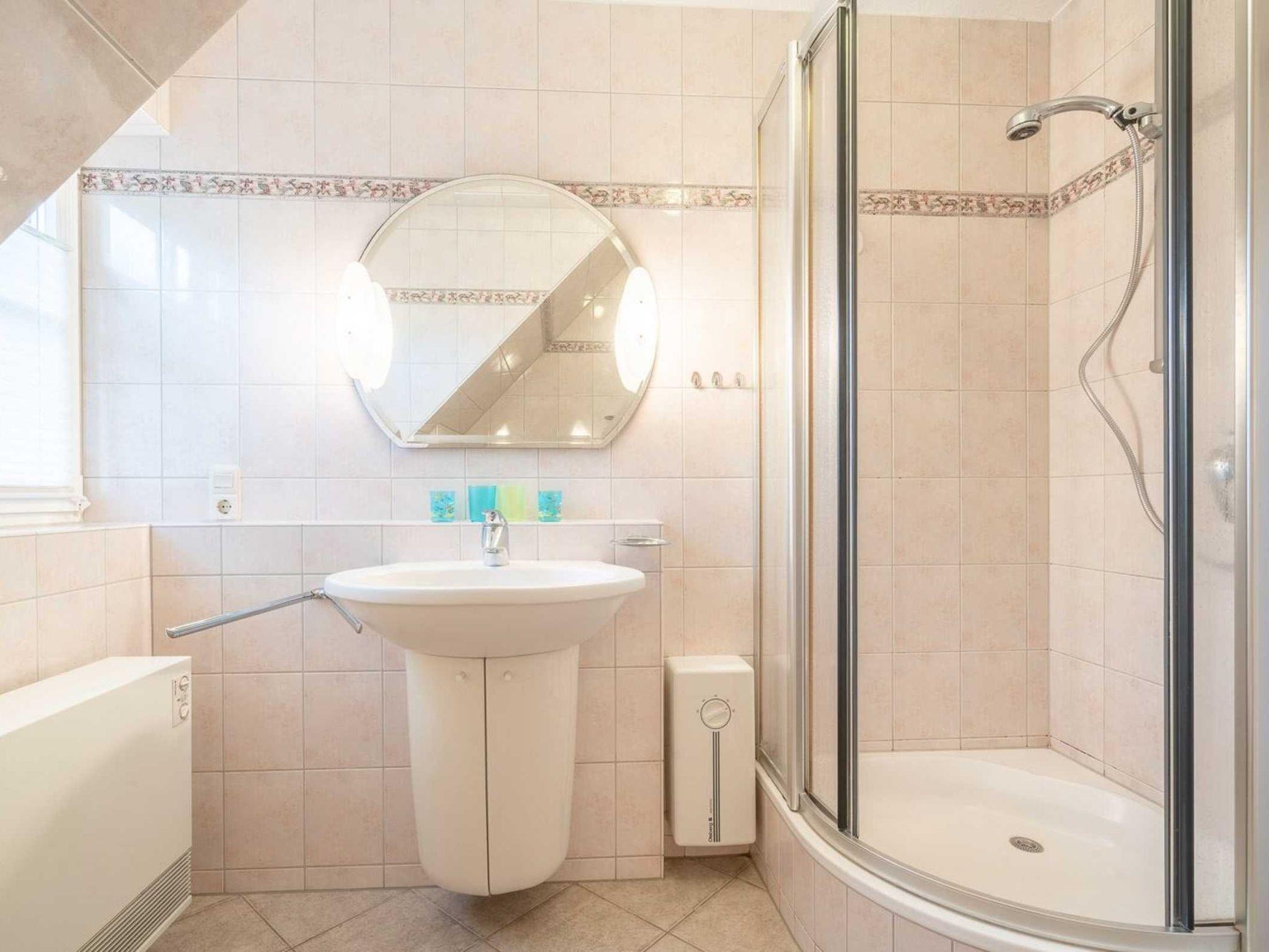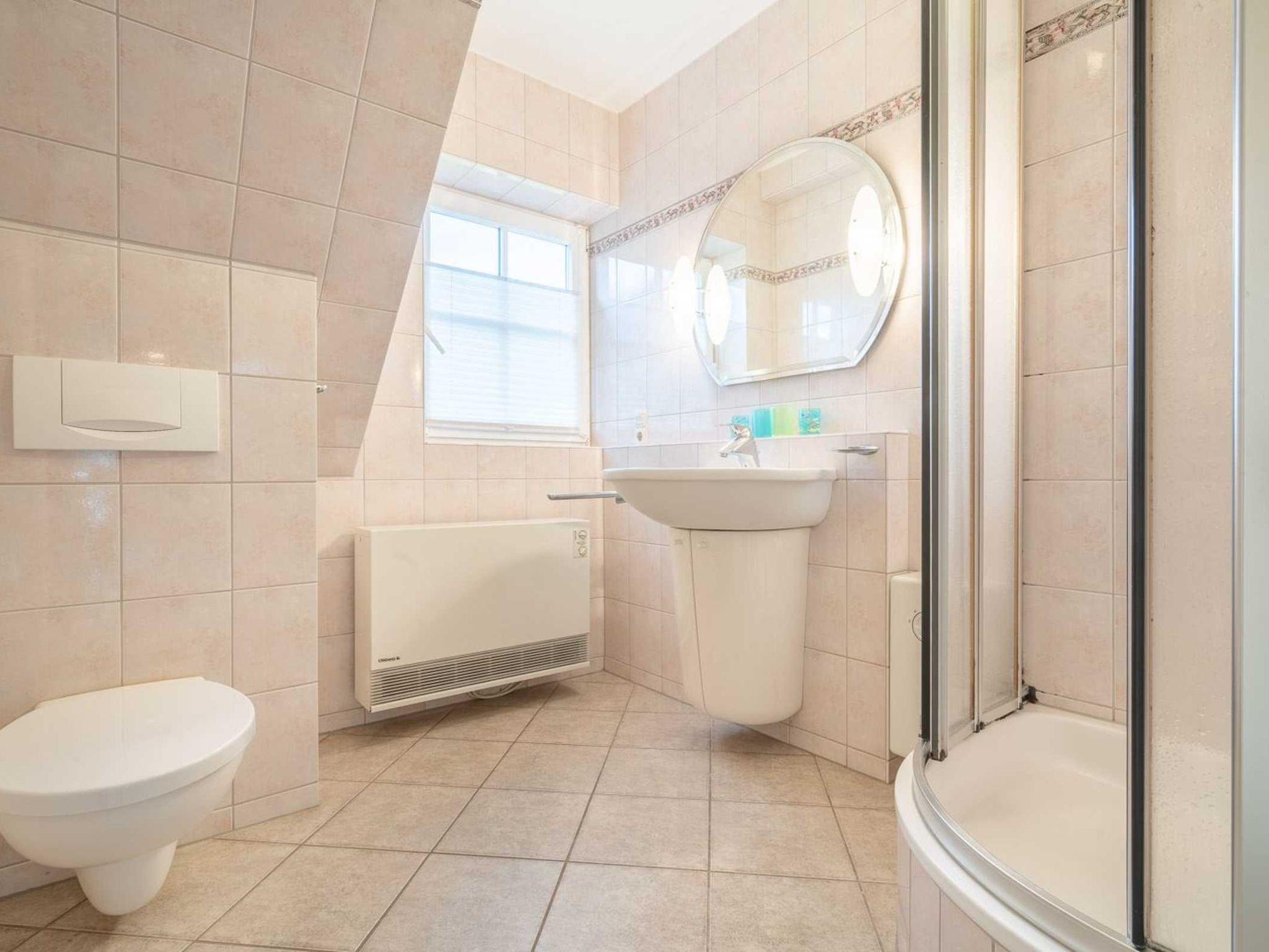 Badezimmer (Duschbad) mit Dusche, WC, Tageslicht und Föhn.