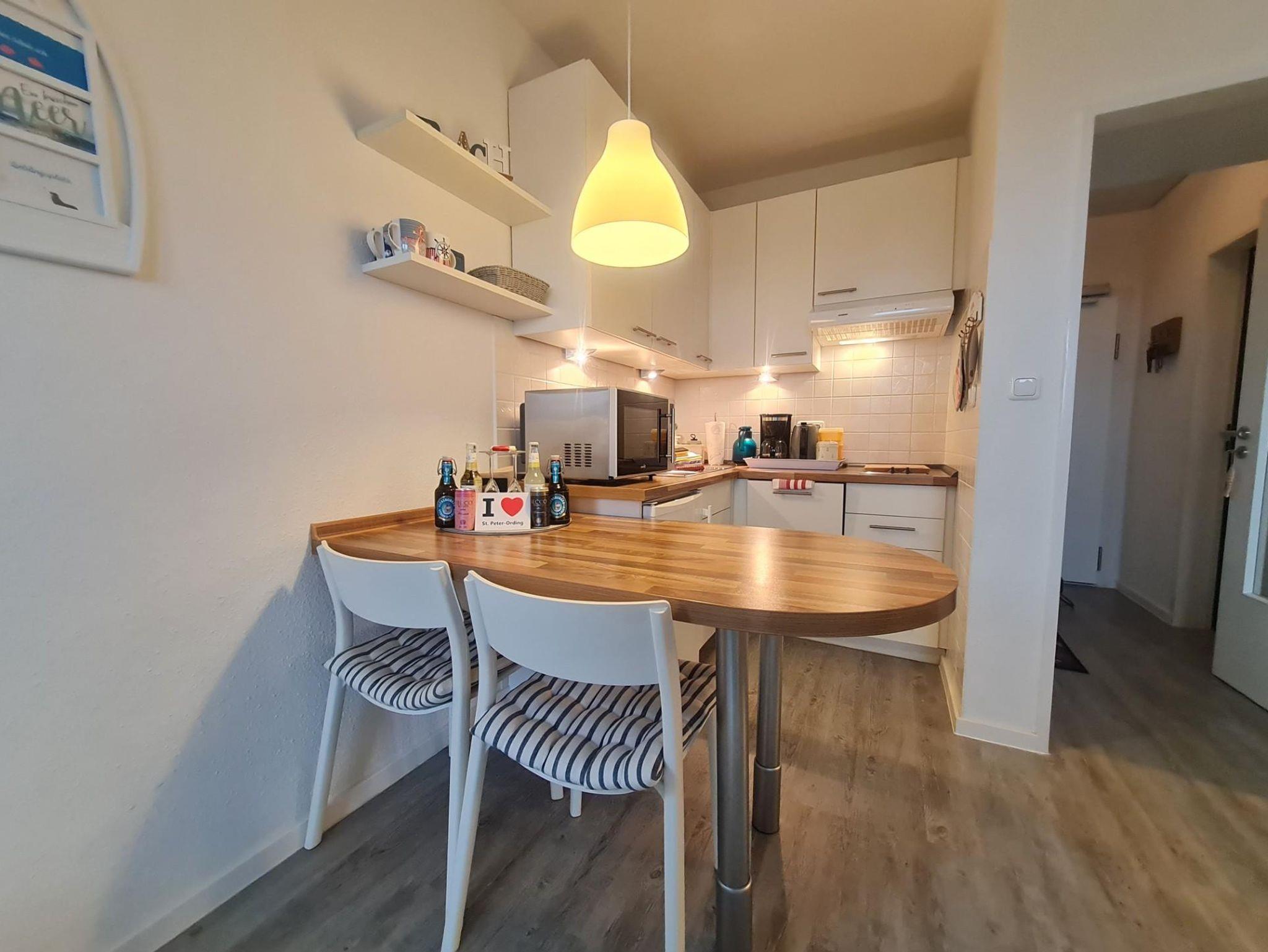 Eine kleine Küchenzeile mit Ceran-Kochfeld, Spülmaschine, Kühlschrank mit kleinem Gefrierfach , Mikrowelle mit Backofenfunktion, Wasserkocher, Kaffee-Maschine, Toaster, etc. Der Esstisch ist direkt an die Küchenzeile angegliedert.