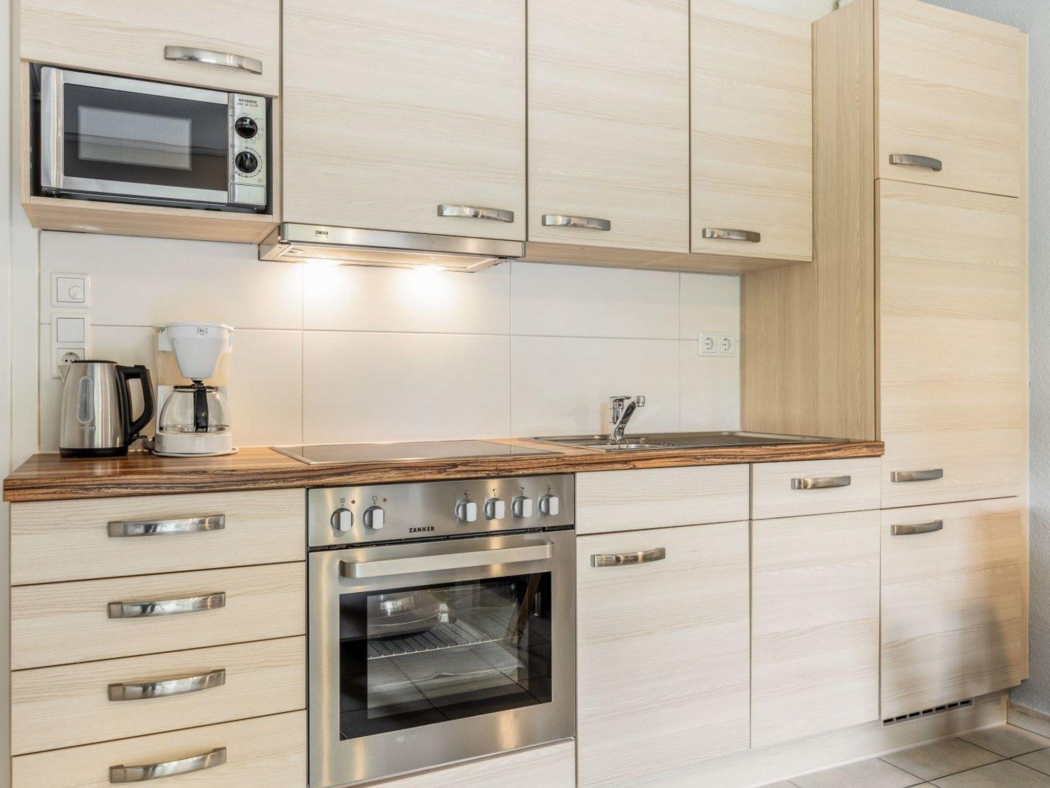 Wohnzimmer mit Sofa (2er), 1 Sessel, TV (Kabel), Radio und Esstisch mit 2 Stühlen. Direkter Zugang zur möblierten Gartenterrasse nach Süden. Komfortable offene Küche mit Backofen, Mikrowelle, Kühlschrank mit Gefrierfach und Geschirrspüler.