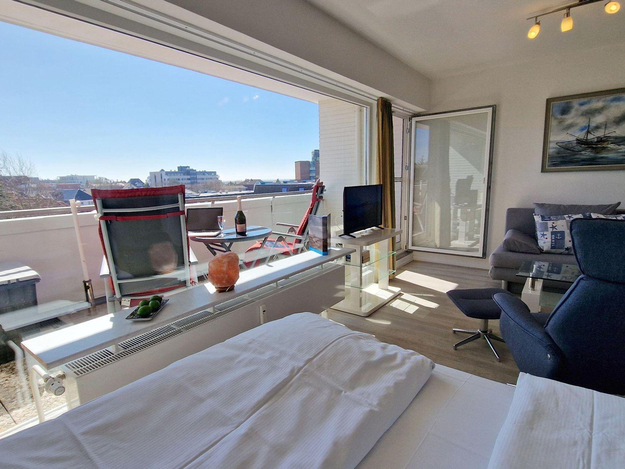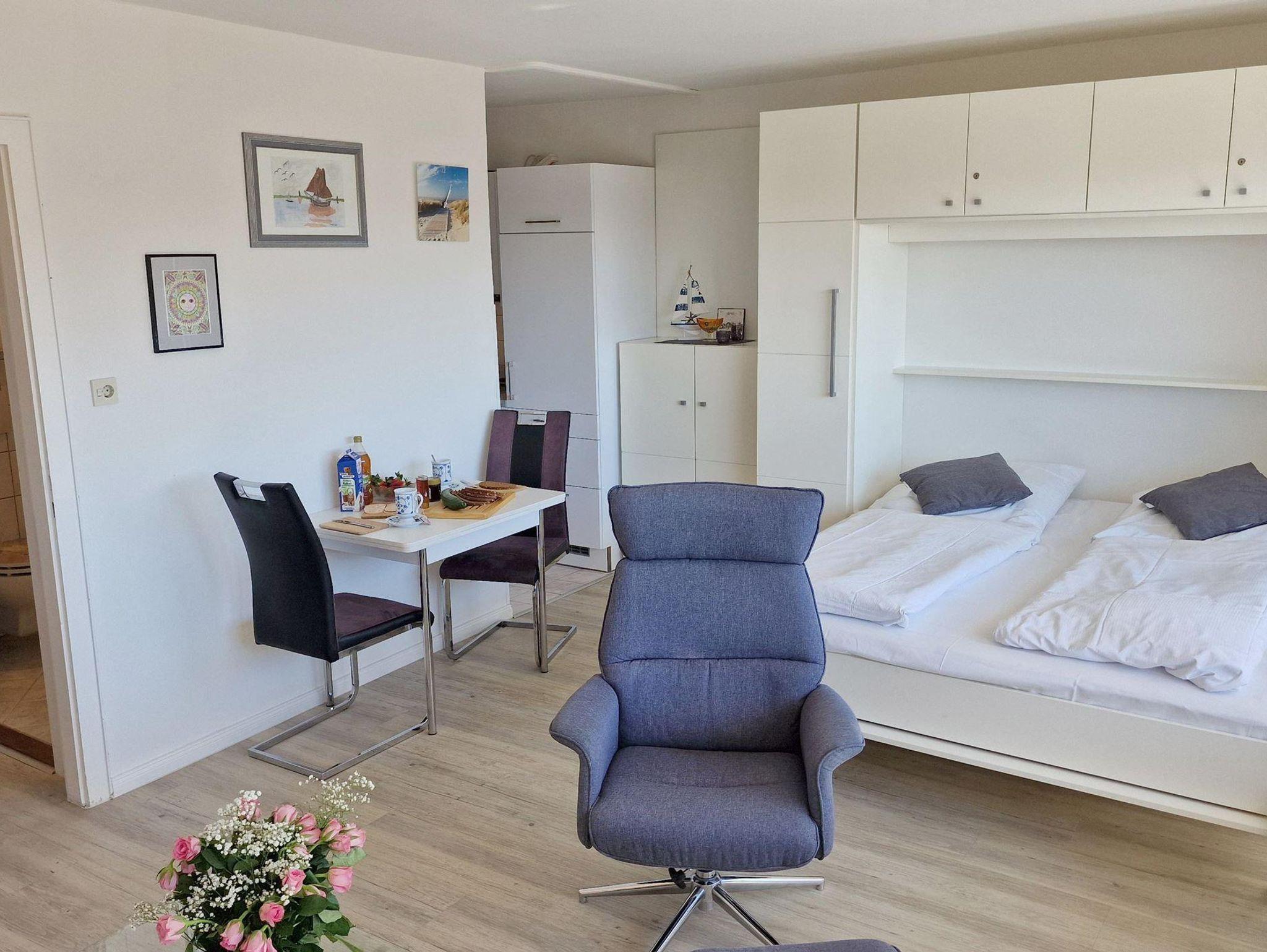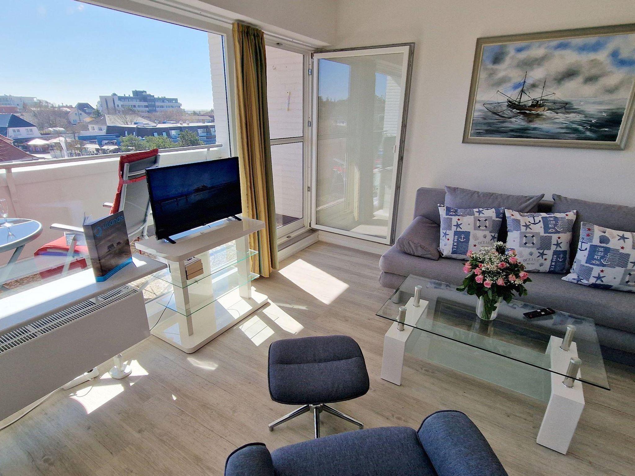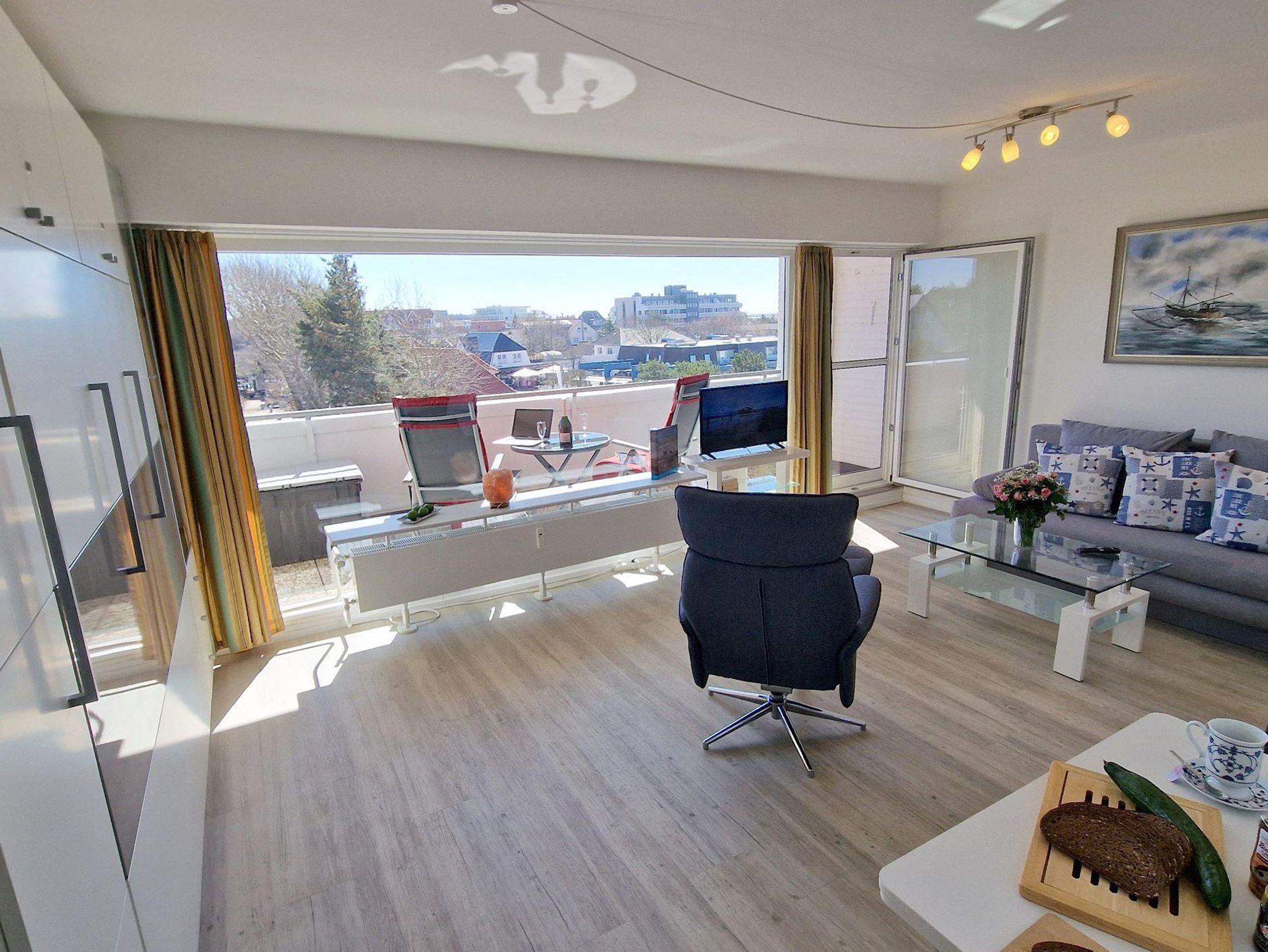 Das helle Wohn-Esszimmer mit offener Küchenzeile lädt zum Entspannen ein und bietet direkten Zugang zu einem Balkon, auf dem Sie die frische Luft genießen können. Ein modernes Duschbad sorgt für zusätzlichen Komfort während Ihres Aufenthalts.
