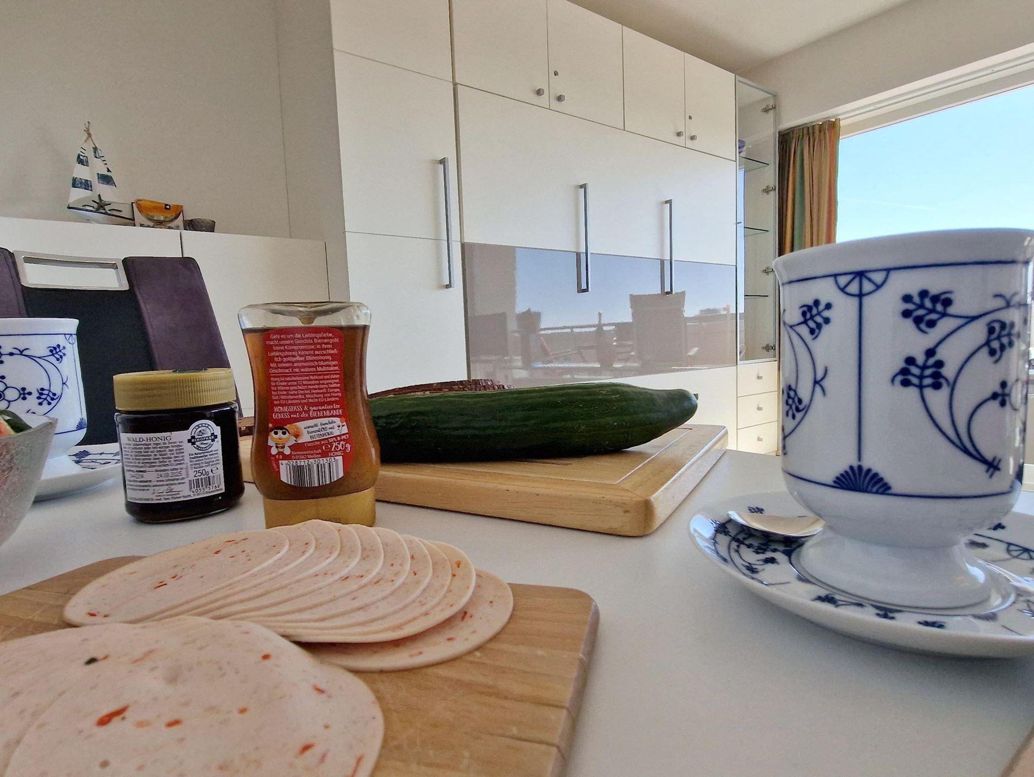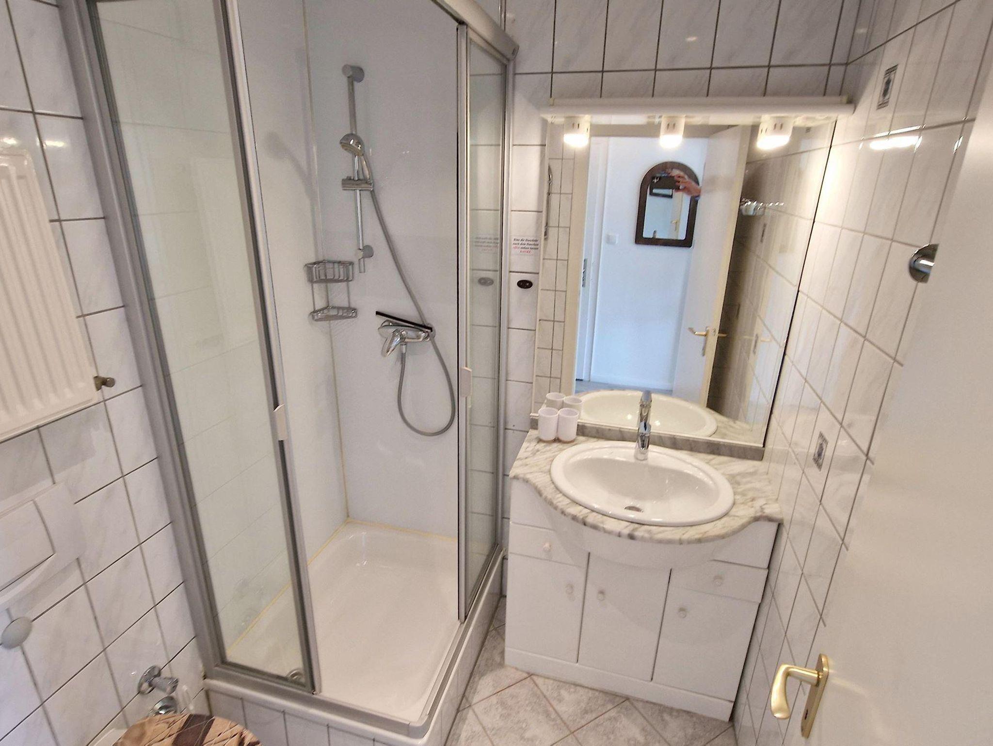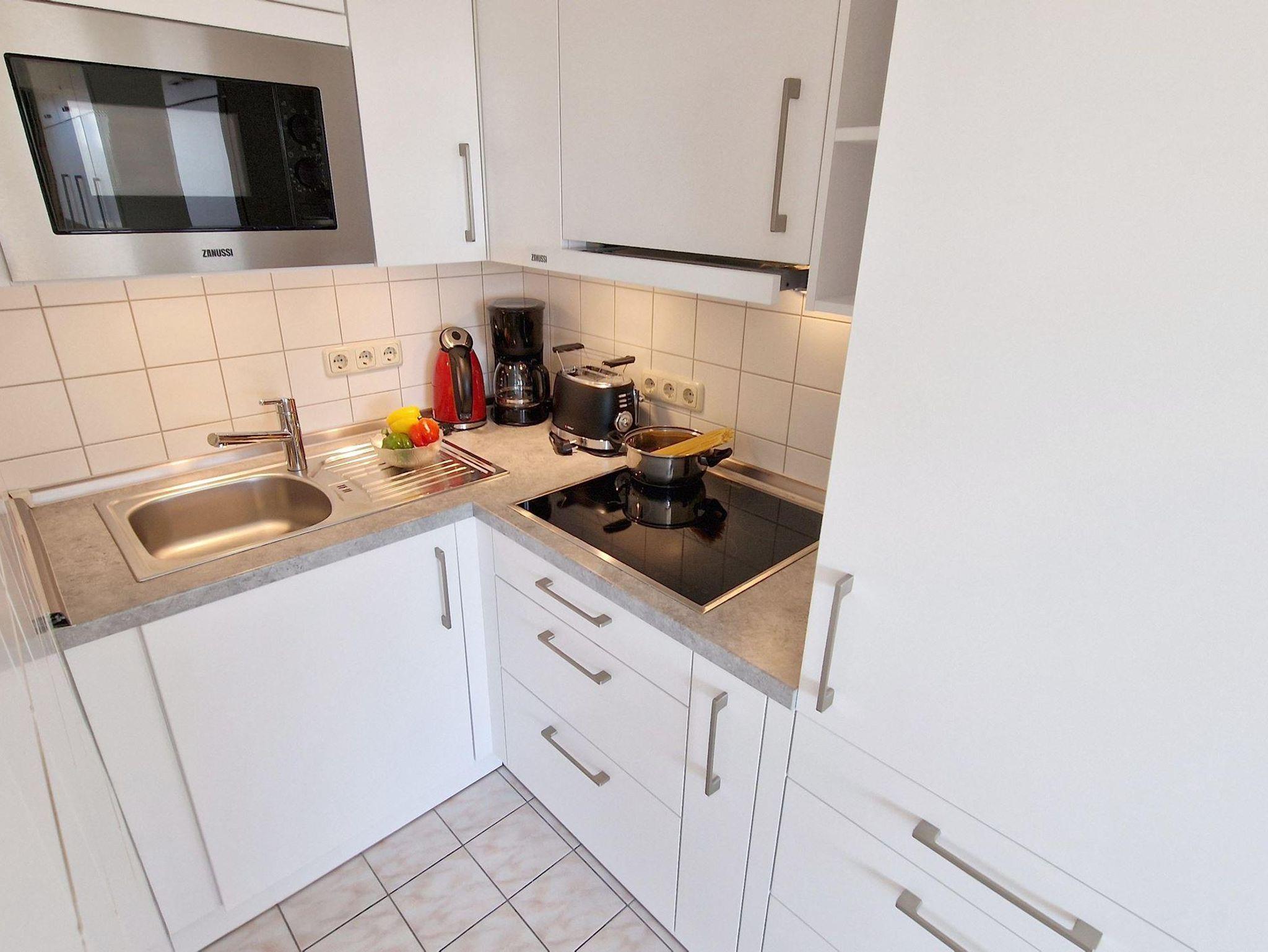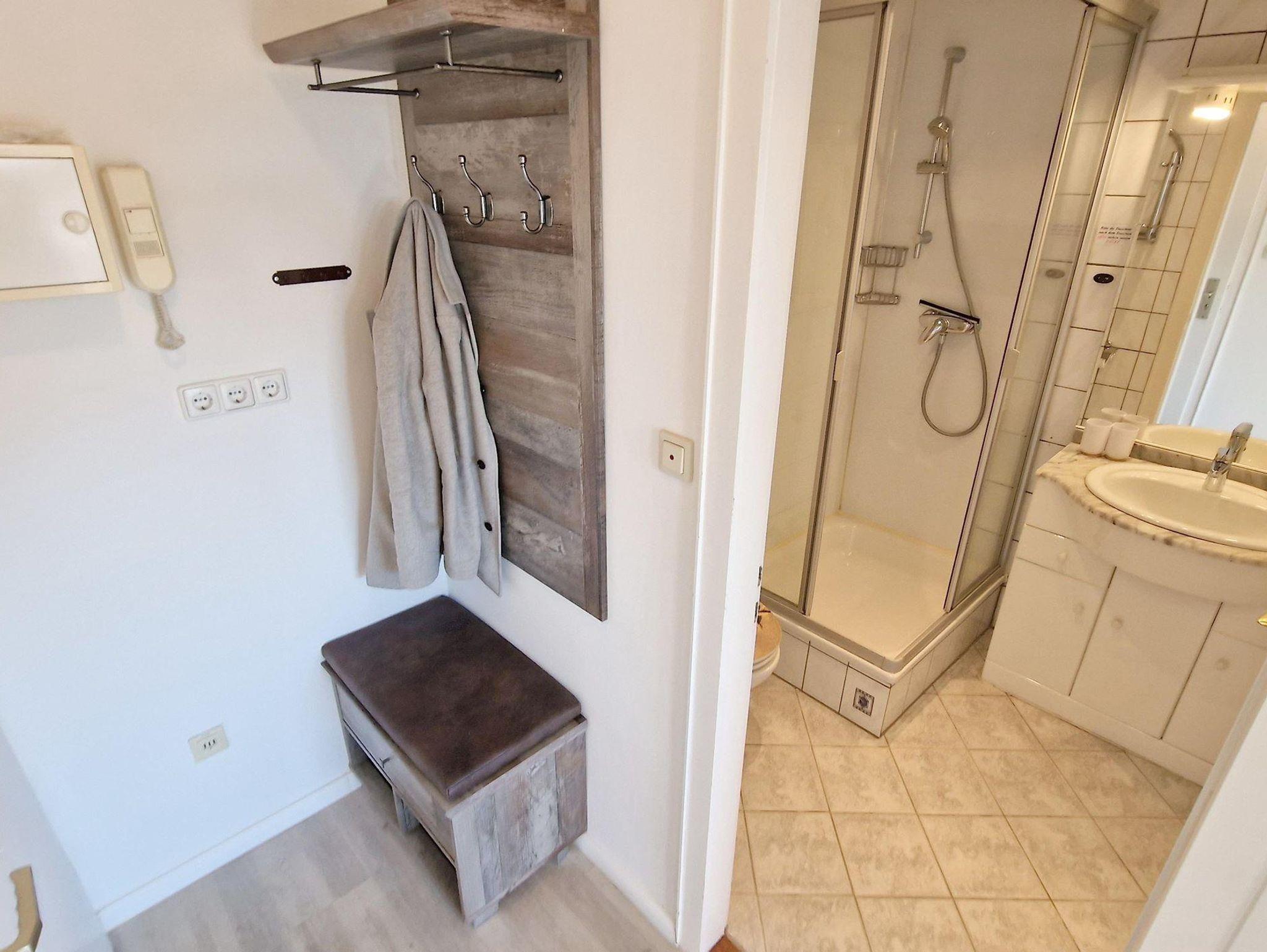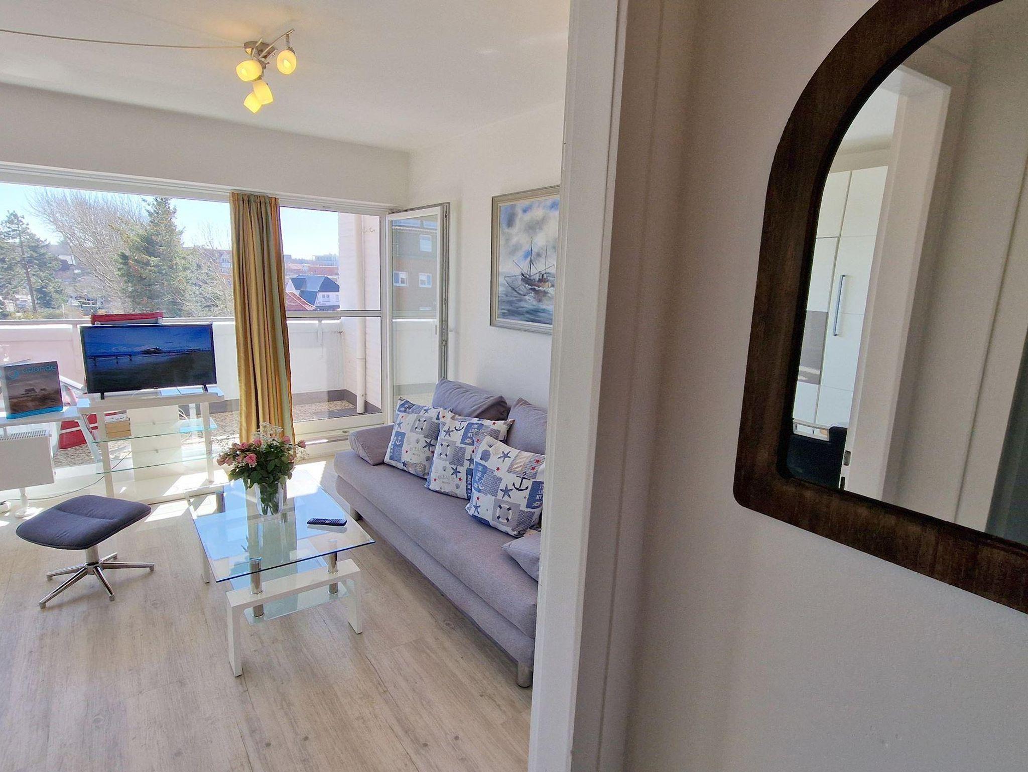 Das helle Wohn-Esszimmer mit offener Küchenzeile lädt zum Entspannen ein und bietet direkten Zugang zu einem Balkon, auf dem Sie die frische Luft genießen können. Ein modernes Duschbad sorgt für zusätzlichen Komfort während Ihres Aufenthalts.